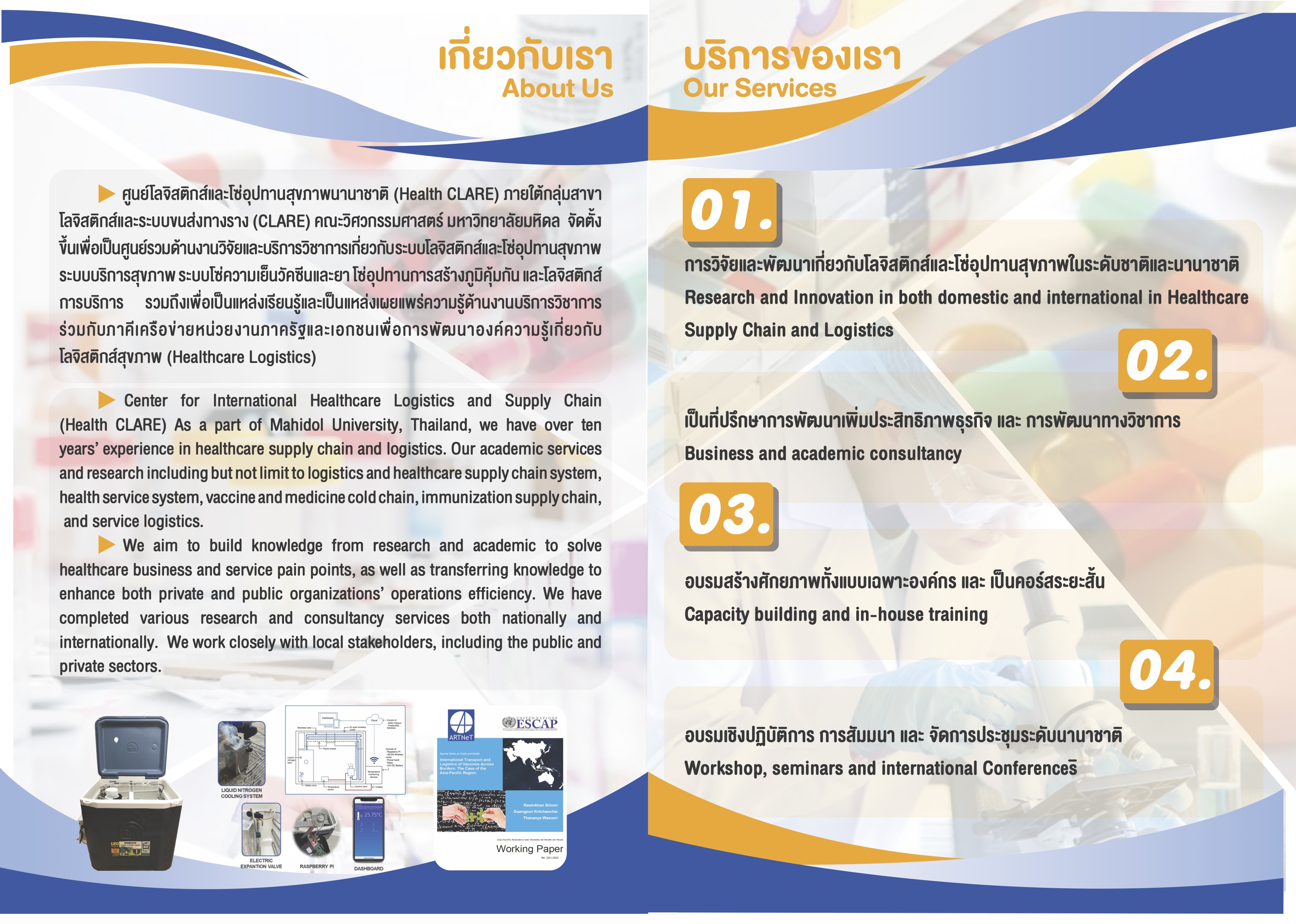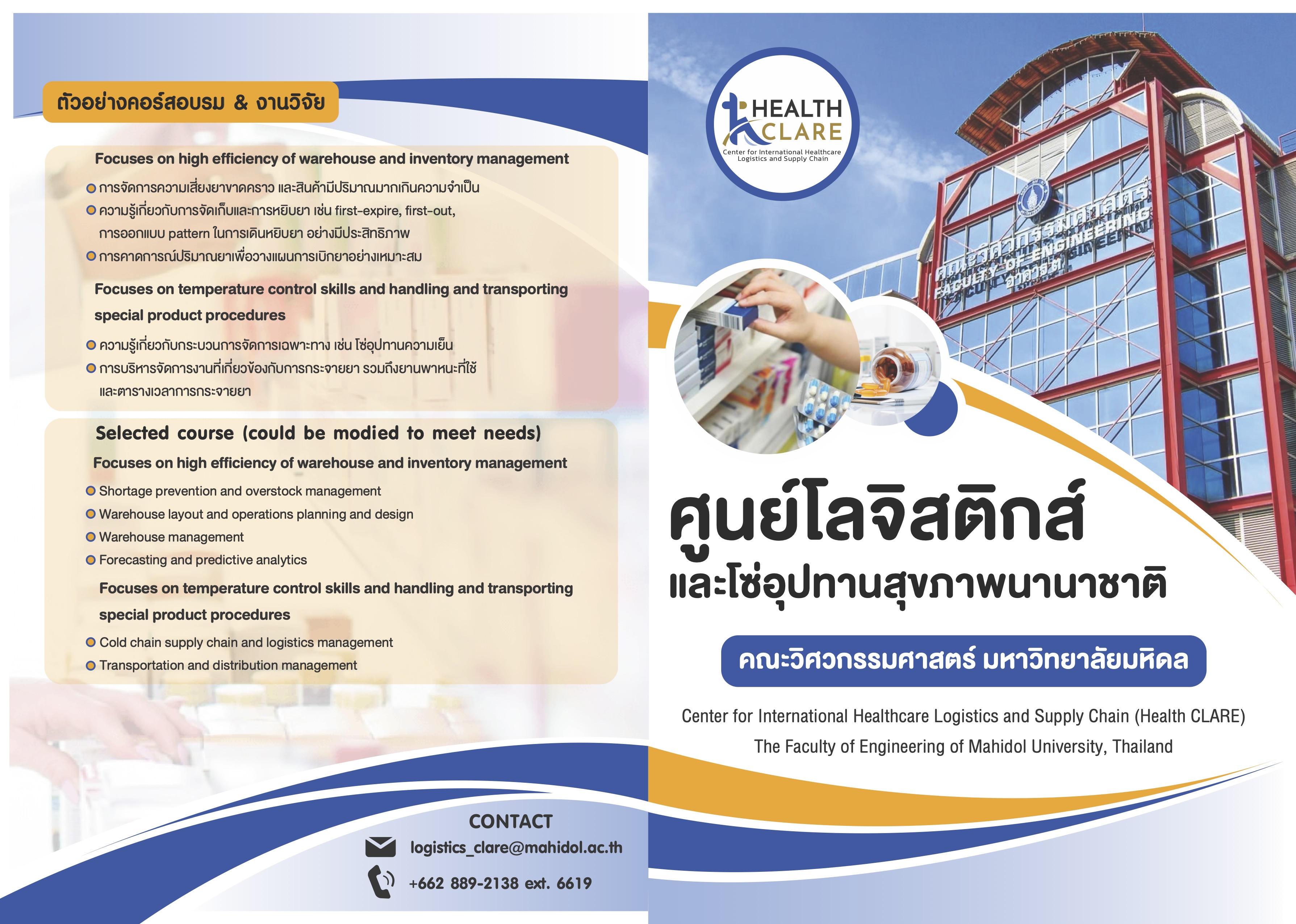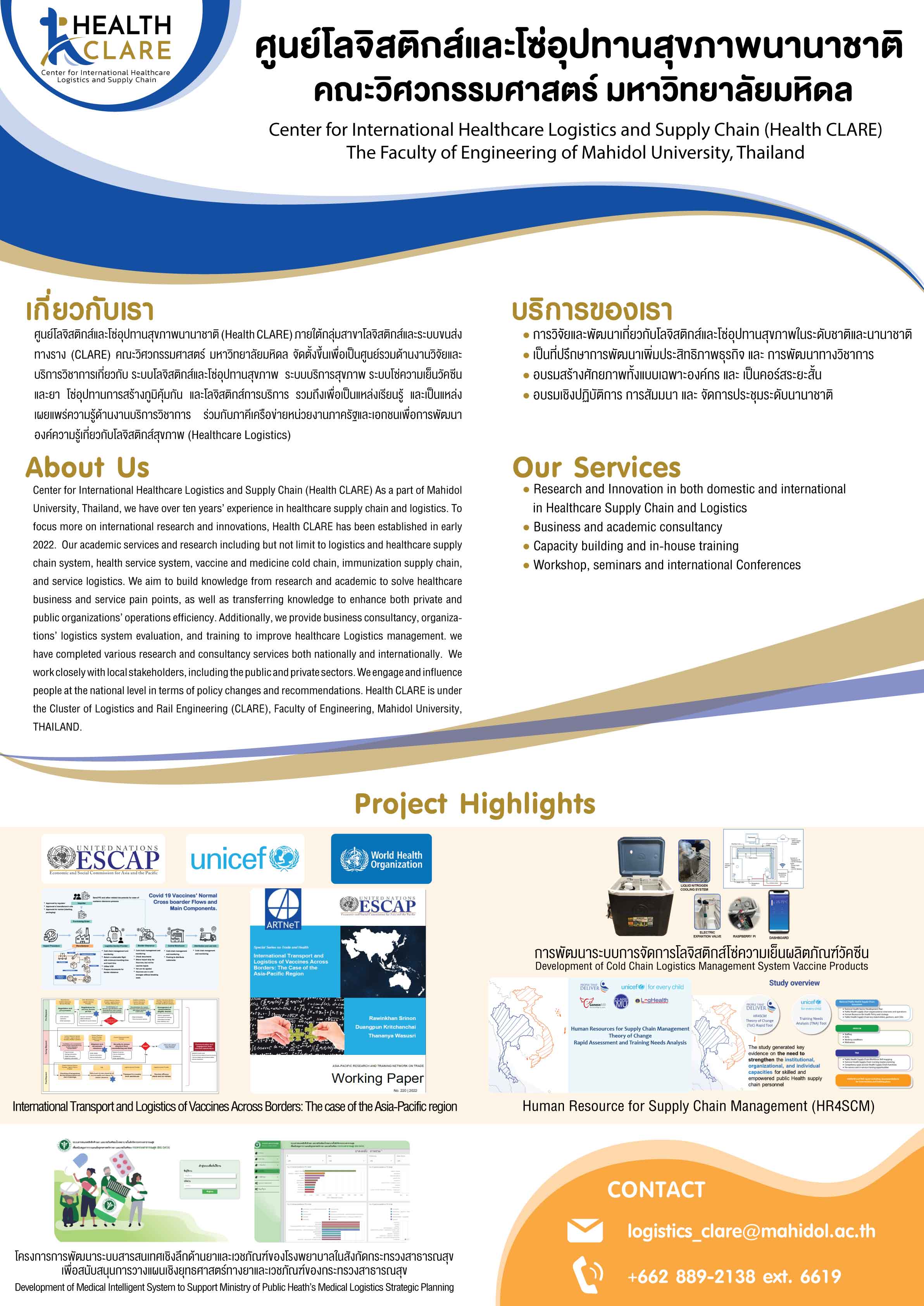 The International Health Logistics and Supply Chain Center (Health CLARE), under the Logistics and Rail Transportation Systems (CLARE) group, Faculty of Engineering, Mahidol University, was established as a hub for research and academic services related to: