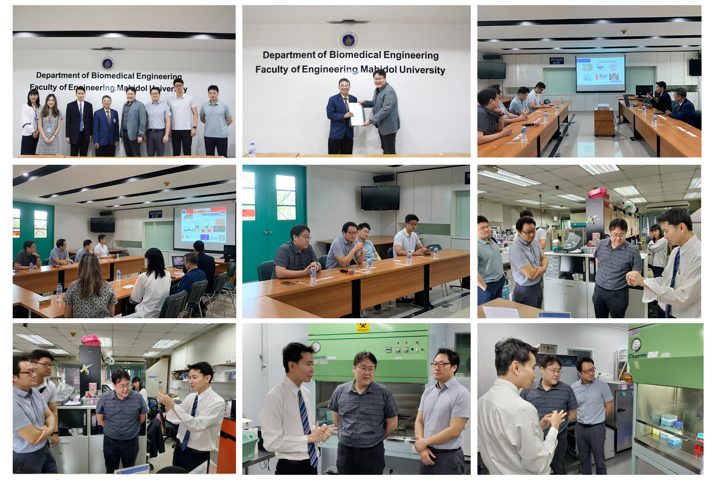 วันที่8 มิถุนายน 2559 : ภาควิชาวิศวกรรมชีวการแพทย์ คณะวิศวกรรมศาสตร์ มหาวิทยาลัยมหิดล ต้อนรับคณะเยี่ยมชมกองควบคุมเครื่องมือแพทย์ สำนักงานคณะกรรมการอาหารและยา ในโครงการสำรวจและพัฒนาห้องปฏิบัติการทดสอบด้านเครื่องมือแพทย์เพื่อรองรับการดูแลและพัฒนาอุตสาหกรรมด้านเครื่องมือแพทย์ของไทย ทั้งนี้ได้มีการประชุมปรึกษาหารือความร่วมมือด้านต่างๆ รวมถึงเยี่ยมชมห้องปฏิบัติการวิจัยและห้อง Clean room ของภาควิชา