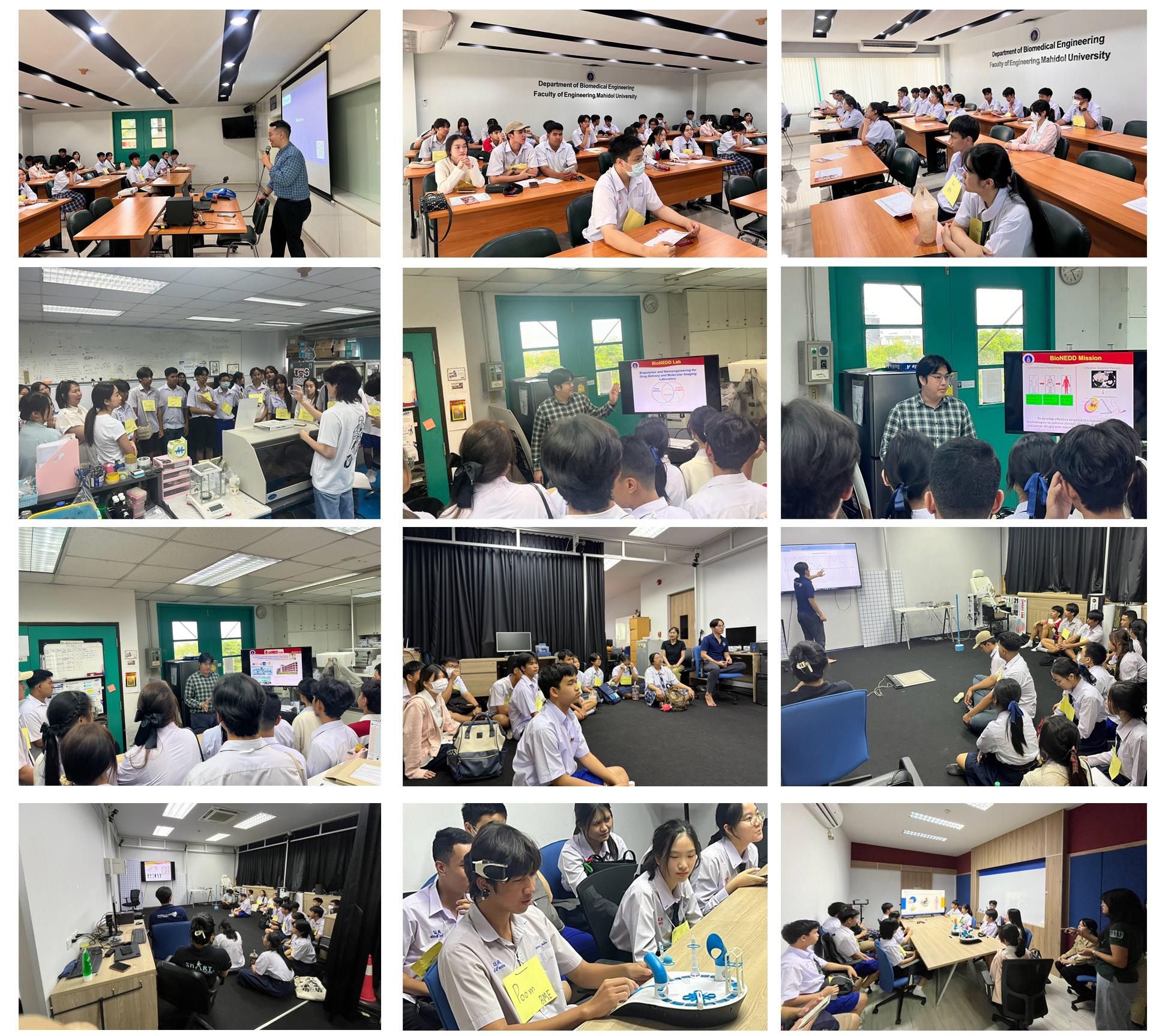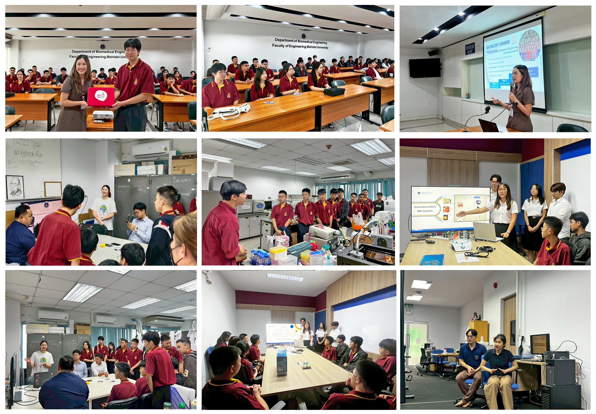 วันที่ 17 มิถุนายน 2568 ภาควิชาวิศวกรรมชีวการแพทย์ โดย อาจารย์ ดร.ชลัยย์ศร ธนพงษ์พิบูล ให้การต้อนรับนักเรียนโรงเรียนสาธิตนานาชาติ มหาวิทยาลัยมหิดล เพื่อให้นักเรียนได้ค้นพบตนเองและเปิดวิสัยทัศน์ สร้างแรงบันดาลใจในการเลือกตัดสินใจในการศึกษาต่อระดับอุดมศึกษา รวมถึงได้เรียนรู้ในการพัฒนานวัตกรรมทางการแพทย์ พร้อมทั้ง เยี่ยมชมห้องปฏิบัติการภาควิชาวิศวกรรมชีวการแพทย์ ได้แก่ - ศูนย์เครือข่ายวิจัยประยุกต์ทางเทคโนโลยีหุ่นยนต์ และชีวการแพทย์ (BART LAB) - ห้องปฎิบัติการการเชื่อมต่อสัญญาณสมองด้วยคอมพิวเตอร์ (BCI LAB) - ห้องปฎิบัติการชีวพอลิเมอร์และวิศวกรรมระดับนาโนเพื่อพัฒนาระบบส่งยาและการสร้างภาพทางการแพทย์ (BioNEDD LAB) -Biosensors Laboratory