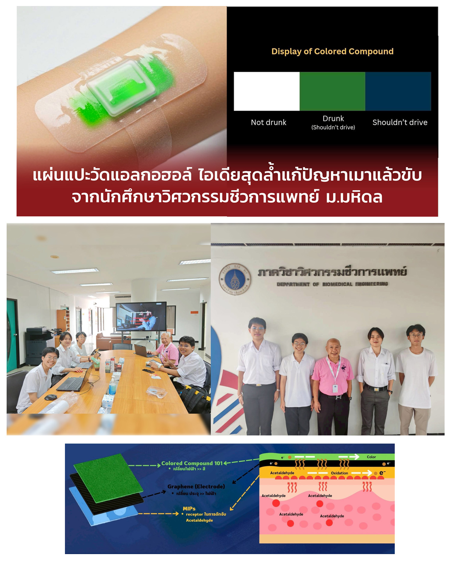 นักศึกษาชั้นปีที่ 1 จากภาควิชาวิศวกรรมชีวการแพทย์ หลักสูตรนานาชาติ คณะวิศวกรรมศาสตร์ มหาวิทยาลัยมหิดล สร้างชื่อเสียงคว้ารางวัลชนะเลิศจากการประกวดไอเดียนวัตกรรมการแพทย์ระดับประเทศ กับผลงานสุดสร้างสรรค์ “Drunk Check Patch” แผ่นตรวจวัดระดับแอลกอฮอล์ผ่านผิวหนัง โดยอาศัยการตรวจจับสารอะซีตัลดีไฮด์ (Acetaldehyde) ซึ่งเป็นผลพลอยได้ในร่างกายหลังจากการดื่มแอลกอฮอล์ โดยโครงการนี้จัดโดยสำนักงานพัฒนาวิทยาศาสตร์และเทคโนโลยีแห่งชาติ (สวทช.) สมาชิกในทีมประกอบด้วย นางสาวนันทิชา ทรัพย์มูล นายศุภกฤต ปรุงสำราญกิจ นายกฤษกร บุญวงศ์ และนายพชรกันต์ ฟองอนันตรัตน์ โดยมีอาจารย์ที่ปรึกษาคือ ผู้ช่วยศาสตราจารย์ ดร.จำรัส พร้อมมาศ และ รองศาสตราจารย์ ดร.เบญจพร เลิศอนันตวงศ์ แนวคิดของแผ่นแปะวัดแอลกอฮอล์นี้ เกิดขึ้นจากการประชุมออนไลน์ของกลุ่มนักศึกษาก่อนจะพัฒนาสู่แบบจำลองจริงที่มีศักยภาพในการต่อยอดใช้งานจริงในอนาคต โดยอาศัยปฏิกิริยาเคมีระหว่างสารอะซีตัลดีไฮด์กับวัสดุพอลิเมอร์ชนิดพิเศษ (Molecular Imprinted Polymer - MIP) ซึ่งฝังแผ่นกราฟีนอยู่ภายใน ทำให้สามารถเปลี่ยนสีได้ตามระดับแอลกอฮอล์ในร่างกาย ได้แก่ สีขาวเมื่อไม่มีแอลกอฮอล์ สีเขียวเมื่อมีระดับที่ไม่ปลอดภัยในการขับขี่ และสีน้ำเงินเมื่อพบปริมาณสูงมาก ถือเป็นการพัฒนาต่อยอดจากอุปกรณ์วัดแอลกอฮอล์รุ่นแรกที่เปลี่ยนเพียงสีเดียว ความสำเร็จของนักศึกษากลุ่มนี้ ไม่เพียงสะท้อนความสามารถของนักศึกษาเท่านั้น แต่ยังแสดงให้เห็นถึงวิสัยทัศน์ของคณะวิศวกรรมศาสตร์ มหาวิทยาลัยมหิดล ที่ส่งเสริมการเรียนรู้จากการลงมือทำจริง พร้อมปลูกฝังแนวคิดนวัตกรรมและการวิจัยตั้งแต่ระดับเริ่มต้น เพื่อเตรียมความพร้อมให้บัณฑิตก้าวขึ้นเป็นผู้นำด้านเทคโนโลยีการแพทย์ และพัฒนาแนวทางแก้ปัญหาด้านสุขภาพอย่างยั่งยืนในอนาคต