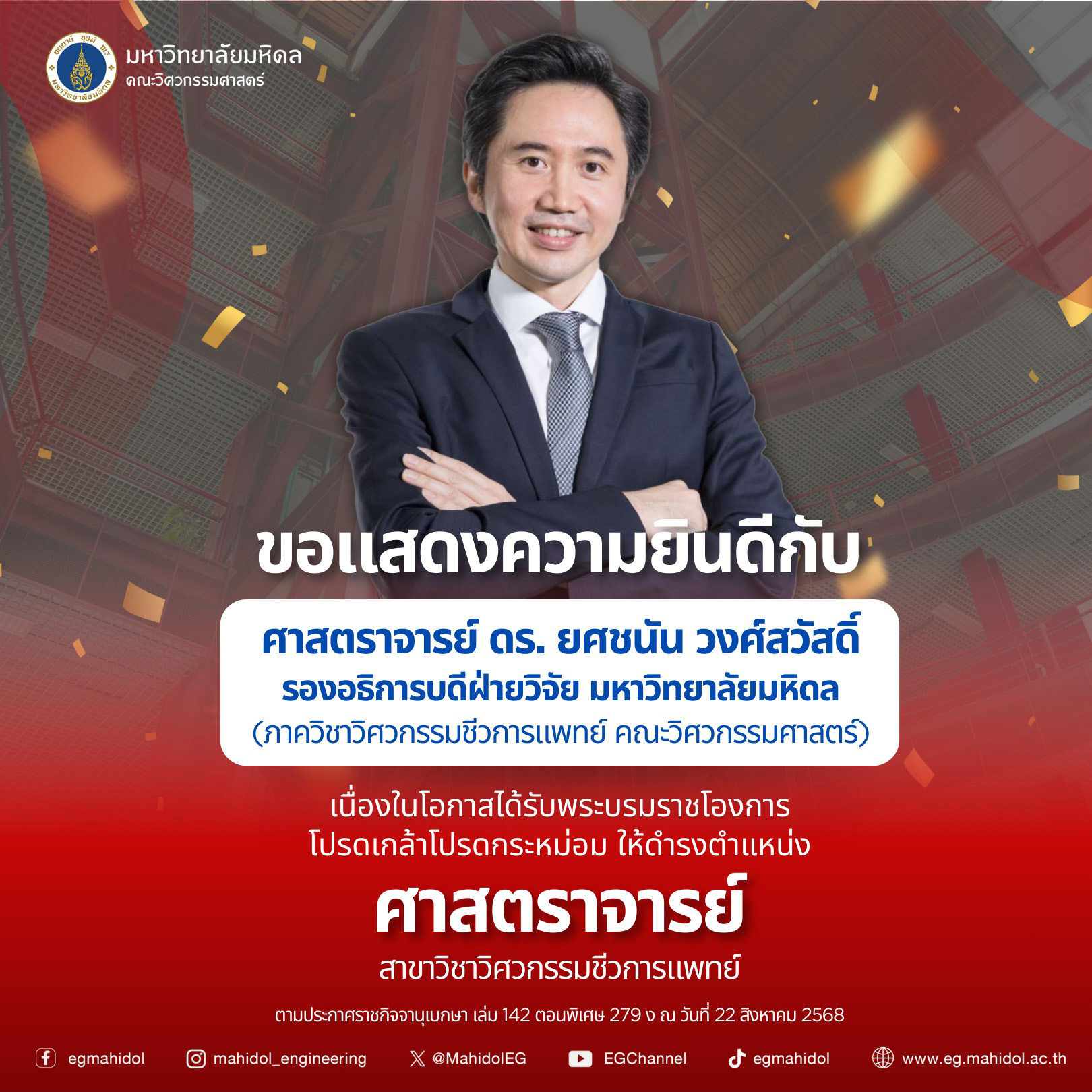 ภาควิชาวิศวกรรมชีวการแพทย์ คณะวิศวกรรมศาสตร์ มหาวิทยาลัยมหิดล ขอแสดงความยินดีกับศาสตราจารย์ ดร. ยศชนัน วงศ์สวัสดิ์ รองอธิการบดีฝ่ายวิจัย มหาวิทยาลัยมหิดล (ภาควิชาวิศวกรรมชีวการแพทย์ คณะวิศวกรรมศาสตร์)
