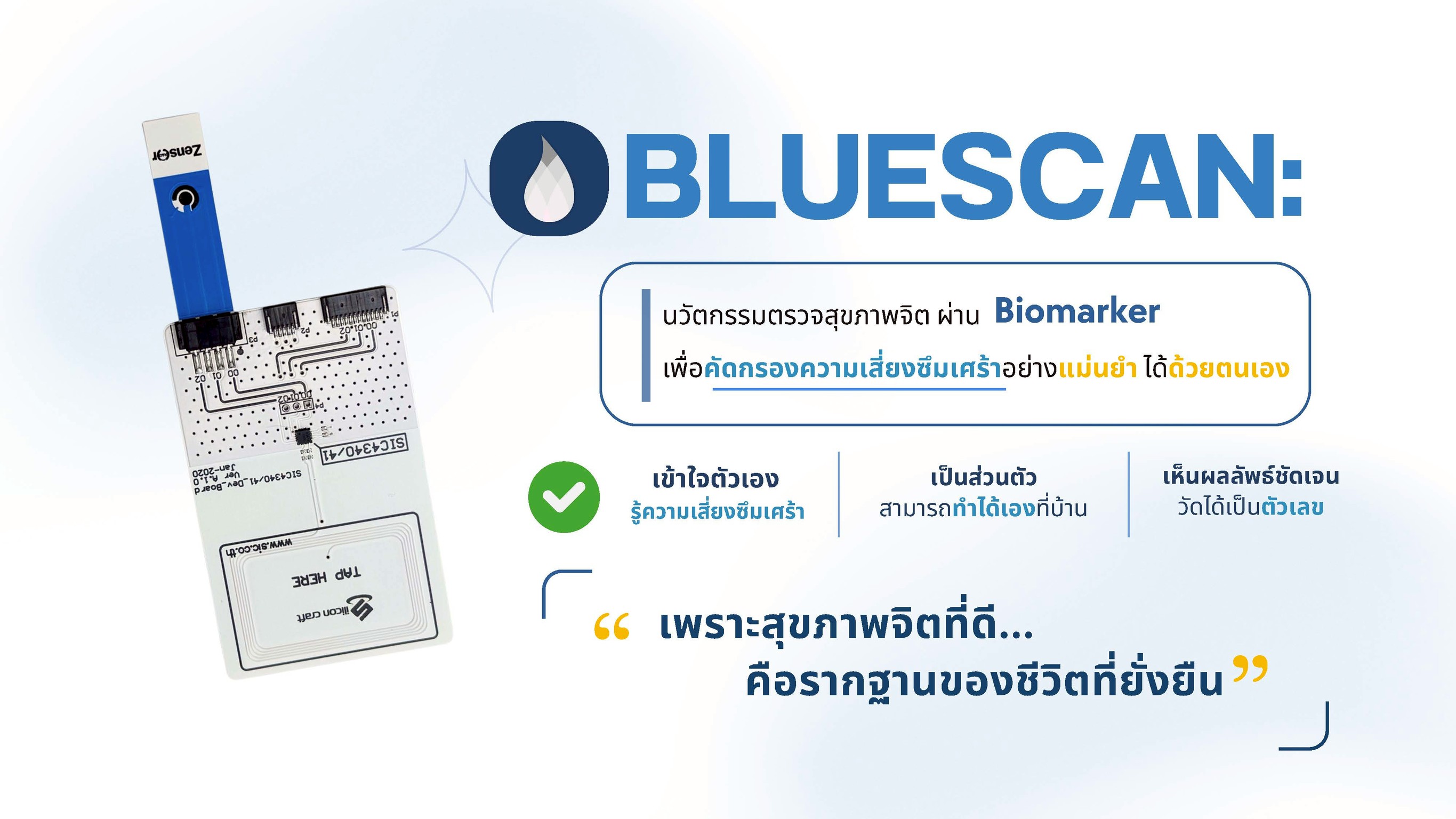 BLUESCAN PROJECT สร้างสรรค์แนวคิดโดย นางสาวดาวินทร์ธีร์ หาญมนตรี นักศึกษาจากภาควิชาวิศวกรรมอุตสาหการ ชั้นปีที่ 2 คณะวิศวกรรมศาสตร์ มหาวิทยาลัยมหิดล ร่วมกับนักศึกษาจากสถาบันต่าง ๆ คือ นายกชพงศ์ กลิ่นขจร นักศึกษาชั้นปีที่ 2 จุฬาลงกรณ์มหาวิทยาลัย นายกฤษณบดินทร์ เหล็มสะ นักศึกษาชั้นปีที่ 1 มหาวิทยาลัยธรรมศาสตร์ นางสาวชนัญชิดา พุ่มโพธิ์ศรี นักเรียนระดับมัธยมศึกษาปีที่ 6 โรงเรียนมารีวิทย์พัทยา นางสาวแพรวา สมนึก นักเรียนระดับมัธยมศึกษาปีที่ 6 โรงเรียนสารสาสน์เอกตรา นางสาวนรมน วนาธนสุวรรณ นักเรียนระดับมัธยมศึกษาปีที่ 4 โรงเรียนดรุณสิกขาลัย และ นางสาวธัญญาภา แก่นนาค นักเรียนระดับมัธยมศึกษาปีที่ 6 โรงเรียนสระบุรีวิทยาคม ซึ่งทุกคนได้ทุ่มเทแรงกายแรงใจเพื่อพัฒนาแนวคิดและสร้างนวัตกรรมให้ตอบโจทย์ปัญหาสุขภาพจิตของสังคมในปัจจุบัน