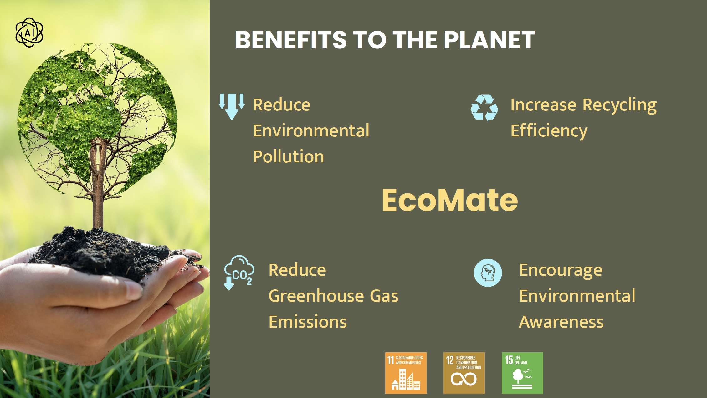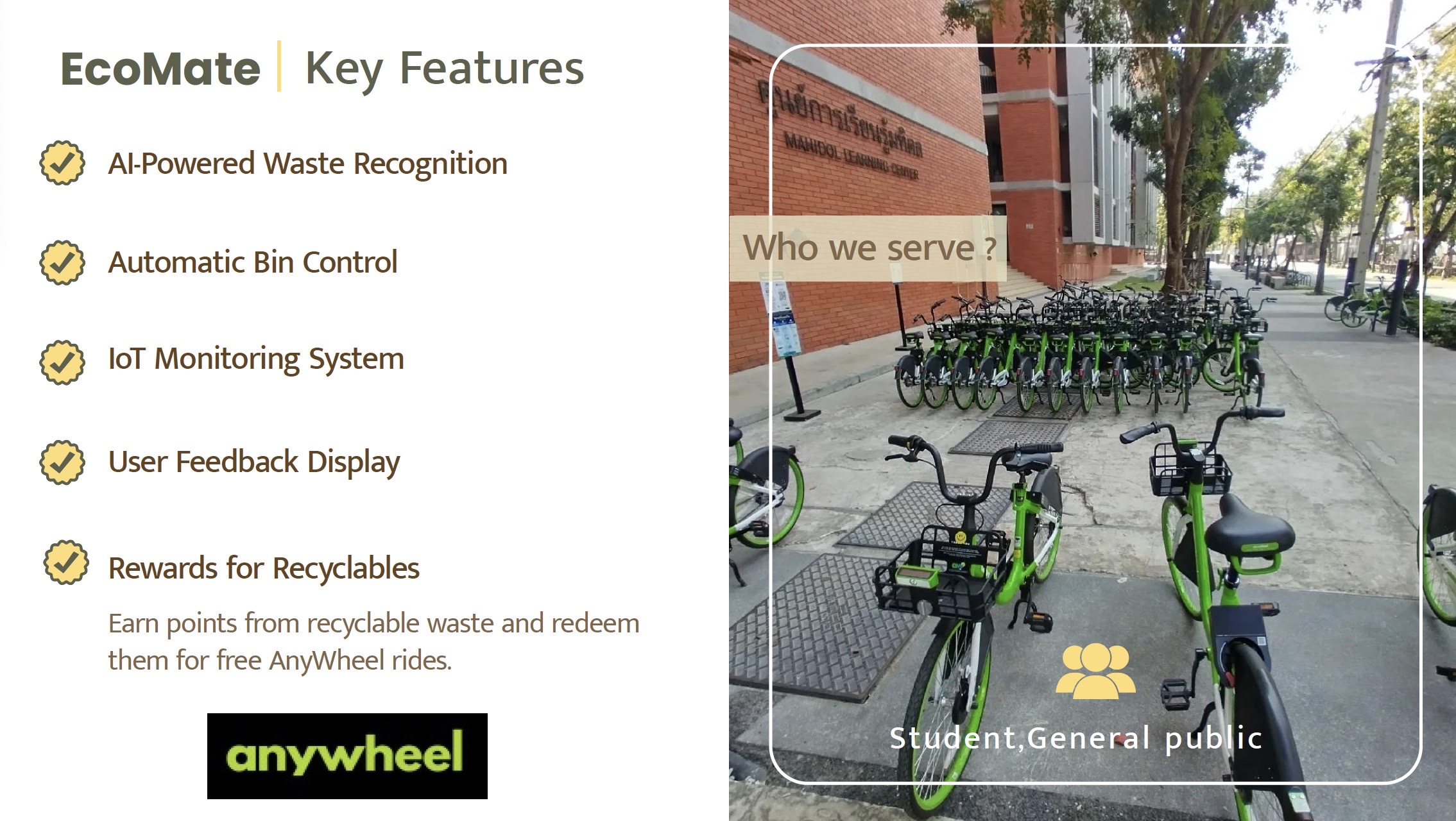 ผลงานของทีม EcoMate มีจุดเด่นในการนำเทคโนโลยี AI และ IoT มาประยุกต์ใช้ในการจัดการขยะอัจฉริยะ ตั้งแต่ระบบจดจำขยะอัตโนมัติ ระบบเปิด–ปิดถังขยะด้วยตัวเอง ระบบแสดงผลตอบกลับเพื่อให้ผู้ใช้เรียนรู้ ไปจนถึงแนวคิดการให้รางวัลสะสมจากการทิ้งขยะรีไซเคิล เพื่อนำไปแลกสิทธิ์การใช้บริการต่าง ๆ เช่น การปั่นจักรยาน Anywheel สะท้อนมุมมองการออกแบบที่เชื่อมโยงระหว่างเทคโนโลยี พฤติกรรมมนุษย์ และการสร้างแรงจูงใจเชิงบวก
