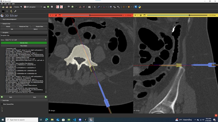 การทดสอบในปัจจุบันทำบนโมเดลจำลองรูปร่างกระดูกสันหลังจากซิลิโคนที่พิมพ์ด้วย 3D printer ซึ่งสามารถเลียนแบบลักษณะเนื้อเยื่อจริง ช่วยให้สามารถฝึกผ่าตัด วางแผนการรักษา และให้คนไข้เข้าใจขั้นตอนการรักษาได้ชัดเจนมากขึ้น โครงการนี้สามารถผ่าตัดได้สูงสุด 3 ข้อกระดูก โดยมีความแม่นยำในระดับที่เป็นที่ยอมรับในวงการแพทย์ และในอนาคตจะมีการทดสอบเพิ่มเติมในร่างอาจารย์ใหญ่ พร้อมพัฒนาระบบให้รองรับการใช้ภาพจากฟลูโอโรสโคป เพื่อให้ได้ตำแหน่งแบบเรียลไทม์ในขณะผ่าตัดจริง