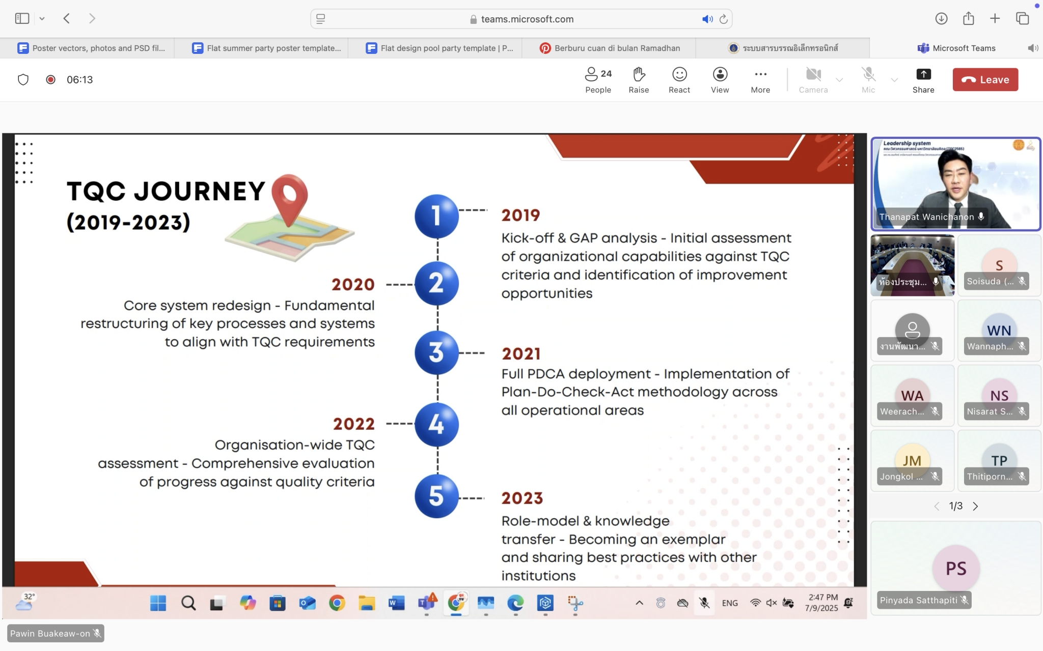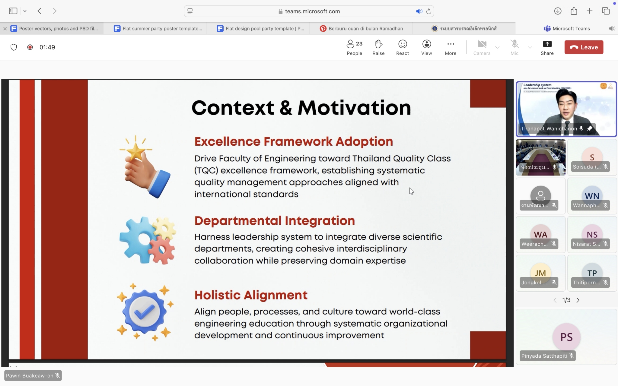 กิจกรรมในครั้งนี้จัดขึ้นเพื่อแลกเปลี่ยนองค์ความรู้ด้านการพัฒนาองค์กรด้วยระบบ Leadership System ตามแนวทาง TQC (Thailand Quality Class) และ EdPEx (Education Criteria for Performance Excellence) ซึ่งจัดขึ้นโดย มหาวิทยาลัยธรรมศาสตร์ มีผู้เข้าร่วมจากหลากหลายมหาวิทยาลัย อาทิ มหาวิทยาลัยศิลปากร มหาวิทยาลัยขอนแก่น และมหาวิทยาลัยมหิดล โดย รองศาสตราจารย์ ดร.ธนภัทร์ วานิชานนท์ ได้ถ่ายทอดประสบการณ์จริงในการขับเคลื่อนคณะวิศวกรรมศาสตร์ มหาวิทยาลัยมหิดล ให้เป็นองค์กรต้นแบบด้านการบริหารจัดการคุณภาพ โดยเฉพาะการนำระบบ Leadership System เข้ามาใช้ในการพัฒนากลยุทธ์องค์กร การจัดการนวัตกรรม และการวางรากฐานวัฒนธรรมองค์กร เพื่อมุ่งสู่ความเป็นเลิศทางวิชาการ การบริการ และการสร้างผลกระทบเชิงบวกต่อสังคม ซึ่งในหัวข้อดังกล่าวฯ นั้นยังได้รับเกียรติจากมหาวิทยาลัยอื่น ๆ อีก อาทิ มหาวิทยาลัยศิลปากร โดย ศาสตราจารย์ ดร.ภก.ธนะเศรษฐ์ ง้าวหิรัญพัฒน์ อธิการบดีมหาวิทยาลัยศิลปากร รองศาสตราจารย์ ดร.สุชาดา พิริยะประสาธน์ รองอธิการบดีฝ่ายพัฒนาคุณภาพองค์กร ผู้ช่วยศาสตราจารย์ ดร.พีรยศ ภมรศิลปธรรม ผู้ช่วยอธิการบดีฝ่ายพัฒนาบุคลากร อาจารย์ ดร.นุกูล แดงภูมี ผู้ช่วยอธิการบดีฝ่ายพัฒนาคุณภาพองค์กร และ มหาวิทยาลัยขอนแก่น โดย ผู้ช่วยศาสตราจารย์ ดร.บุรินทร์ เปล่งดีสกุล คณบดีคณะศิลปกรรมศาสตร์ หลังจากการบรรยายพิเศษแล้วมีการเสวนาและแลกเปลี่ยนเรียนรู้ภาวะการนำองค์กร (Leadership System) ของผู้บริหารรตามแต่ละพันธกิจ ร่วมกันระหว่าง ม.ธรรมศาสตร์ ม.ศิลปากร ม.มหิดล และ ม.ขอนแก่น อีกด้วย
