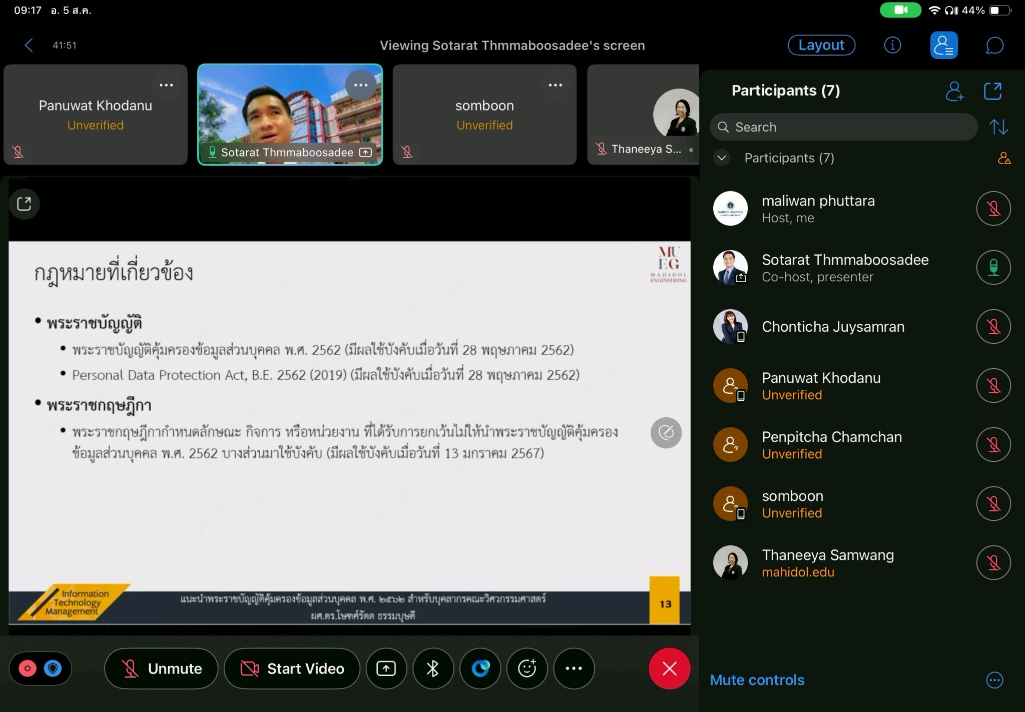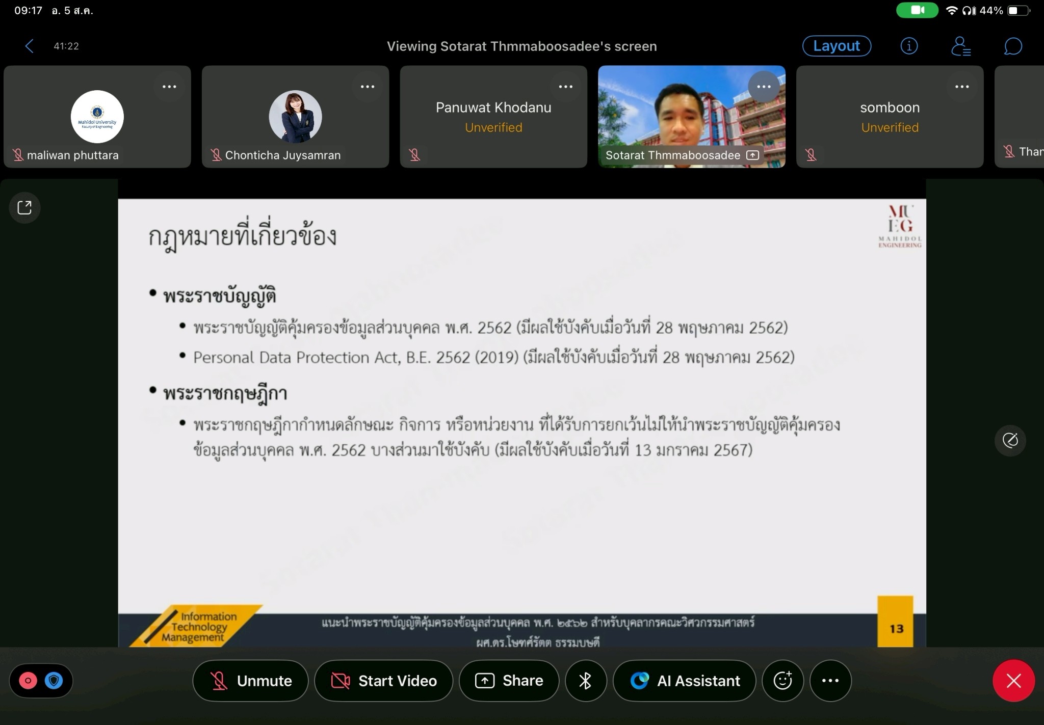คณะกรรมการประสานงานด้านข้อมูลส่วนบุคคล คณะวิศวกรรมศาสตร์ มหาวิทยาลัยมหิดล จัดการอบรมให้ความรู้ด้านการคุ้มครองข้อมูลส่วนบุคคล (PDPA) แก่บุคลากรและนักศึกษาภายในคณะฯ เมื่อวันที่ 4–5 และ 7 สิงหาคม 2568 ณ ห้องประชุมผู้ช่วยศาสตราจารย์คณิต สงวนตระกูล ชั้น 1 อาคาร 1 คณะวิศวกรรมศาสตร์ โดยมี ผู้ช่วยศาสตราจารย์ ดร.โษฑศ์รัตต ธรรมบุษดี ผู้ช่วยคณบดีด้านการเปลี่ยนแปลงทางดิจิทัลขององค์กร เป็นวิทยากรในรูปแบบ Hybrid ทั้งออนไลน์และออนไซต์