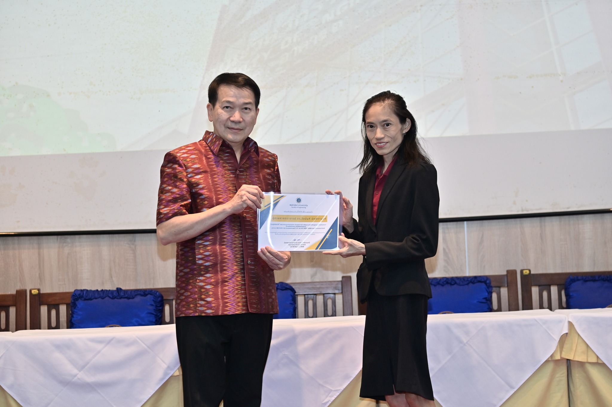 วันที่ 29 สิงหาคม 2568 คณะวิศวกรรมศาสตร์ มหาวิทยาลัยมหิดล จัดงานเฉลิมฉลองครบรอบ 35 ปี แห่งการสถาปนาคณะวิศวกรรมศาสตร์ โดยมี รองศาสตราจารย์ ดร.ธนภัทร์ วานิชานนท์ คณบดีคณะวิศวกรรมศาสตร์ พร้อมด้วยคณะผู้บริหารและบุคลากร ร่วมให้การต้อนรับอธิการบดี คณบดี ผู้บริหาร และผู้แทนจากส่วนงานต่าง ๆ ของมหาวิทยาลัยมหิดล ที่มาร่วมแสดงความยินดี ในโอกาสครบรอบ 35 ปี แห่งการสถาปนาคณะวิศวกรรมศาสตร์ มหาวิทยาลัยมหิดล ณ ห้อง R-6450 (ตึกแดง) อาคาร 3 คณะวิศวกรรมศาสตร์ มหาวิทยาลัยมหิดล