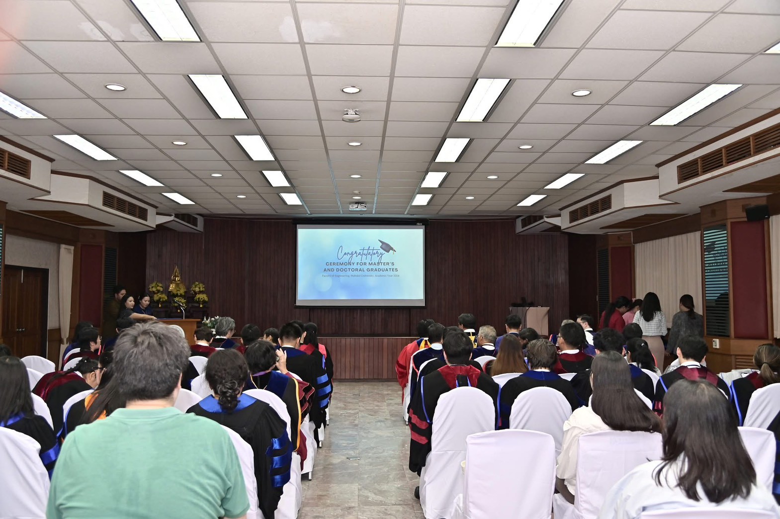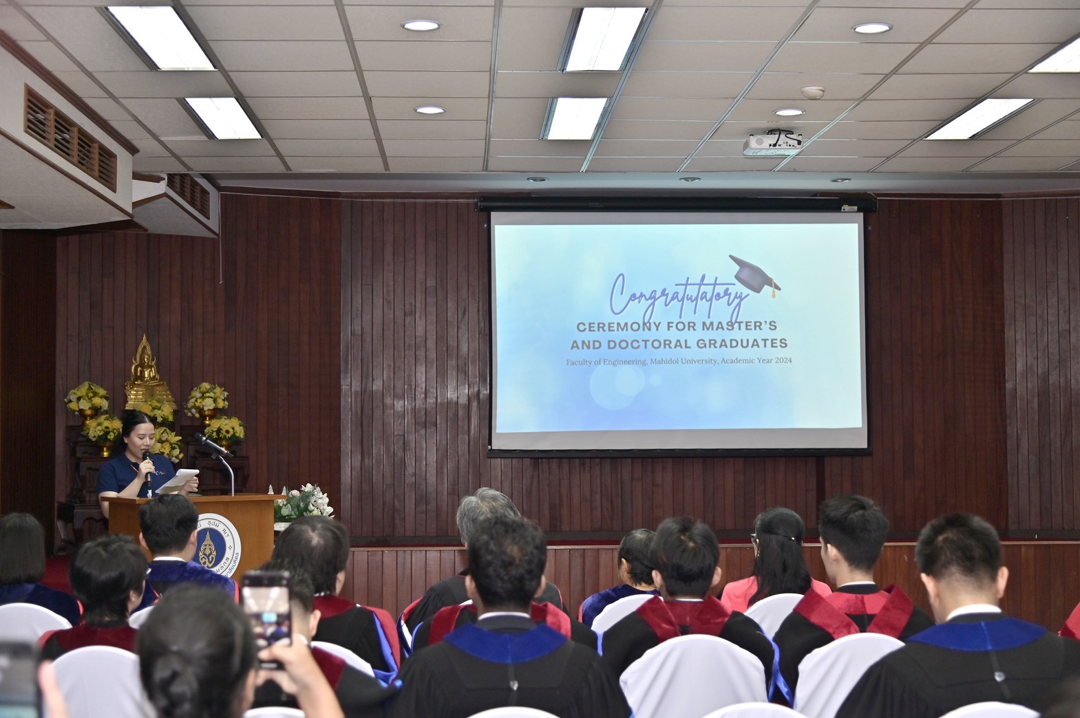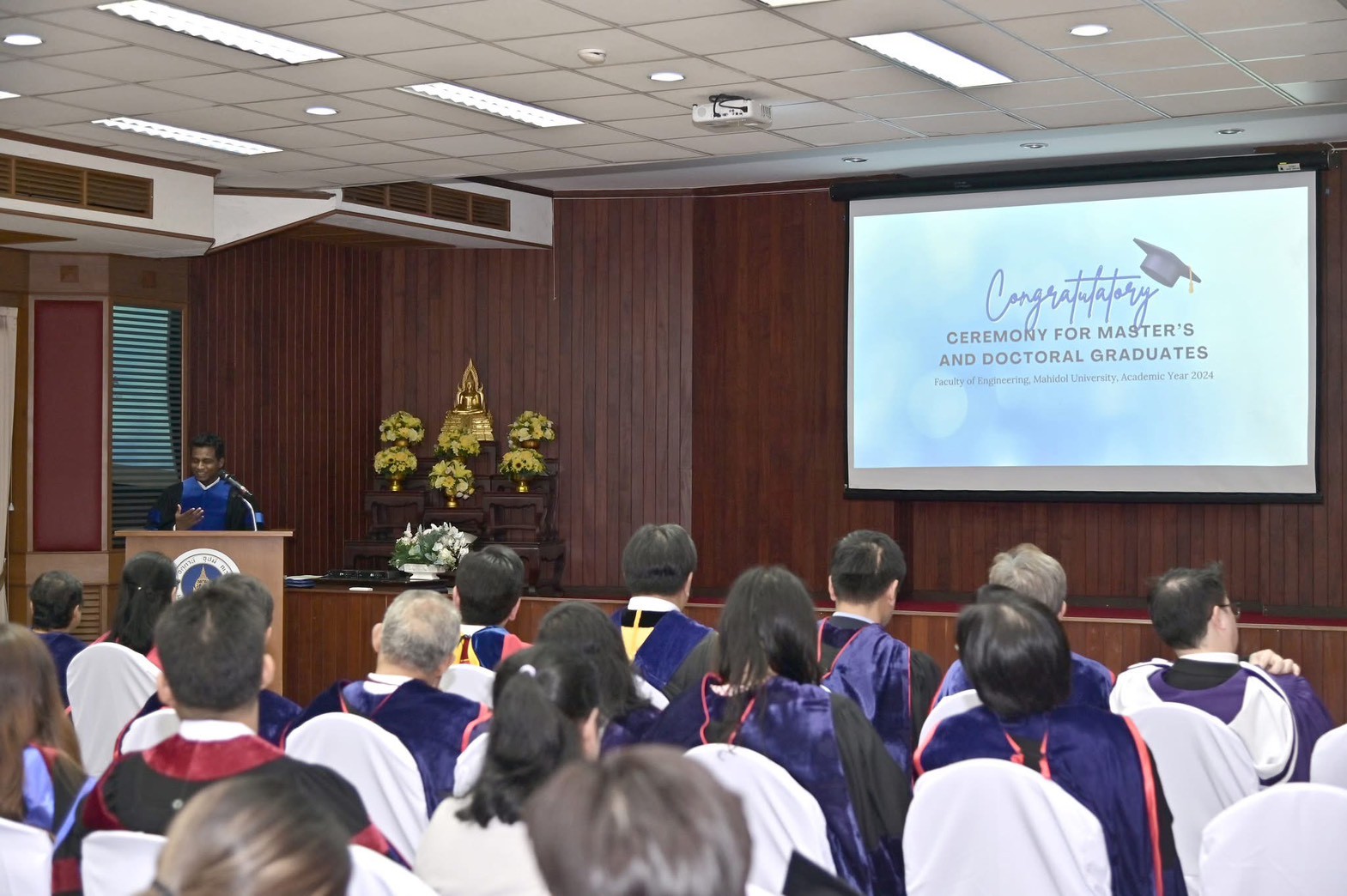 วันที่ 3 ตุลาคม 2568 คณะวิศวกรรมศาสตร์ มหาวิทยาลัยมหิดล จัดพิธีแสดงความยินดีกับบัณฑิตระดับปริญญาโทและปริญญาเอก ประจำปีการศึกษา 2567 ณ ห้องประชุม R114 ชั้น 1 อาคาร 1 โดยมีคณะผู้บริหาร คณาจารย์ และแขกผู้มีเกียรติ เข้าร่วมแสดงความยินดีต่อความสำเร็จครั้งสำคัญของบัณฑิต พร้อมบรรยากาศที่เต็มไปด้วยความภาคภูมิใจและอบอุ่น