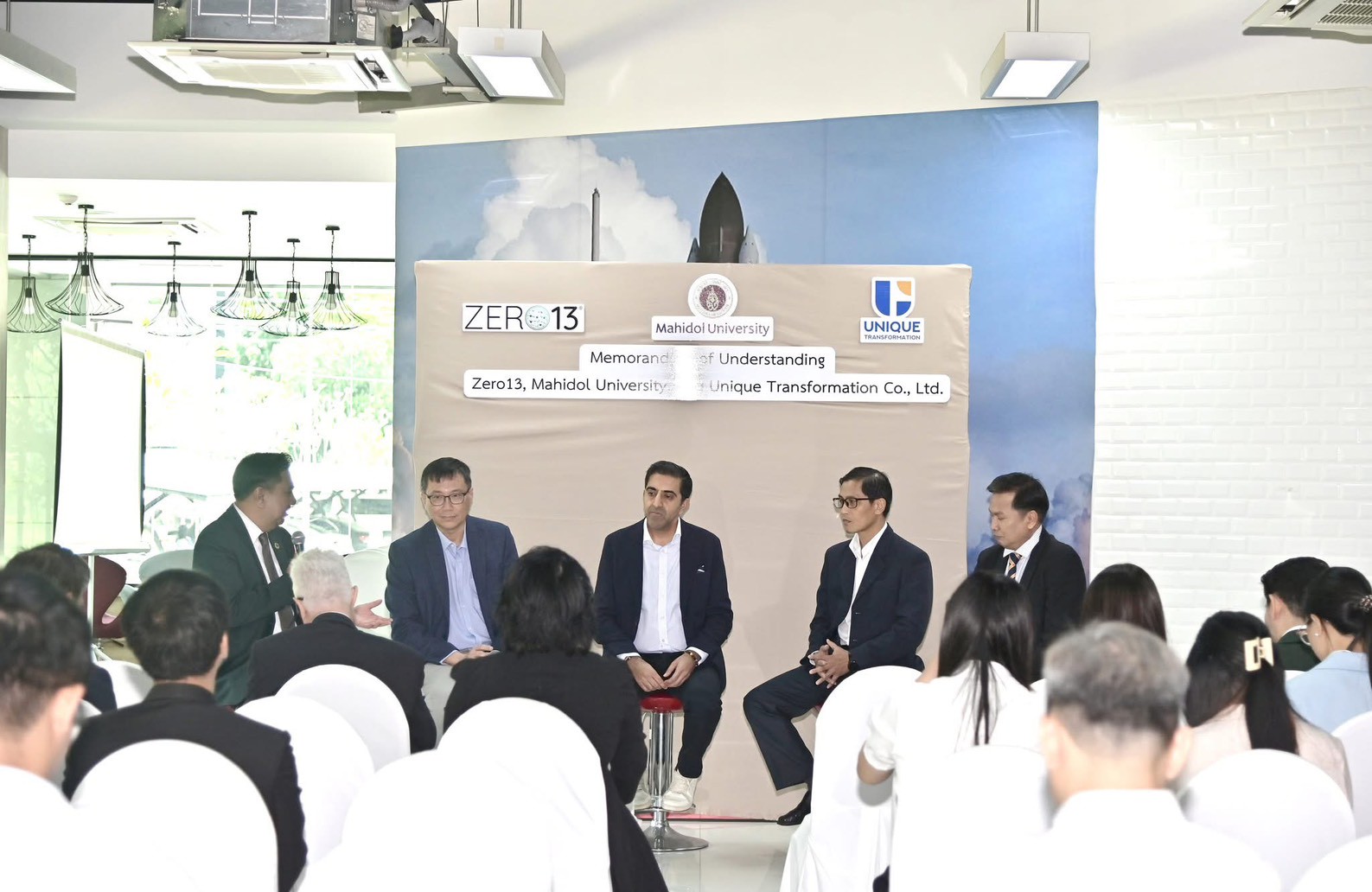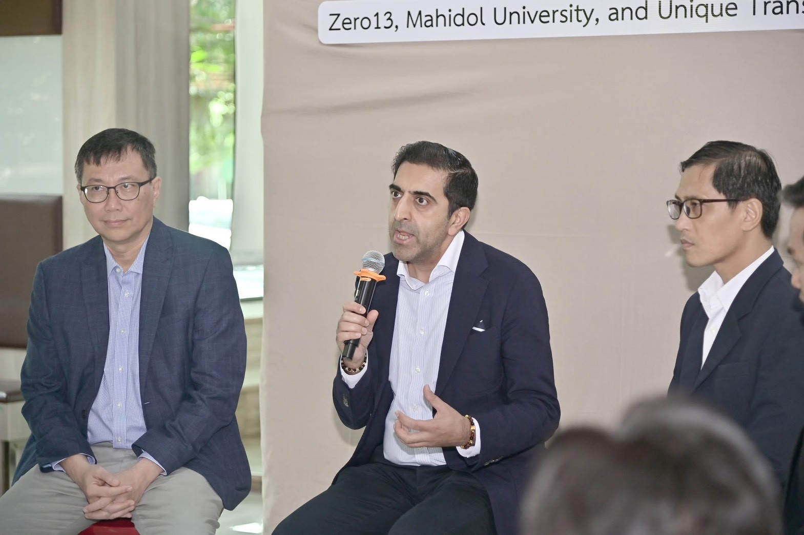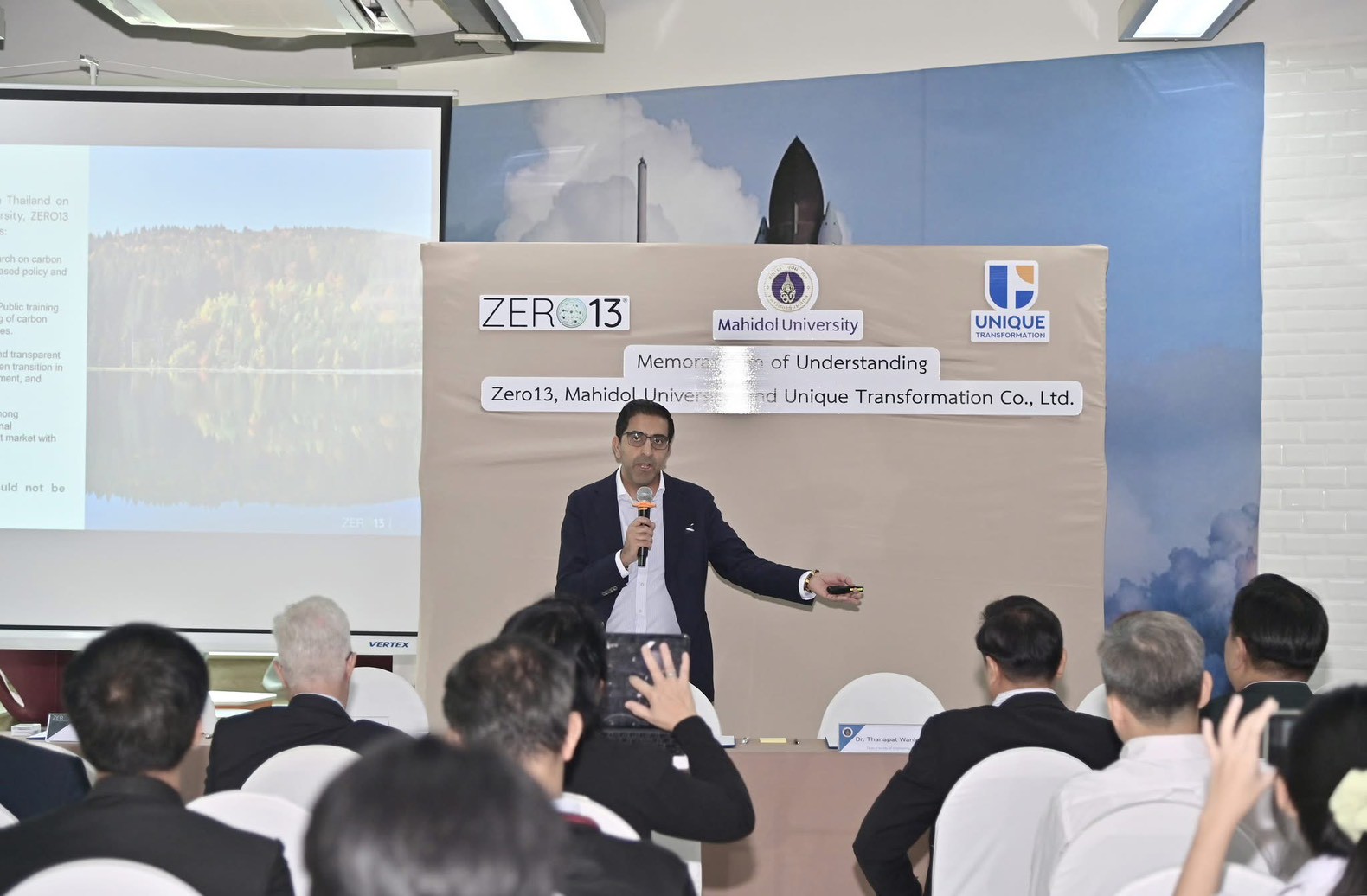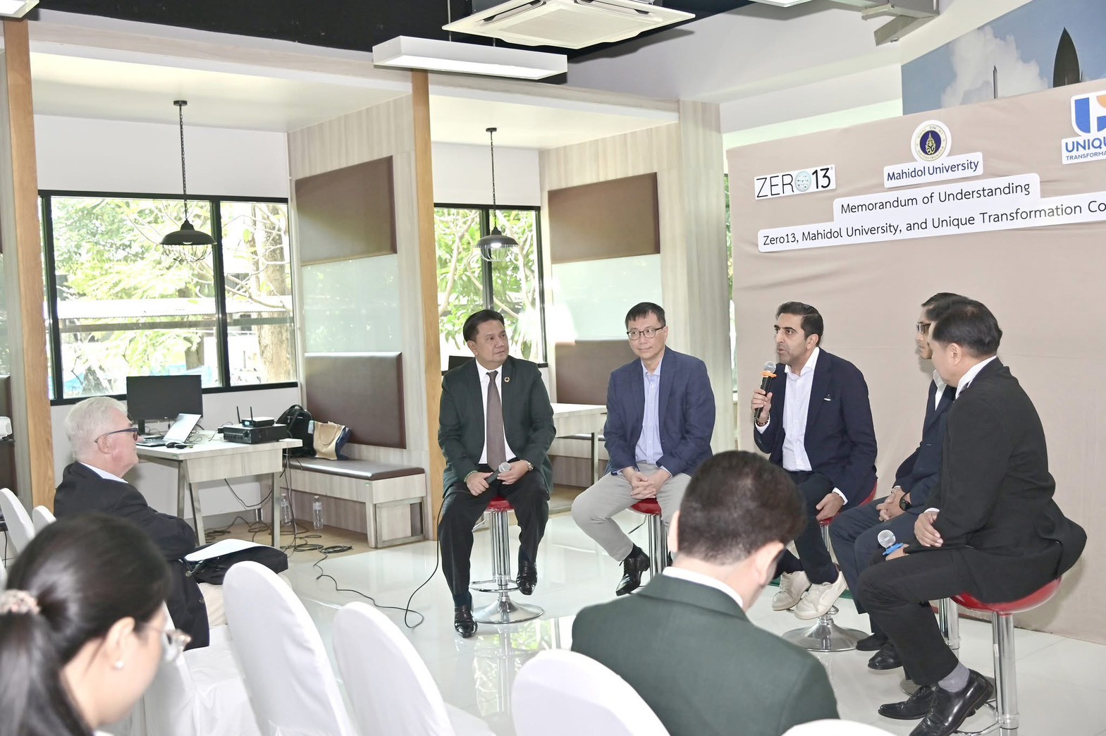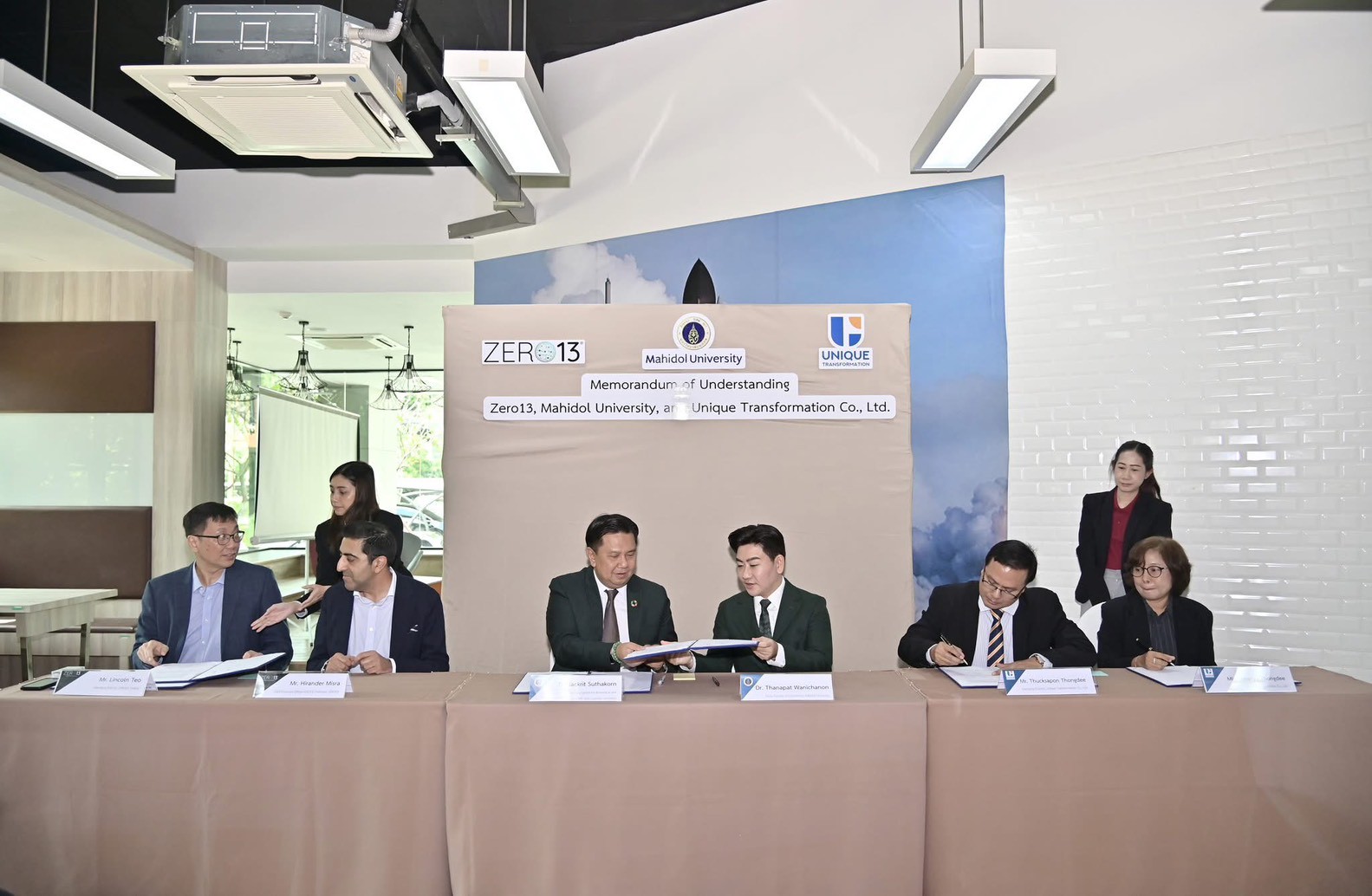 ในโอกาสนี้ คณะวิศวกรรมศาสตร์ มหาวิทยาลัยมหิดล นำโดย รองศาสตราจารย์ ดร.ธนภัทร์ วานิชานนท์ คณบดี พร้อมด้วย รองศาสตราจารย์ ดร.จักรกฤษณ์ ศุทธากรณ์ ผู้ก่อตั้งศูนย์เครือข่ายวิจัยประยุกต์ทางเทคโนโลยีหุ่นยนต์และชีวการแพทย์ (BART LAB) ร่วมกับ Mr. Hirander Misra, Chairman and CEO พร้อมด้วย Mr. Lincoln Teo, Managing Director (ZERO13 Trading) จาก ZERO13 และ Mr. Thucksapon Thongdee, Managing Director พร้อมด้วย Miss Saranya Thongdee จาก Unique Transform Co., Ltd. ได้ร่วมลงนามบันทึกข้อตกลง (MoU) ภายใต้หัวข้อ “Zero Carbon & Beyond” ณ Innogineer Studio คณะวิศวกรรมศาสตร์ มหาวิทยาลัยมหิดล ซึ่งถือเป็นอีกหนึ่งก้าวสำคัญของความร่วมมือในการขับเคลื่อนสังคมสู่อนาคตสีเขียวอย่างยั่งยืน