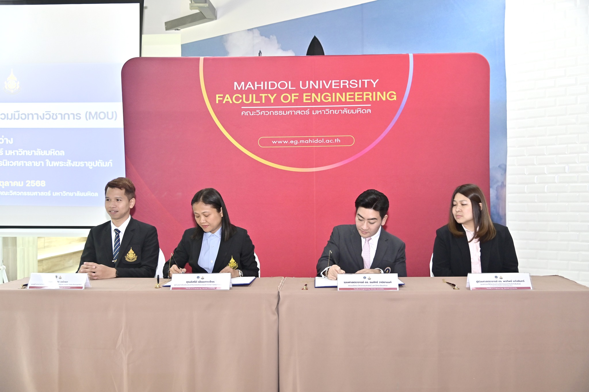วันที่ 17 ตุลาคม 2568 คณะวิศวกรรมศาสตร์ มหาวิทยาลัยมหิดล จัดพิธีลงนามบันทึกข้อตกลงความร่วมมือทางวิชาการ (MOU) กับ โรงเรียนรัตนโกสินทร์สมโภชบวรนิเวศศาลายา ในพระสังฆราชูปถัมภ์ เพื่อร่วมกันยกระดับคุณภาพการศึกษาและการพัฒนานวัตกรรมของประเทศ โดยมี รองศาสตราจารย์ ดร.ธนภัทร์ วานิชานนท์ คณบดีคณะวิศวกรรมศาสตร์ มหาวิทยาลัยมหิดล เป็นผู้ลงนามฝ่ายมหาวิทยาลัย และ อาจารย์ อิสรีย์ เนียมเกาะเพ็ชร ผู้อำนวยการโรงเรียนรัตนโกสินทร์สมโภชบวรนิเวศศาลายา ในพระสังฆราชูปถัมภ์ เป็นผู้ลงนามฝ่ายโรงเรียน พร้อมด้วย ผู้ช่วยศาสตราจารย์ ดร.พรทิพย์ แก่งอินทร์ รองคณบดีฝ่ายบ่มเพาะนวัตกรรมและศิษย์เก่าสัมพันธ์ และ อาจารย์ รพีพัทร แผ้วผา รองผู้อำนวยการ ผู้บริหารทั้งสองหน่วยงานร่วมเป็นสักขีพยานในพิธี ณ Innogineer Studio ชั้น 1 อาคาร 3 คณะวิศวกรรมศาสตร์ มหาวิทยาลัยมหิดล