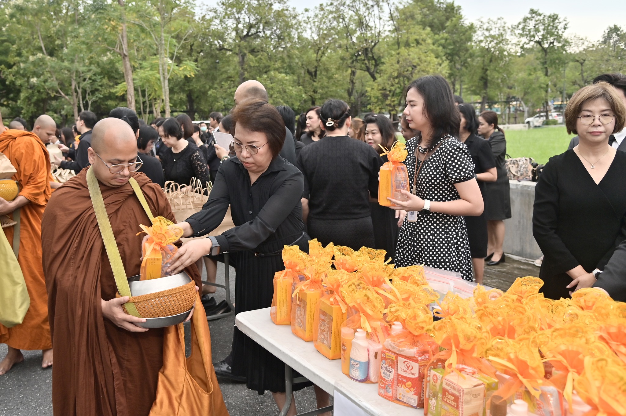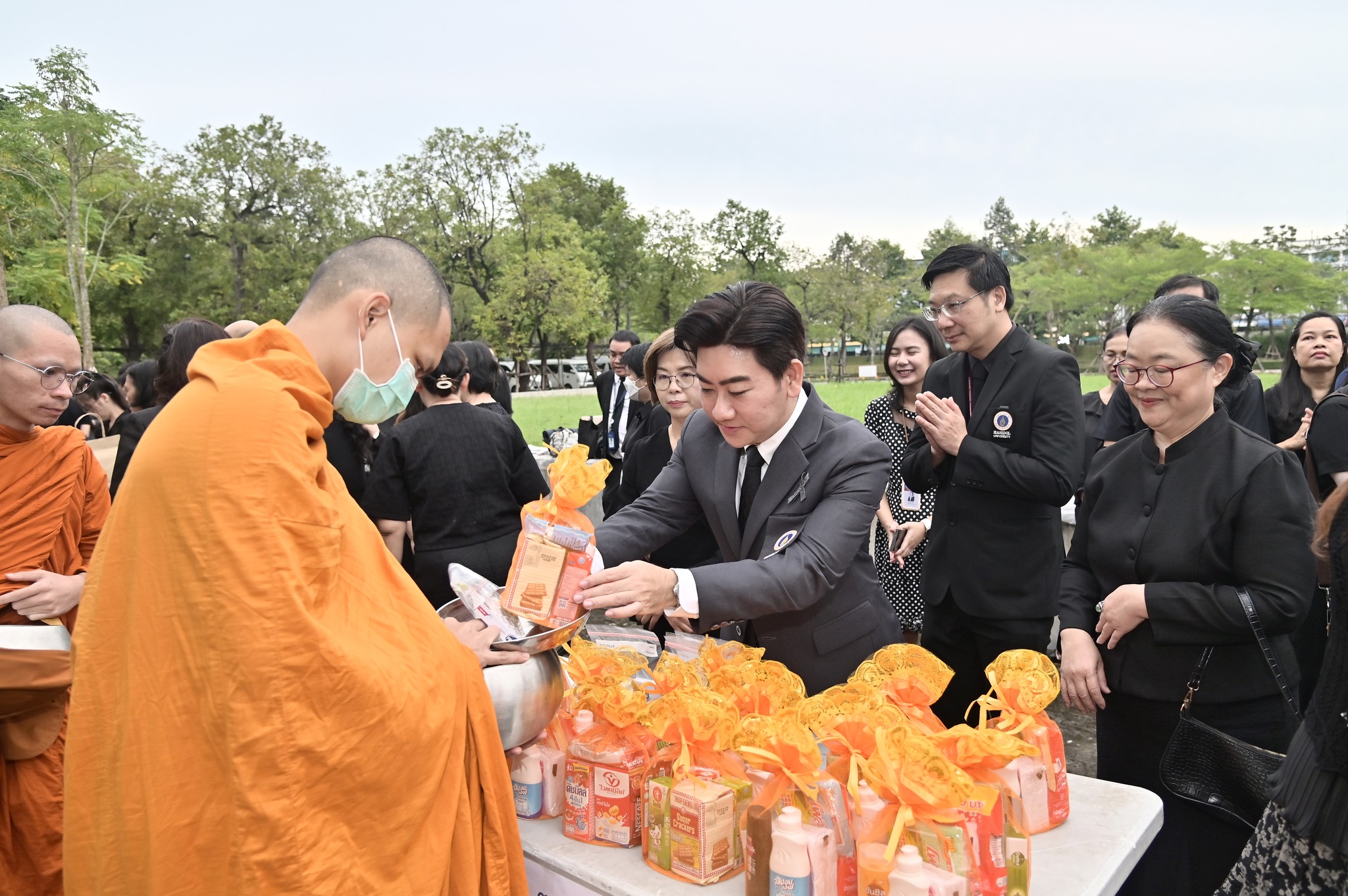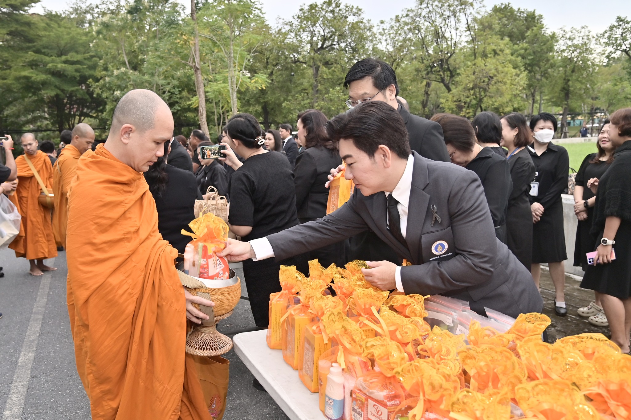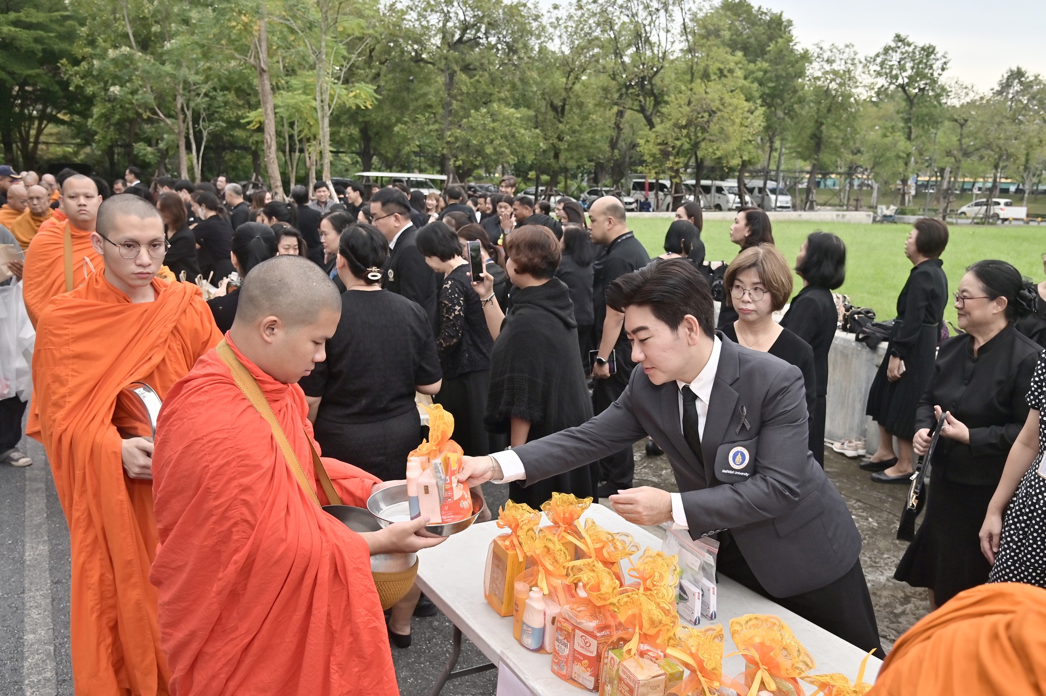 โดยพิธีจัดขึ้นตามกำหนดการของมหาวิทยาลัย โอกาสนี้ยังได้มีการจัดวางโต๊ะสิ่งของตักบาตรจากส่วนงานและหน่วยงานต่าง ๆ ภายในมหาวิทยาลัย ร่วมอนุโมทนาในกิจกรรมอันเป็นสาธุประเพณี พร้อมแต่งกายด้วยชุดสุภาพไว้ทุกข์ การเข้าร่วมพิธีครั้งนี้สะท้อนถึงความสำนึกในพระมหากรุณาธิคุณอันหาที่สุดมิได้และเป็นโอกาสให้บุคลากรมหาวิทยาลัยได้ร่วมกันถวายความอาลัยด้วยความพร้อมเพรียงและสมพระเกียรติ