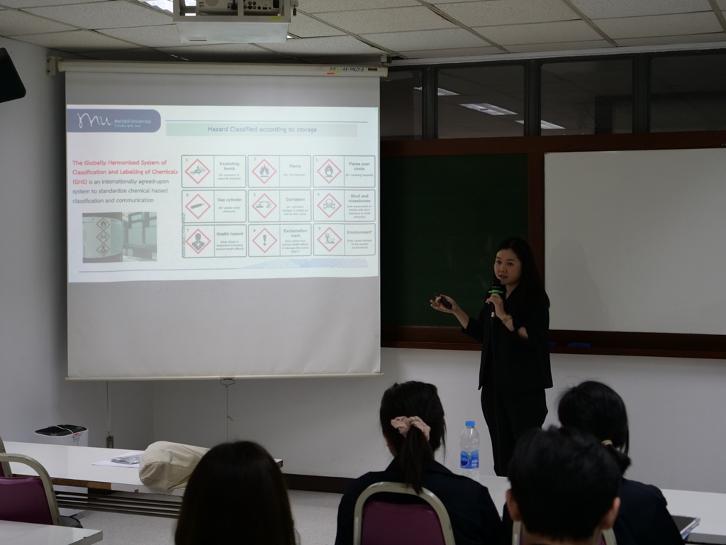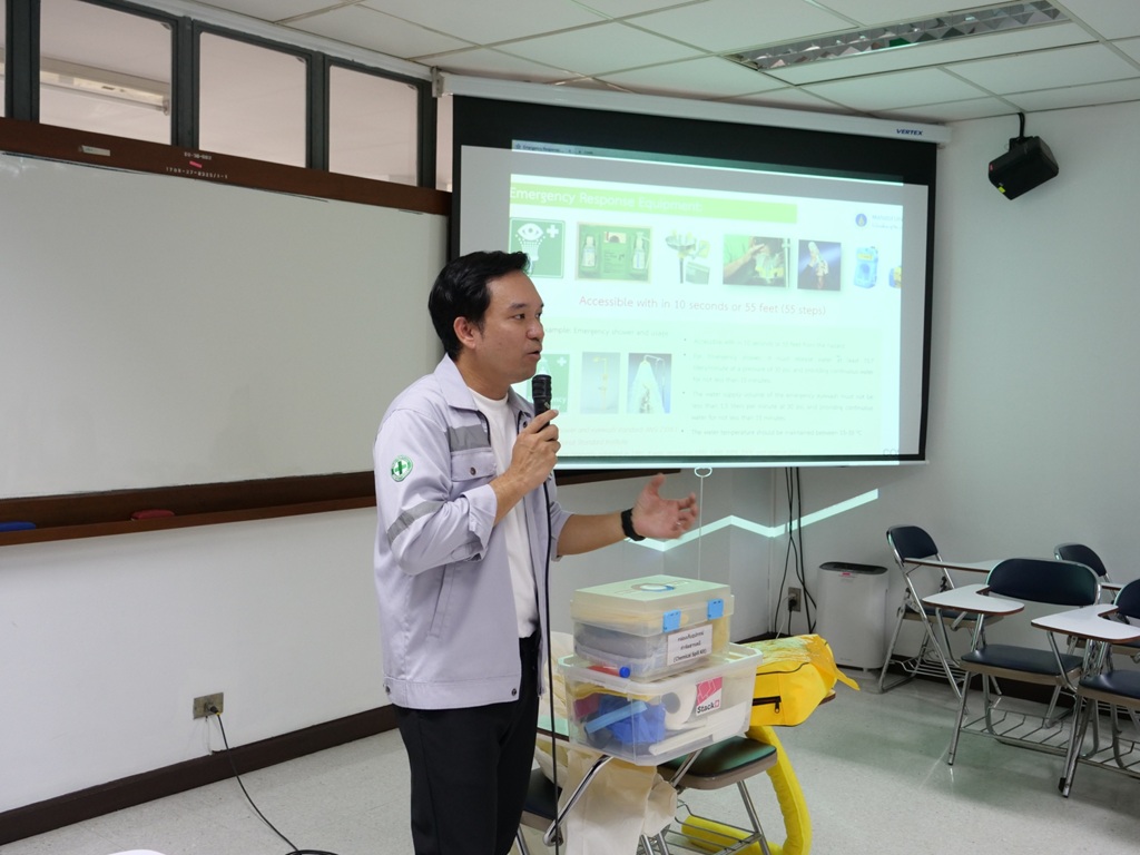 วันที่ 12 พฤศจิกายน 2568 ภาควิชาวิศวกรรมเคมี คณะวิศวกรรมศาสตร์ มหาวิทยาลัยมหิดล จัดกิจกรรม “อบรมความปลอดภัยในการใช้ห้องปฏิบัติการตามมาตรฐาน ESPReL มุ่งสู่มาตรฐานความปลอดภัยระดับสากลและความเป็นนานาชาติ ประจำปีการศึกษา 2568” เพื่อเสริมสร้างความรู้ ความเข้าใจ และความตระหนักด้านความปลอดภัยในการทำงานในห้องปฏิบัติการ รวมถึงเป็นการดำเนินการต่อเนื่องตาม “โครงการยกระดับมาตรฐานความปลอดภัยห้องปฏิบัติการวิจัยในประเทศไทย” (Enhancement of Safety Practice of Research Laboratory in Thailand: ESPReL) โดยได้รับเกียรติจากเจ้าหน้าที่จาก ศูนย์ COSHEM (Center of Occupational Safety, Health and Environment Management) พร้อมด้วยคณาจารย์และเจ้าหน้าที่ภาควิชาวิศวกรรมเคมี ร่วมเป็นวิทยากรให้ความรู้แก่คณาจารย์ บุคลากร และนักศึกษา โดยเนื้อหาการอบรมมุ่งเน้นสร้างความรู้พื้นฐานเกี่ยวกับการจัดการสารเคมี การจัดการของเสียสารเคมี การใช้อุปกรณ์ป้องกันภัยส่วนบุคคล (PPE) การปฏิบัติเมื่อเกิดเหตุสารเคมีรั่วไหล ตลอดจนการฝึกใช้ถังดับเพลิงเพื่อระงับเหตุอัคคีภัย