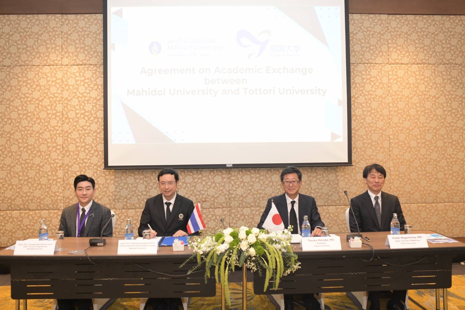 วันที่ 24 พฤศจิกายน 2568 รองศาสตราจารย์ ดร.ธนภัทร์ วานิชานนท์ คณบดีคณะวิศวกรรมศาสตร์ มหาวิทยาลัยมหิดล เข้าร่วมพิธีลงนามบันทึกข้อตกลงความร่วมมือ จำนวน 2 ฉบับ ประกอบด้วย การลงนามบันทึกข้อตกลงความร่วมมือระหว่าง มหาวิทยาลัยมหิดล และTottori University และลงนามบันทึกข้อตกลงความร่วมมือระหว่าง มหาวิทยาลัยมหิดล ร่วมกับ Tottori University และ Tottori Industrial Promotion Organization (TIPO) โดยมีผู้ลงนาม ได้แก่ 1) ผู้ช่วยศาสตราจารย์ ดร.ธัชวีร์ ลีละวัฒน์ รองอธิการบดีฝ่ายวิทยาเขตกาญจนบุรี 2) Prof. Tasuku Harada, President of Tottori University ประเทศญี่ปุ่น 3) Seji Okamura ผู้อำนวยการสำนักงานส่งเสริมอุตสาหกรรม Tottori, ประเทศญี่ปุ่น พร้อมด้วยสักขีพยาน ได้แก่ รองศาสตราจารย์ ดร.ธนภัทร์ วานิชานนท์ คณบดีคณะวิศวกรรมศาสตร์ รองศาสตราจารย์ ดร.จักรกฤษณ์ ศุทธากรณ์ ผู้ก่อตั้งศูนย์เครือข่ายวิจัยประยุกต์ทางเทคโนโลยีหุ่นยนต์และชีวการแพทย์ (BART LAB) คณะวิศวกรรมศาสตร์ มหาวิทยาลัยมหิดล และ Hideki Nagashima, Dean, Faculty of Medicine, Tottori University ประเทศญี่ปุ่น โดยการลงนามบันทึกข้อตกลงความร่วมมือกันครั้งนี้ มีวัตถุประสงค์เพื่อยกระดับความร่วมมือด้านการศึกษา การวิจัย การแลกเปลี่ยนนักวิจัยและนักศึกษา ตลอดจนการพัฒนาเทคโนโลยีและอุตสาหกรรมระหว่างประเทศไทยและประเทศญี่ปุ่นให้เกิดผลเป็นรูปธรรม ณ ห้อง Terrace A ชั้น 3 โรงแรม The Athenee Hotel Bangkok