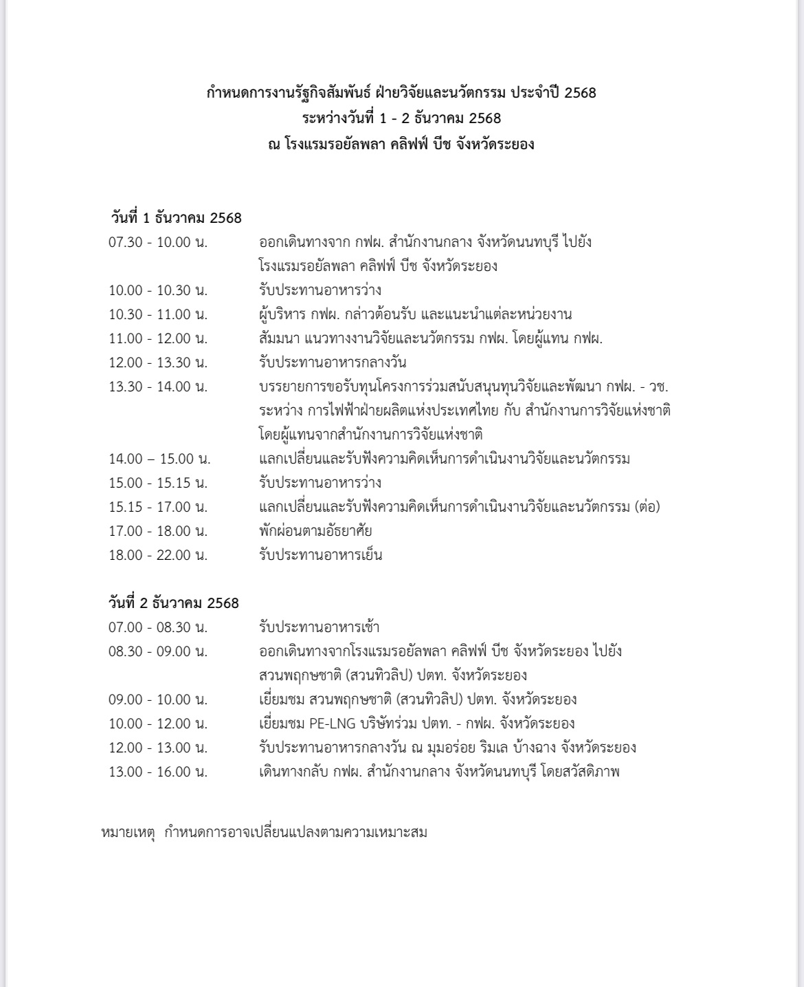 งานดังกล่าวมีวัตถุประสงค์เพื่อเสริมสร้างความร่วมมือด้านวิจัยและนวัตกรรมระหว่างสถาบันอุดมศึกษา หน่วยงานรัฐ และภาคอุตสาหกรรมให้เกิดผลอย่างยั่งยืน ภายในงานมีการสัมมนาในหัวข้อ “แนวทางงานวิจัยและนวัตกรรม กฟผ.” โดยผู้แทนจากการไฟฟ้าฝ่ายผลิตแห่งประเทศไทย (กฟผ.) พร้อมทั้งการบรรยายเกี่ยวกับแนวทางการขอรับทุนในโครงการร่วมสนับสนุนทุนวิจัยและพัฒนา กฟผ.–วช. ซึ่งเป็นความร่วมมือระหว่าง กฟผ. และสำนักงานการวิจัยแห่งชาติ (วช.) เพื่อสนับสนุนการพัฒนางานวิจัยที่ตอบโจทย์ประเทศในมิติต่าง ๆ ผู้เข้าร่วมยังได้ร่วมแลกเปลี่ยนความคิดเห็นและข้อเสนอแนะด้านการดำเนินงานวิจัยและนวัตกรรม เพื่อพัฒนากลไกการทำงานร่วมกันให้มีประสิทธิภาพยิ่งขึ้น สะท้อนความตั้งใจของทุกภาคส่วนในการผลักดันผลงานวิจัยไทยสู่การใช้งานจริงและสร้างผลกระทบเชิงบวกต่อสังคมและเศรษฐกิจ