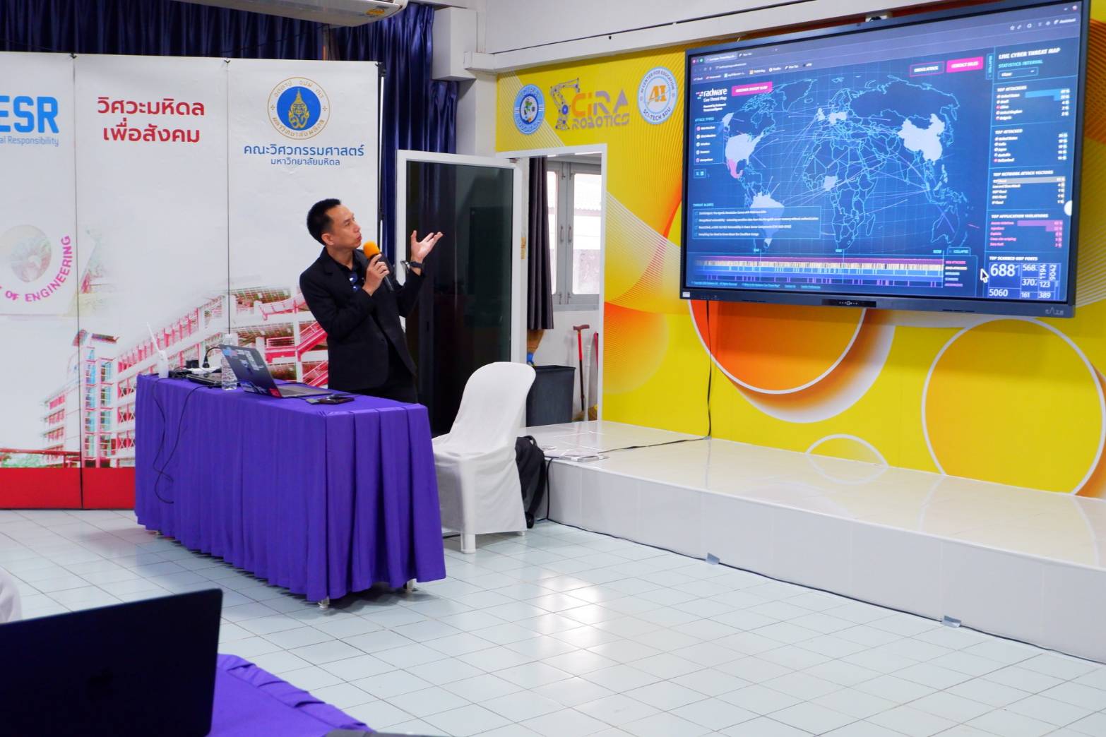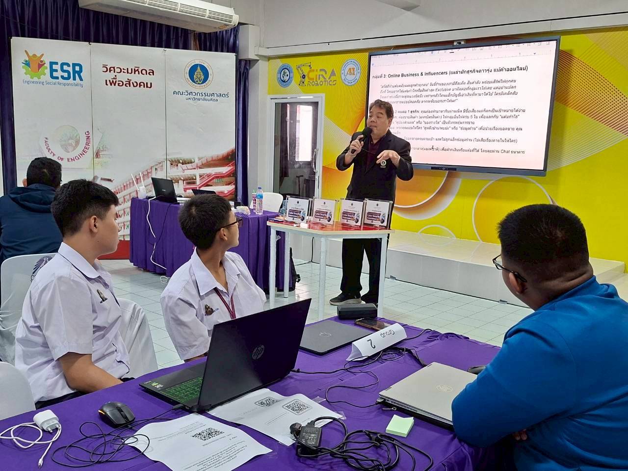 นอกจากนี้ อาจารย์วรวิทย์ อิศรางกูร ณ อยุธยา เป็นวิทยากรบรรยายในหัวข้อ “การใช้ AI อย่างไรให้มั่นคงปลอดภัยกับเทคโนโลยีสมัยใหม่” เพื่อสร้างความเข้าใจด้านจริยธรรมและความปลอดภัยในการใช้ปัญญาประดิษฐ์ รวมถึงกิจกรรมฝึกทักษะเชิงปฏิบัติ การออกแบบและวิเคราะห์สถานการณ์จำลองภัยไซเบอร์ ซึ่งมุ่งเน้นให้ผู้เรียนได้ทดลองคิด แก้ปัญหา และรับมือกับภัยคุกคามทางดิจิทัลอย่างเป็นระบบ