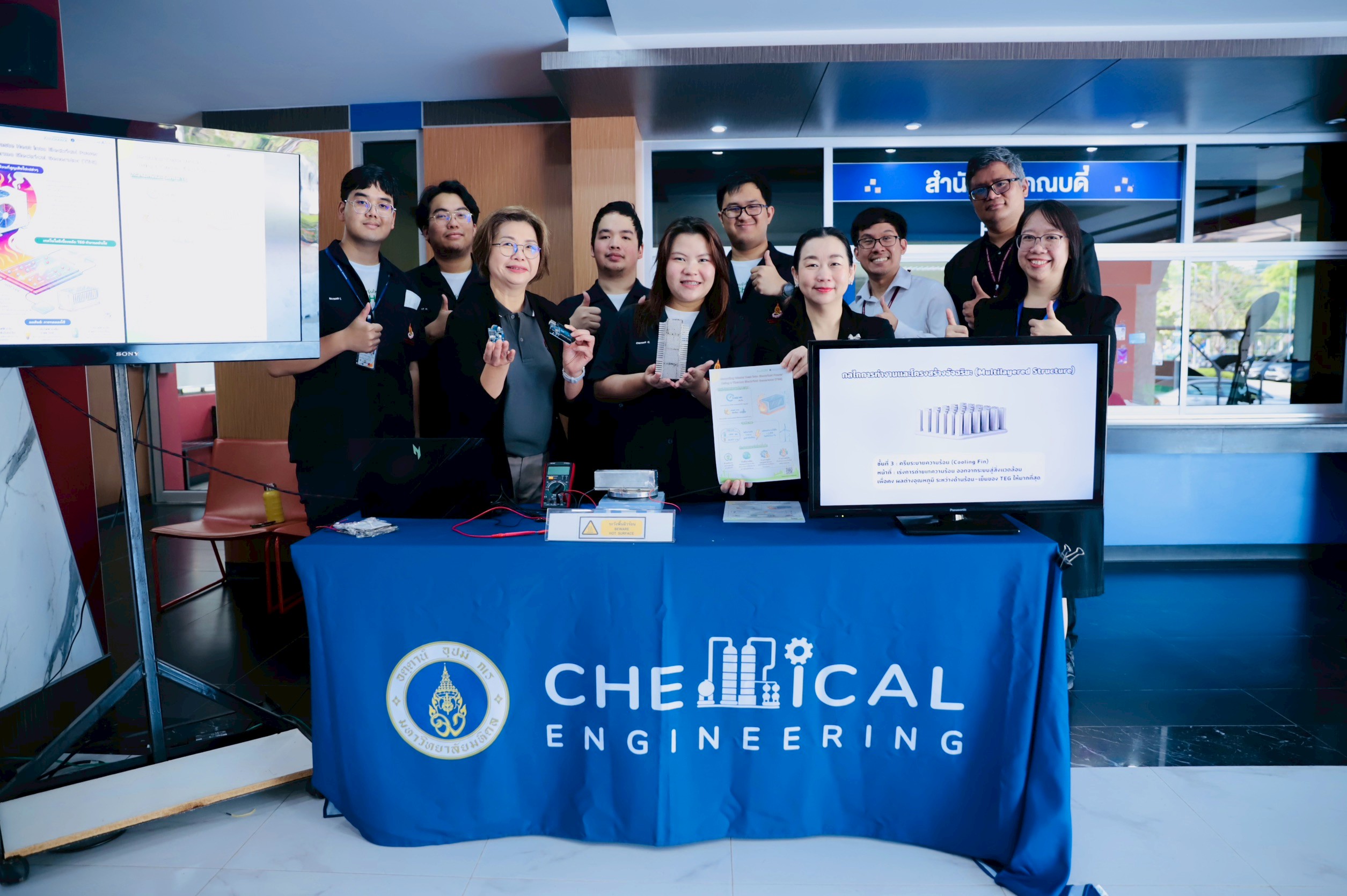 The event featured a presentation by third-year undergraduate students from the Department of Chemical Engineering Under the guidance of Dr. Suwin Apichartpattanasiri and Associate Professor Dr. Somboon Chaemchuen. Members of Team CHE_MU - Mr. Nathan Jangjit, Ms. Chutima Chinwongchan, Mr. Jirapat Wattasiri, Mr. Punyapat Yomphayom and Mr. Pakapol Udompanichwong - presented the outcomes of their innovation, Smart TEG-PCM. This integrates thermoelectric technology with phase change materials (PCM) to capture heat and convert it into electricity with enhanced stability. They shared their approach to applying innovative energy management concepts in practice, along with evaluation processes and strategies for promoting stakeholder engagement within the institution.