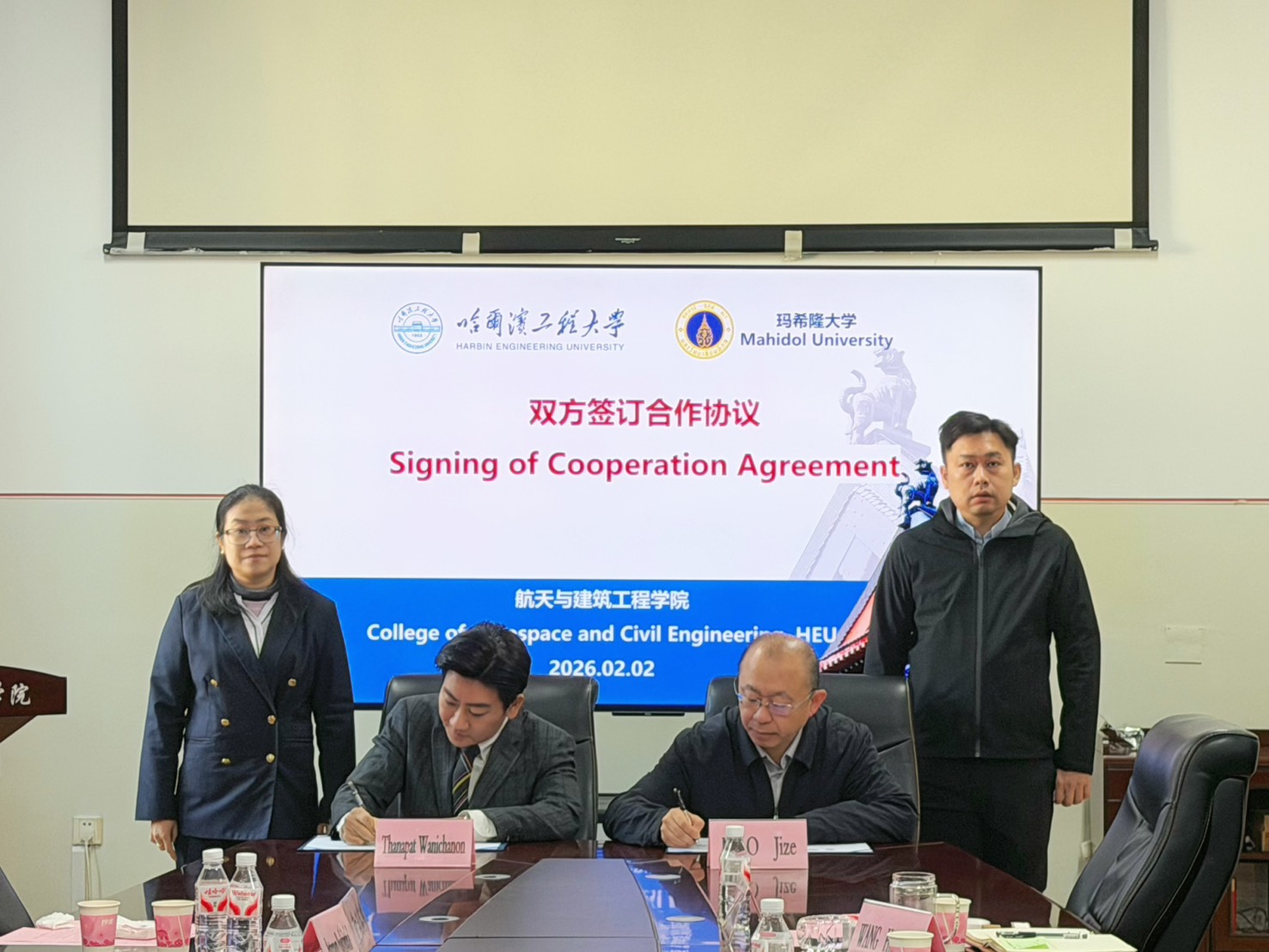 On 2 February 2026, members of the Faculty of Engineering, Mahidol University, led by Associate Professor Dr. Thanapat Wanichanon, Dean of the Faculty, visited Harbin Engineering University (HEU), People’s Republic of China. The Dean was accompanies by an executive team, including Assistant Professor Dr. Pattaraporn Posoknistakul, Deputy Dean for International Relations and Corporate Communication; Assistant Professor Dr. Wasaporn Techapeeraparnich, Deputy Dean for Academic and Student Affairs; and Associate Professor Dr. Teraphan Ornthammarath, Head of the Department of Civil and Environmental Engineering. They participated in the signing ceremony of a Memorandum of Agreement (MOA) with the College of Aerospace and Civil Engineering, HEU.