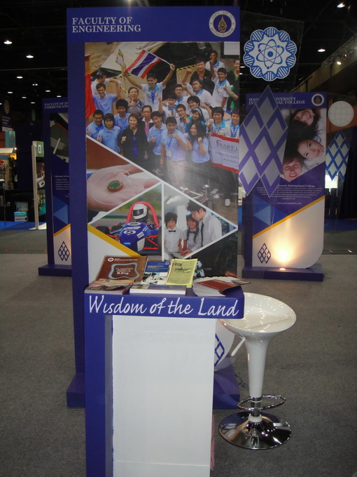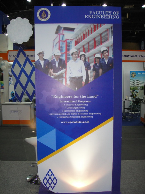 ในครั้งนี้ คณะวิศวกรรมศาสตร์ ร่วมออกบูธนิทรรศการ เพื่อประชาสัมพันธ์หลักสูตรนานาชาติ ร่วมกับคณะและสถาบันต่าง ๆ จากมหาวิทยาลัยมหิดล ภายใต้แนวคิดของคณะวิศวกรรมศาสตร์ “วิศวกรรมเพื่อสุขภาพ” รวมทั้ง ร่วมแสดงนวัตกรรมผลงานนักศึกษา CHA-AIM Robot for Mental Therapy หุ่นยนต์ทำหน้าที่ช่วยบำบัดผู้ป่วย เด็กออทิสติกส์ ผลงานร่วมกันของนักศึกษาตั้งแต่ระดับปริญญาตรี ถึงปริญญาเอกของภาควิชาวิศวกรรมชีวการแพทย์ โดยนวัตกรรมหุ่นยนต์นี้ได้รับความสนใจและเป็นที่ประทับใจของผู้เข้าชมงานเป็นอย่างมาก นับว่าเป็นสัญญาณที่บ่งชี้ถึงศักยภาพของคณะวิศวกรรมศาสตร์ มหาวิทยาลัยมหิดล ที่พร้อมจะยกระดับการศึกษาไทย พร้อมกับก้าวไปข้างหน้าอย่างมั่นคง