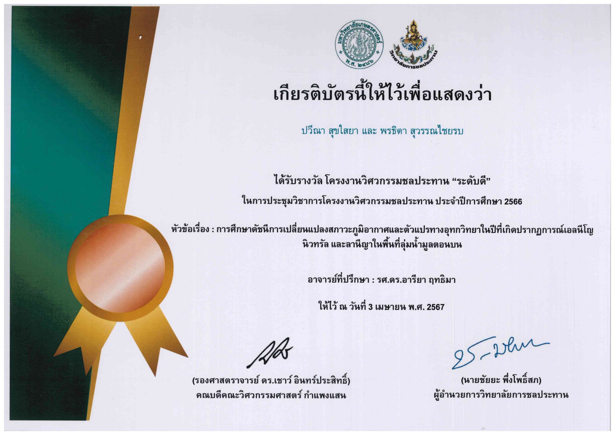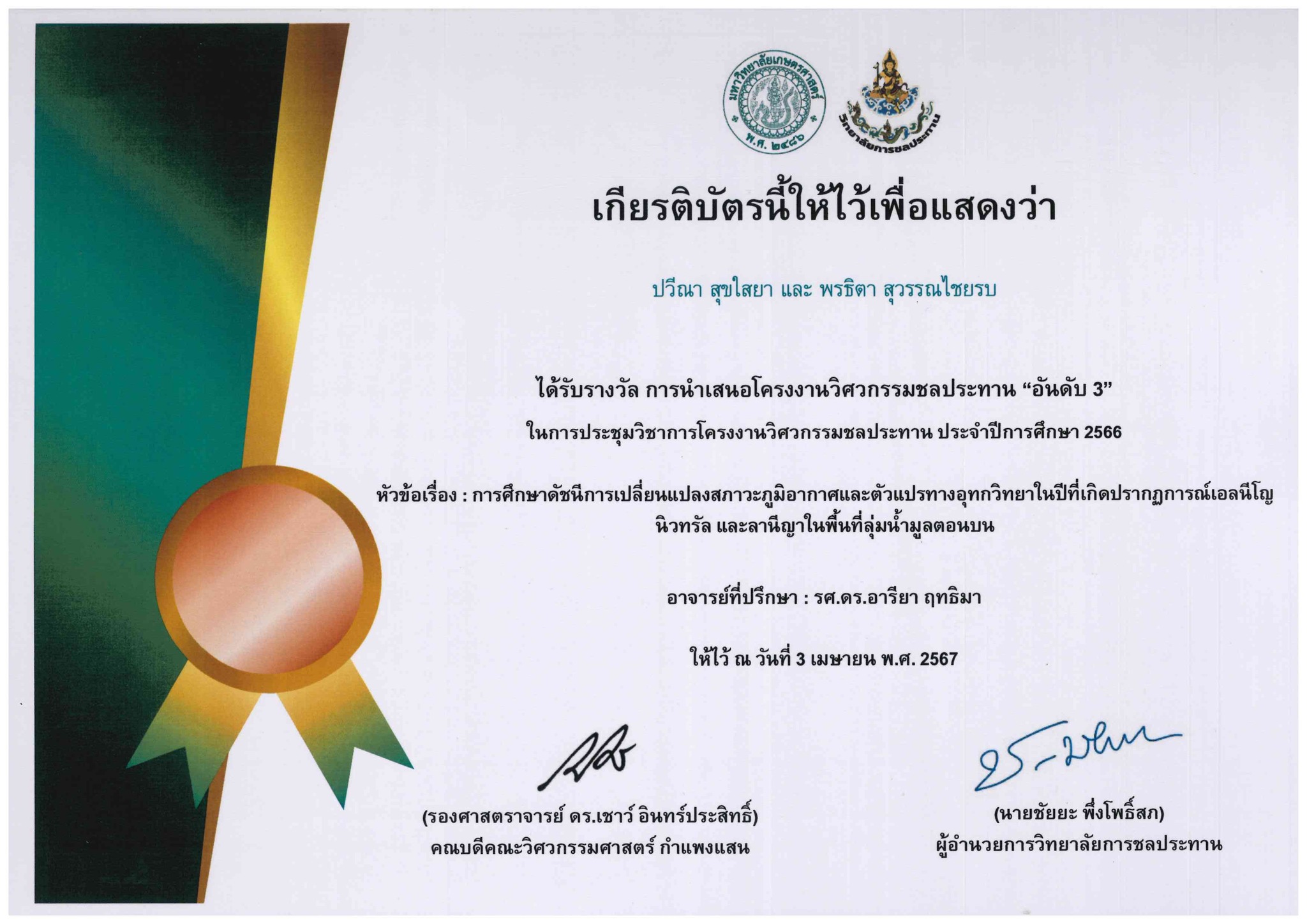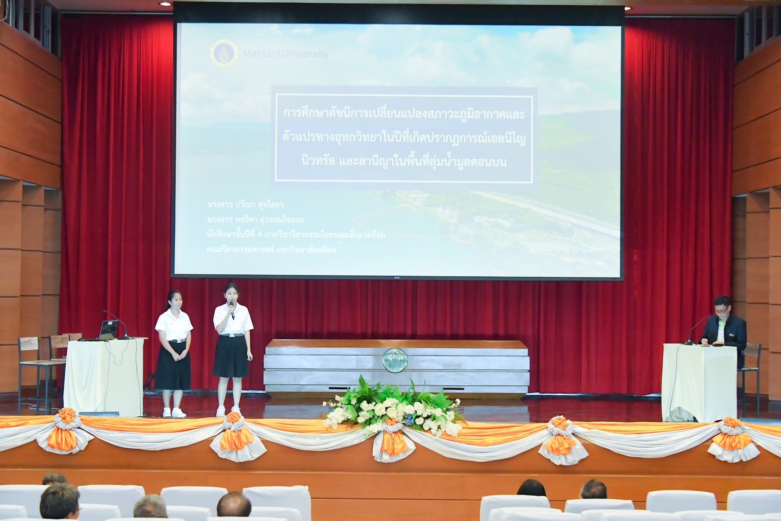 ภาควิชาวิศวกรรมโยธาและสิ่งแวดล้อม คณะวิศวกรรมศาสตร์ มหาวิทยาลัยมหิดล ขอแสดงความยินดีกับ นางสาวปวีณา สุขใสยา และนางสาวพรธิดา สุวรรณไชยรบ นักศึกษาของภาควิชาขั้นปีที่ 4 ที่ได้รับรางวัลการนำเสนอโครงงานวิศวกรรมชลประทาน อันดับ 3 (เงินรางวัล 2,000 บาท พร้อมประกาศนียบัตร) และรางวัลโครงงานวิศวกรรมชลประทาน “ระดับดี” (เงินรางวัล 2,000 บาท พร้อมประกาศนียบัตร) ในหัวข้อเรื่อง: การศึกษาดัชนีการเปลี่ยนแปลงสภาวะภูมิอากาศและตัวแปรทางอุทกวิทยาในปีที่เกิดปรากฎการณ์แอลนีโญนิวทรัล และลานีญาในพื้นที่ลุ่มน้ำมูลตอนบน จากการประชุมวิชาการโครงงานวิศวกรรมชลประทาน ประจำปีการศึกษา 2566 โดยจัดขึ้นเมื่อวันที่ 3 เมษายน 2567 ณ หอประชุมชูชาติ กำภู วิทยาลัยการชลประทาน กรมชลประทาน อ.ปากเกร็ด จ.นนทบุรี