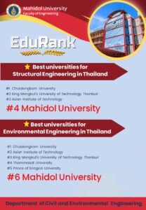 ภาควิชาวิศวกรรมโยธาและสิ่งแวดล้อม คณะวิศวกรรมศาสตร์ มหาวิทยาลัยมหิดล ติดอันดับของ Engineering Fields Top Ranking จากการจัดอันดับโลกของ EduRank.Org ในปี 2023 โดยได้รับการจัดลำดับ เป็นลำดับที่ 4 ในหมวด Structural Engineering และ ลำดับที่ 6 ในหมวด Environmental Engineering ของประเทศไทย