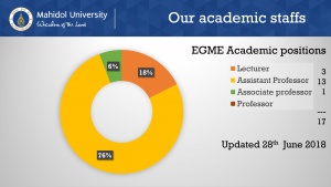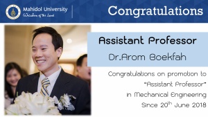 EGME warmly congratulate Dr. Arom Boekfah on his promotion to Assistant Professor in Mechanical Engineering. Asst. Prof. Dr. Arom Boekfah is a Chairperson of B.ENG (ME) Programme at MU. His specializes include Control Theory, Dynamics, and Machine Design.