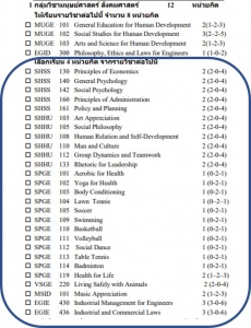 2) ตรวจสอบเป็นพิเศษ ในหมวดวิชาศึกษาทั่วไป กลุ่มวิชามนุษย์ศาสตร์ สังคมศาสตร์ ที่หลักสูตรกำหนดให้เลือกเรียน 4 หน่วยกิต โดยนักศึกษาจะต้องเลือกเรียนจากรายชื่อวิชาที่มีไว้ให้ (ในกรอบสีน้ำเงิน) เท่านั้น และจะต้องตรงทั้งรหัสและชื่อวิชา หากนักศึกษายังลงทะเบียนไม่ครบจำนวน 4 หน่วยกิต ขอให้นักศึกษาหาวิชาในกลุ่มดังกล่าวและลงทะเบียนโดยเร็วที่สุดที่สามารถทำได้
