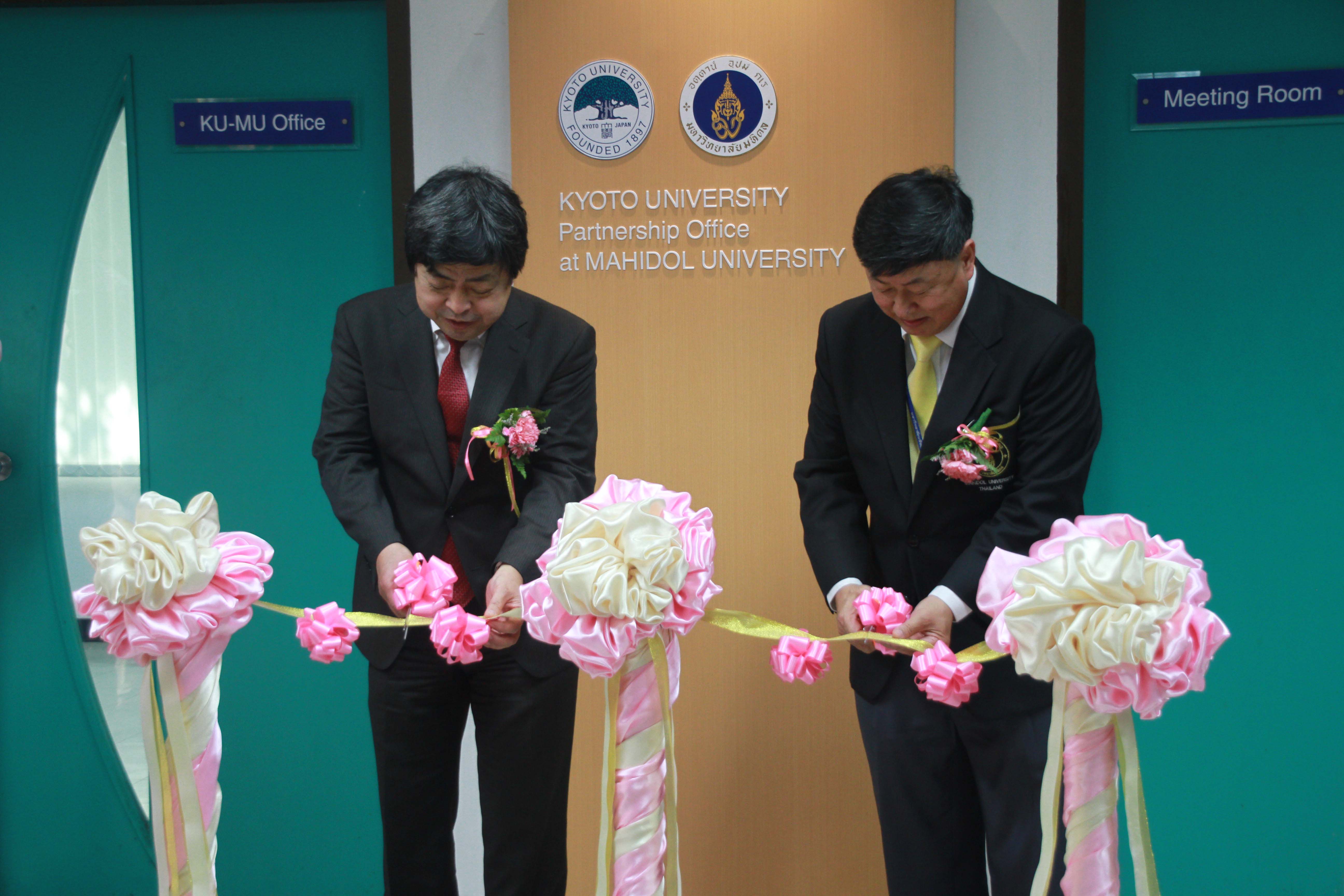ในพิธีเปิด ผศ.ดร.จักรกฤษณ์ ศุทธากรณ์ คณบดีคณะวิศวกรรมศาสตร์ มหาวิทยาลัยมหิดล กล่าวต้อนรับผู้เข้าร่วมพิธีเปิด Kyoto University Partnership Office ณ มหาวิทยาลัยมหิดล โดยมี Prof. Shigeo Fujii (Dean,Graduate School of Global Environmental Studies – KU) กล่าวแนะนำมหาวิทยาลัยเกียวโต และกล่าวถึงความร่วมมือในครั้งนี้ นอกจากนี้ยังมี Mr. Shiro Terashima เลขานุการเอก สถานเอกอัครราชทูตญี่ปุ่นประจำประเทศไทย Prof. Kuniaki Yamashita ผู้อำนวยการองค์การส่งเสริมวิชาการแห่งประเทศญี่ปุ่น (สาขากรุงเทพมหานคร) และ Prof. Mamoru Shibayama ผู้อำนวยการ Kyoto University ASEAN Center เป็นผู้แทนรัฐบาลญี่ปุ่นกล่าวแสดงความยินดีในพิธีเปิดงาน โดยมี ศาสตราจารย์ นายแพทย์ บรรจง มไหสวริยะ รองอธิการบดีมหาวิทยาลัยมหิดล เป็นประธานในพิธีเปิด ซึ่งแสดงให้เห็นถึงความเป็นหุ้นส่วนในความร่วมมือด้านการศึกษาและวิทยาศาสตร์ของทั้งสองประเทศ โดยภายในงาน มีการสัมมนาและแสดงนิทรรศการ เกี่ยวกับการศึกษาต่อให้กับนักศึกษาและบุคคลภายนอกที่สนใจ