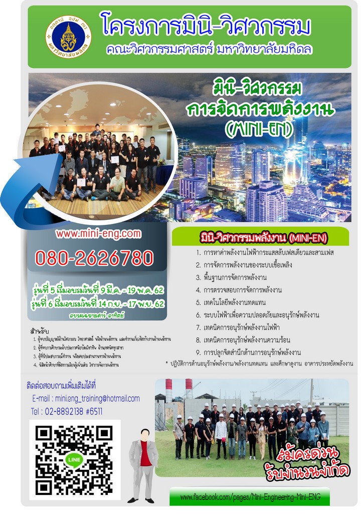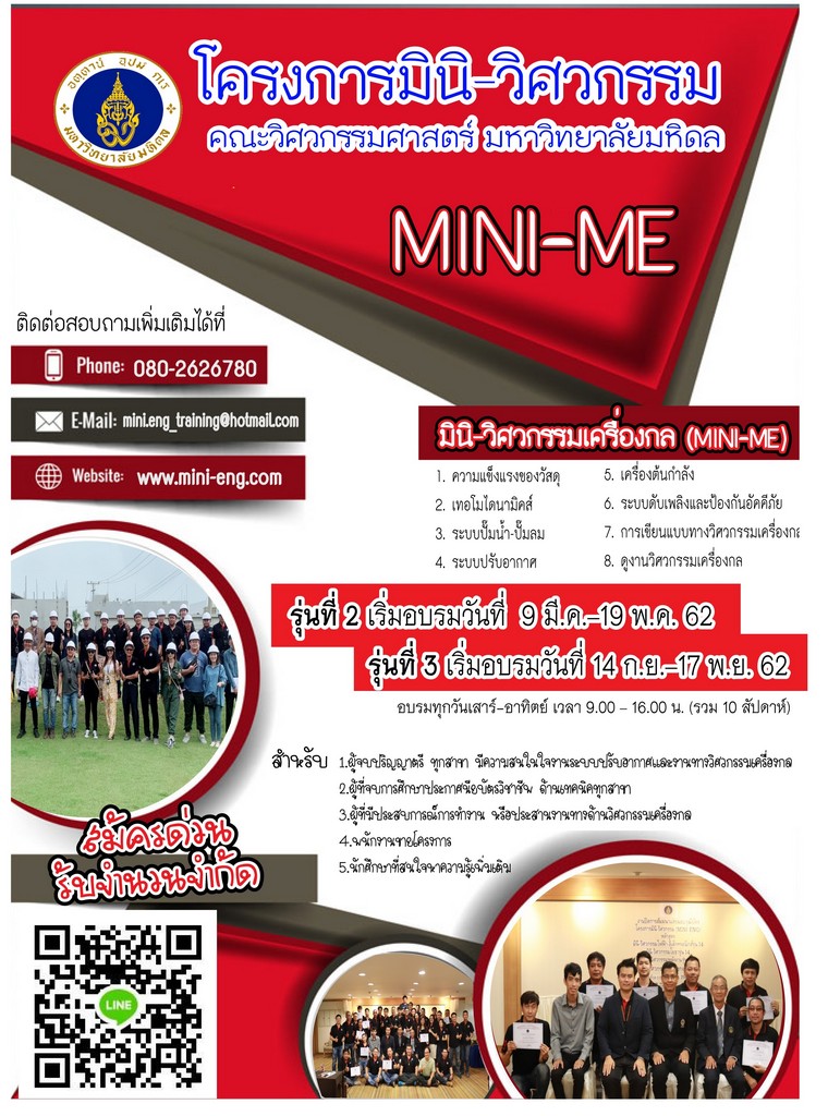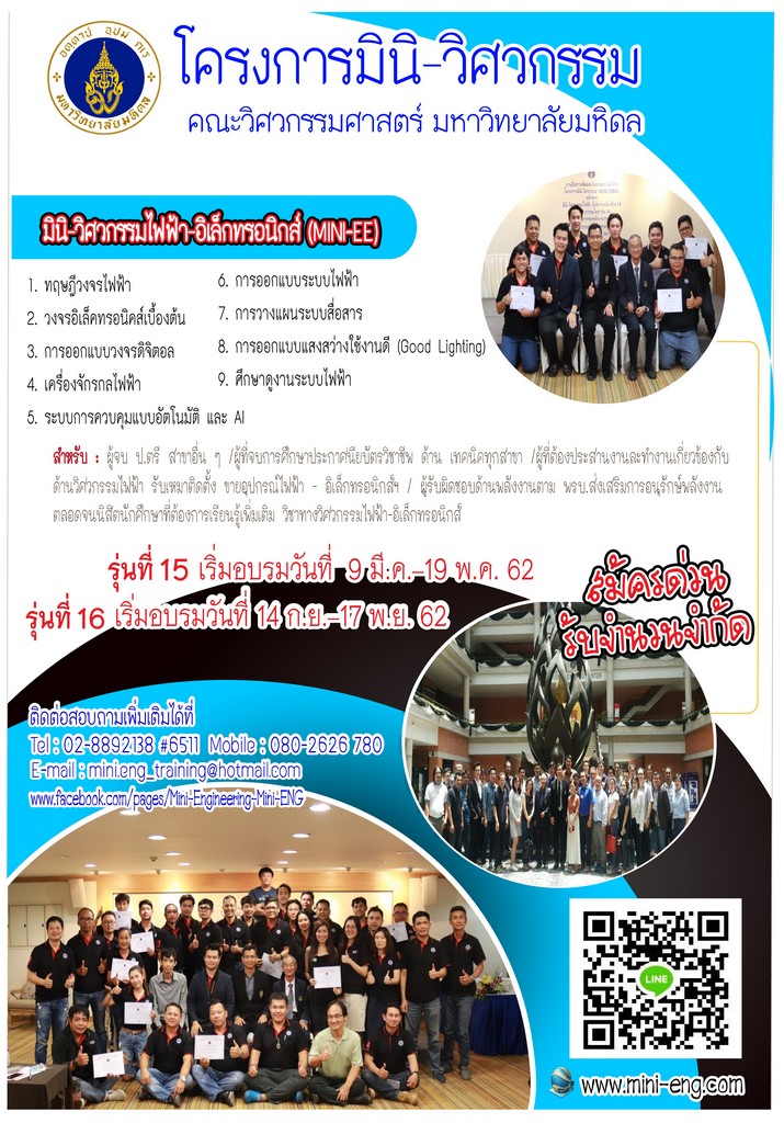 - ผู้ผ่านการอบรมมีสิทธิ์รับหน่วยพัฒนาความรู้ (PDU) เพื่อประโยชน์ในการเลื่อนระดับเป็นสามัญวิศวกร สภาวิศวกร - รับมอบวุฒิบัตร จากหัวหน้าโครงการฯ ในนามคณะวิศวกรรมศาสตร์ มหาวิทยาลัยมหิดล ****************************************** ติดต่อสอบถามเพิ่มเติมได้ที่... ผู้ประสานงาน : คุณแอล(กฤชณัท) มือถือ : 080-262-6780 , 064-996-4964 E-mail : This email address is being protected from spambots. You need JavaScript enabled to view it. ID LINE : mini-eng FB : mini.eng.training