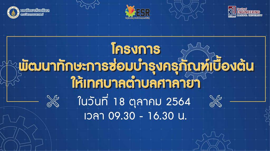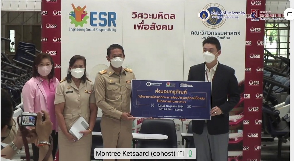 วันที่ 18 ตุลาคม 2564 ผู้ช่วยศาสตราจารย์ ดร.กฤษฎา อัศวสกุลเกียรติ รองคณบดีฝ่ายเสริมสร้างความร่วมมือและกิจกรรมเพื่อสังคม เป็นประธานกล่าวเปิด โครงการ พัฒนาทักษะการซ่อมบำรุงครุภัณฑ์เบื้องต้น พร้อมทั้งส่งมอบครุภัณฑ์ให้กับเทศบาลตำบลศาลายา โดยมี คุณณรงค์ รักพ่วง เลขานุการนายกเทศมนตรีตำบลศาลายา เป็นประธานรับมอบ นอกจากนี้ภายในงานมีการถ่ายทอดความรู้ เรื่อง “การซ่อมบำรุงครุภัณฑ์เบื้องต้น” ให้แก่เทศบาลตำบลศาลายา และบุคลากรคณะวิศวกรรมศาสตร์ โดยให้ความรู้เกี่ยวกับการซ่อมแซมครุภัณฑ์สานักงานเบื้องต้นเพื่อนำความรู้ที่ได้ไปปรับปรุงซ่อมแซมและพัฒนาครุภัณฑ์ที่มีอยู่ให้สามารถกลับมาใช้ประโยชน์ได้ และยืดอายุการใช้งานให้มีประสิทธิภาพสูงสุดอีกด้วย