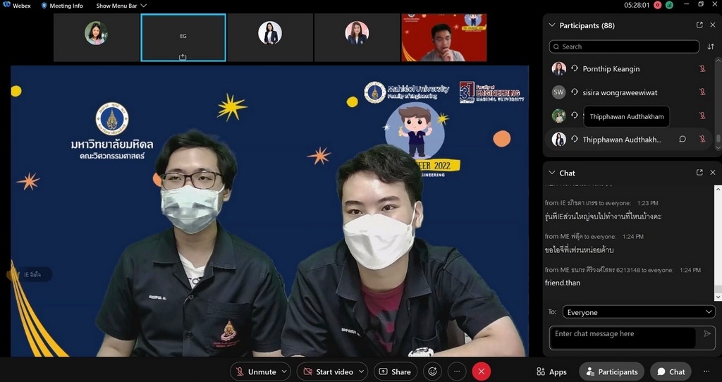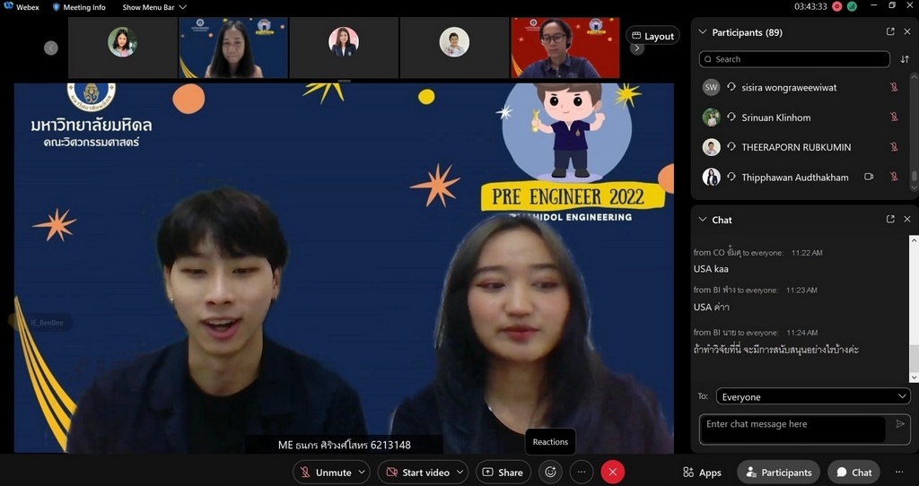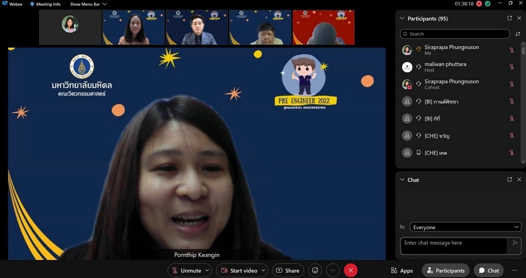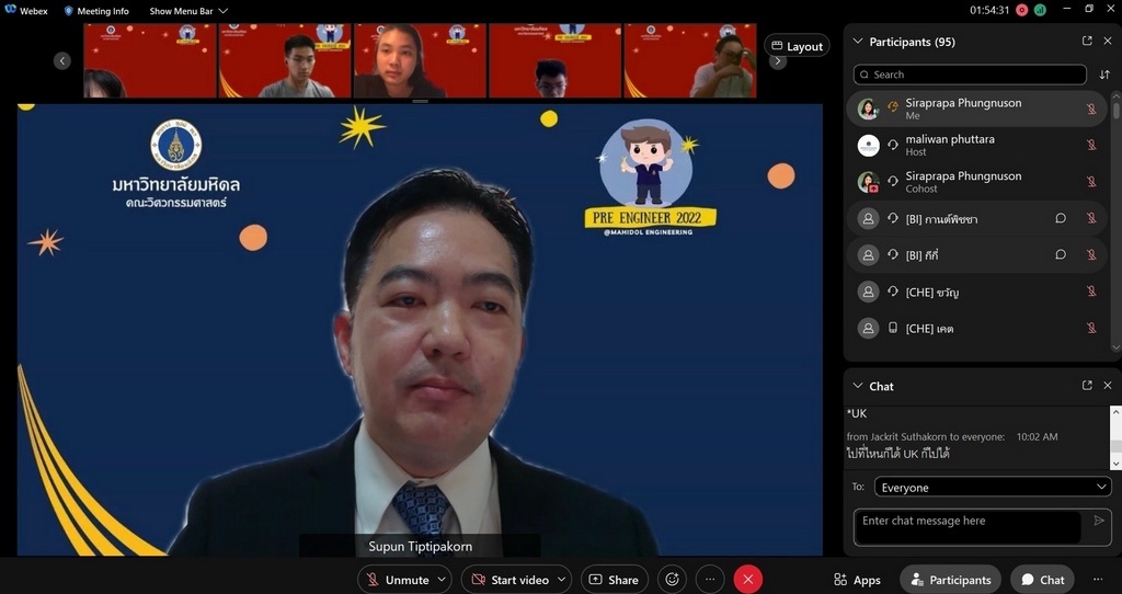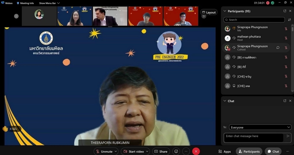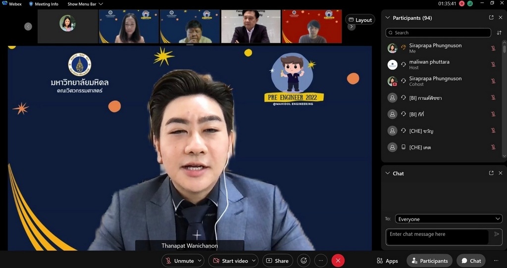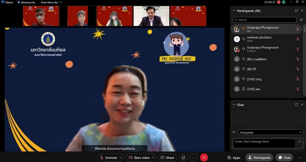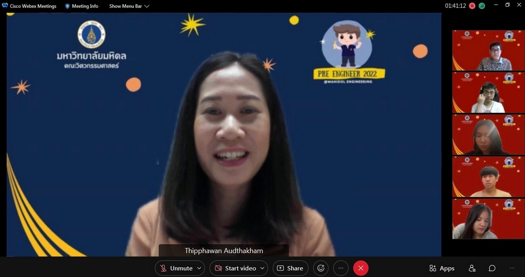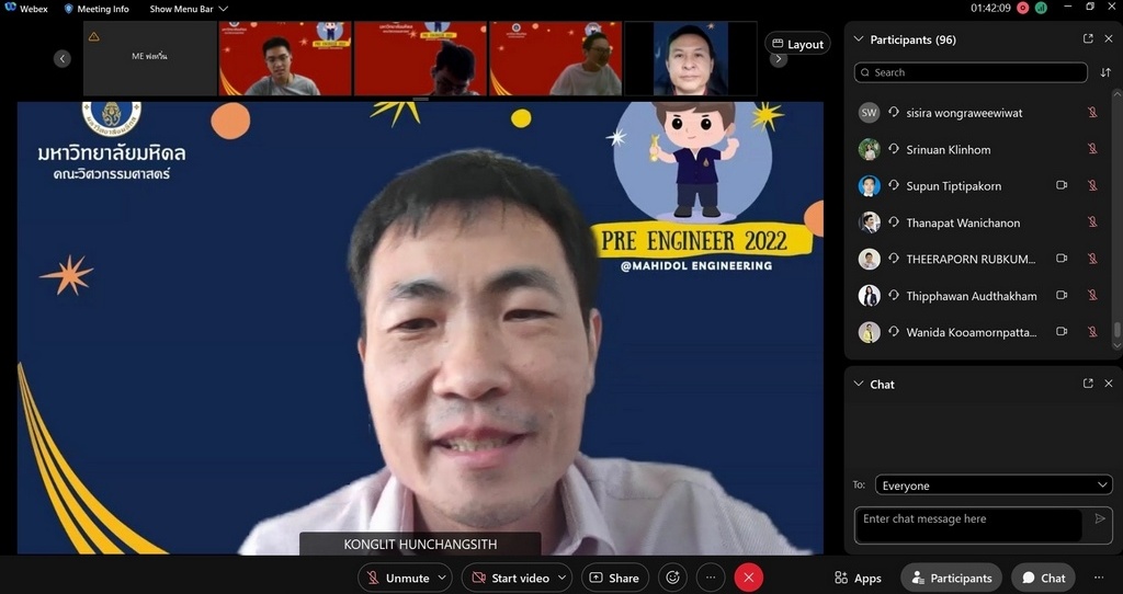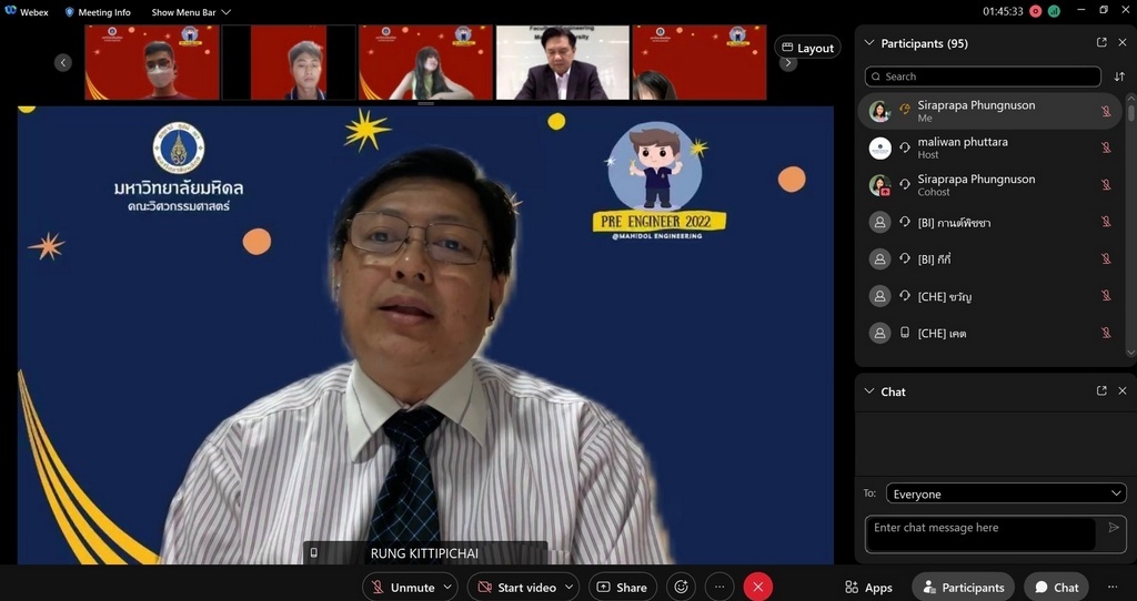 วันที่ 2 กุมภาพันธ์ 2565 รศ.ดร.จักรกฤษณ์ ศุทธากรณ์ คณบดีคณะวิศวกรรมศาสตร์ กล่าวเปิดโครงการ Pre-Engineer 2022 @Mahidol Engineering โดยมี ผศ.ดร.พรทิพย์ แก่งอินทร์ รองคณบดีฝ่ายบัณฑิตศึกษาและกิจการนักศึกษา กล่าวถึงวัตถุประสงค์การจัดงาน ซึ่งเป็นกิจกรรมที่ช่วยเตรียมความพร้อมในการเข้ามาเป็นนักศึกษาชั้นปีที่ 1 คณะวิศวกรรมศาสตร์ มหาวิทยาลัยมหิดล ประจำปีการศึกษา 2565 และเป็นการแนะนำคณะวิศวกรรมศาสตร์ โดยผู้บริหาร หัวหน้าภาควิชา คณาจารย์ และรุ่นพี่ และภายในงานมีกิจกรรมบรรยายให้ความรู้ในเรื่อง “ที่ 1 ด้าน ABET ต้องคณะวิศวกรรมศาสตร์ มหาวิทยาลัยมหิดล” “RoboCup 2022 การแข่งขันนหุ่นยนต์ระดับโลก” “MUEG ที่นี่มีเรื่องเล่า” และหัวข้อ “ทุนการศึกษาและสวัสดิการนักศึกษา” รวมทั้งการ Workshop อบรมเชิงปฏิบัติการด้านวิศวกรรม โดยกิจกรรมจัดขึ้น ระหว่างวันที่ 2-3 กุมภาพันธ์ 2565 ในรูปแบบออนไลน์ ผ่านระบบ Cisco Webex Meetings