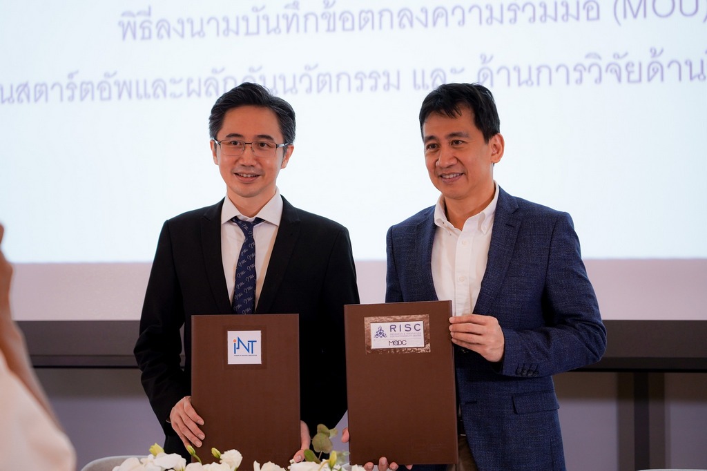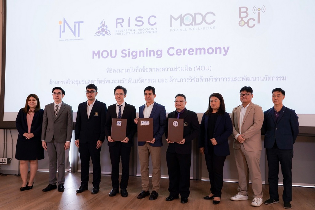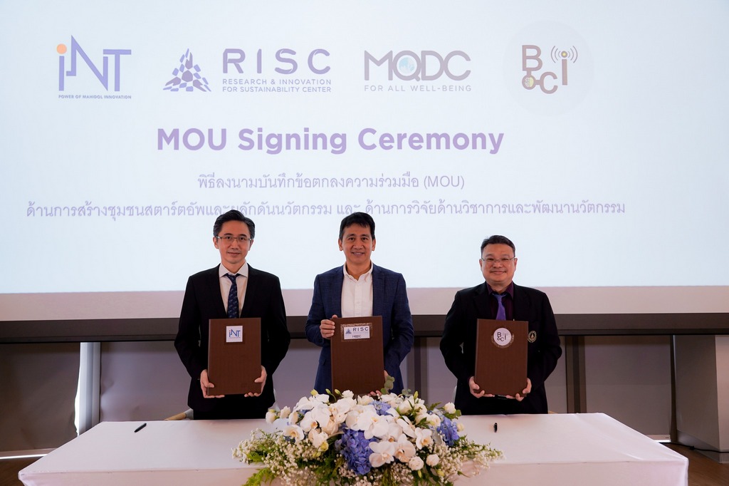 วันที่ 10 ตุลาคม 2566 รองศาสตราจารย์ ดร.ยศชนัน วงศ์สวัสดิ์ ผู้อำนวยการสถาบันบริหารจัดการเทคโนโลยีและนวัตกรรม (iNT) มหาวิทยาลัยมหิดล พร้อมด้วย ผู้ช่วยศาสตราจารย์ ดร.วรากร เจริญสุข หัวหน้าภาควิชาวิศกรรมชีวการแพทย์ คณะวิศวกรรมศาสตร์ มหาวิทยาลัยมหิดล ร่วมลงนามความร่วมมือกับ รองศาสตราจารย์ ดร.สิงห์ อินทรชูโต หัวหน้าคณะที่ปรึกษากับ ศูนย์วิจัยและนวัตกรรมเพื่อความยั่งยืน (RISC) บริษัท แมกโนเลีย ควอลิตี้ ดีเวล็อปเม้นต์ คอร์ปอเรชั่น จำกัด ในบันทึกข้อตกลงความร่วมมือ (MOU) ด้านการสร้างชุมชนสตาร์ทอัพ การผลักดันนวัตกรรม การวิจัยด้านวิชาการและพัฒนานวัตกรรม ระหว่าง สถาบันบริหารจัดการเทคโนโลยีและนวัตกรรม (iNT) ศูนย์ปฏิบัติการการเชื่อมต่อสัญญาณสมองกับคอมพิวเตอร์ (BCI) คณะวิศวกรรมศาสตร์ มหาวิทยาลัยมหิดล กับ ศูนย์วิจัยและนวัตกรรมเพื่อความยั่งยืน (RISC) บริษัท แมกโนเลีย ควอลิตี้ ดีเวล็อปเม้นต์ คอร์ปอเรชั่น จำกัด โดยมี ผู้ช่วยศาสตราจารย์ ดร.ปานนท์ ลาชโรจน์ รองผู้อำนวยการสถาบันบริหารจัดการเทคโนโลยีและนวัตกรรม (iNT) ผู้ช่วยศาสตราจารย์ ดร.พรทิพย์ แก่งอินทร์ รองคณบดีฝ่ายพัฒนาเครือข่ายและองค์กรสัมพันธ์ และ อาจารย์ ดร.เจษฎา อานิล ผู้ช่วยคณบดีฝ่ายสื่อสารองค์กร คณะวิศวกรรมศาสตร์ มหาวิทยาลัยมหิดล ร่วมเป็นสักขีพยาน ณ สำนักงานใหญ่ DTGO Campus