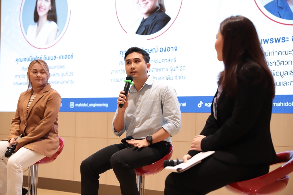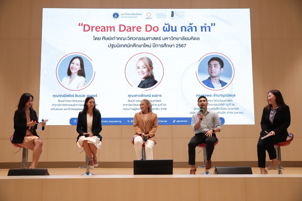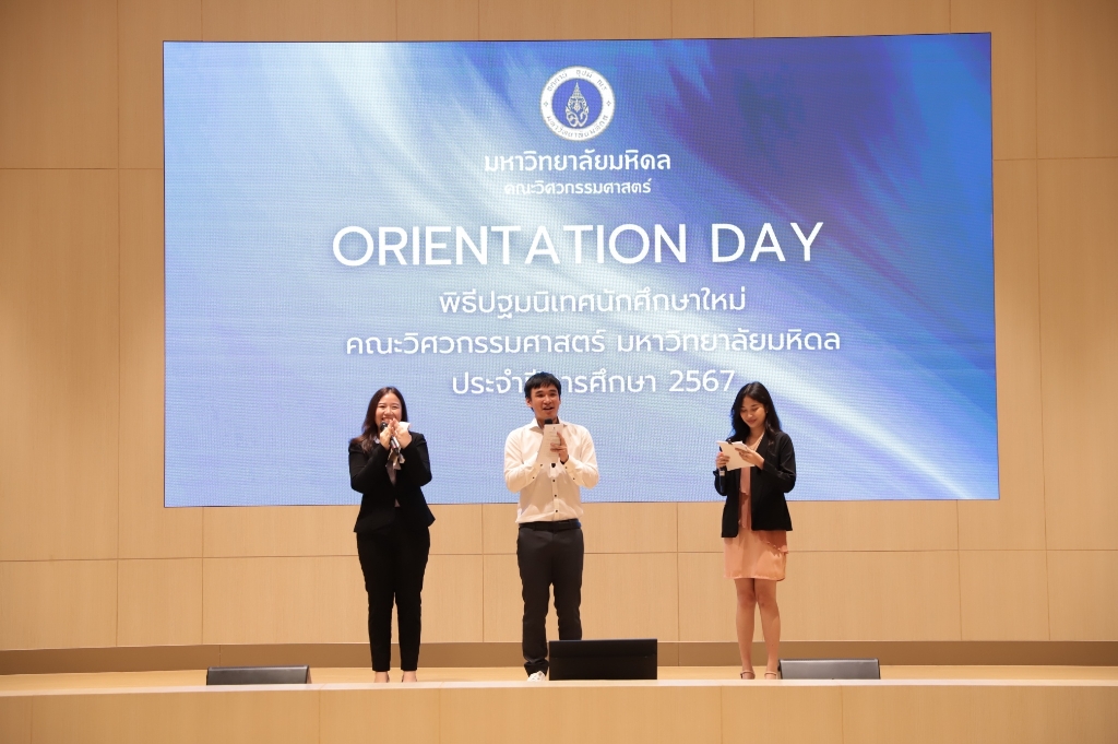 วันที่ 2 สิงหาคม 2567 คณะวิศวกรรมศาสตร์ มหาวิทยาลัยมหิดล นำโดย รศ.ดร.ธนภัทร์ วานิชานนท์ คณบดี พร้อมคณะผู้บริหาร และหัวหน้าภาควิชา ขึ้นกล่าวต้อนรับน้อง ๆ นักศึกษาใหม่ด้วยความอบอุ่นในงานปฐมนิเทศนักศึกษาใหม่ ปีการศึกษา 2567 ณ ห้องบรรยาย ศ.นพ.กษาน จาติกวนิช สำนักงานอธิการบดี มหาวิทยาลัยมหิดล ภายในงานมีการเสวนาในหัวข้อ "Dream Dare Do ฝัน กล้า ทำ" โดยรุ่นพี่ศิษย์เก่า ประกอบด้วย พี่เจนนิเฟอร์ อินเนส-เทเลอร์ ศิษย์เก่าคณะวิศวกรรมศาสตร์ สาขาวิชาวิศวกรรมชีวการแพทย์ รุ่นที่ 29 พี่ต้น พรพระ ชำนาญวนิชกุล ศิษย์เก่าคณะวิศวกรรมศาสตร์ สาขาวิชาวิศวกรรมไฟฟ้า รุ่นที่ 24 และ พี่ใหม่ เสาวลักษณ์ องอาจ ศิษย์เก่าคณะวิศวกรรมศาสตร์ สาขาวิชาวิศวกรรมอุตสาหการ รุ่นที่ 20 ที่มาแชร์ประสบการณ์ให้กับน้อง ๆ นอกจากนี้ยังมีกิจกรรม Ice Breaking และกิจกรรมแจกของรางวัลสุดพิเศษ และจุดถ่ายภาพ Photobooth ที่คณะฯ จัดเตรียมไว้ให้เก็บภาพเป็นที่ระลึก ซึ่งกิจกรรมในครั้งนี้นับว่าเป็นการต้อนรับน้อง ๆ เข้าสู่ครอบครัววิศวะมหิดลอย่างเป็นทางการ
