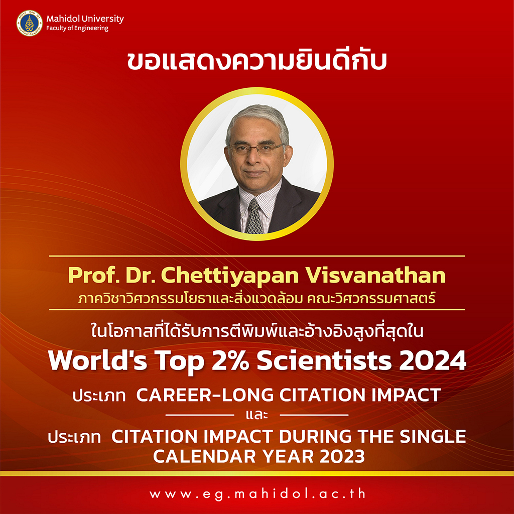 คณะวิศวกรรมศาสตร์ มหาวิทยาลัยมหิดล ขอแสดงความยินดีกับคณาจารย์และนักวิจัย ในโอกาสที่ได้รับการตีพิมพ์และอ้างอิงสูงที่สุดใน “World’s Top 2% Scientists” ประจำปี 2024 เป็นการจัดอันดับโดย Stanford University และ Elsevier โดยแบ่งเป็น Career-long และ Single Recent Year 2023 จำนวน 3 ท่าน ได้แก่