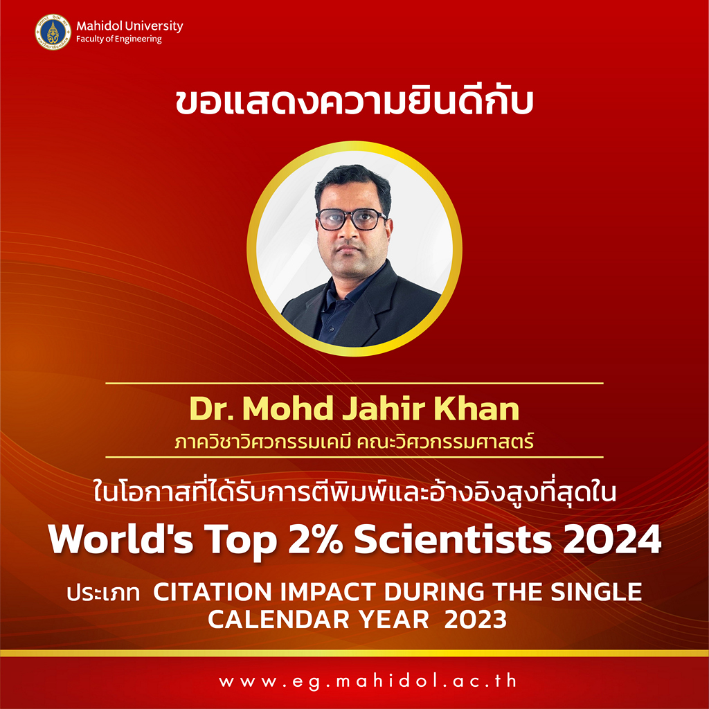 3. Dr. Mohd Jahir Khan นักวิจัยหลังปริญญาเอก ในความดูแลของ รศ.ดร. จุฬารัตน์ ศักดารณรงค์ (อาจารย์ประจำภาควิชาวิศวกรรมเคมี) ประเภท ผลกระทบการอ้างอิงเฉพาะปี ค.ศ. 2023 สูงที่สุด (citation impact during the single calendar year 2023)