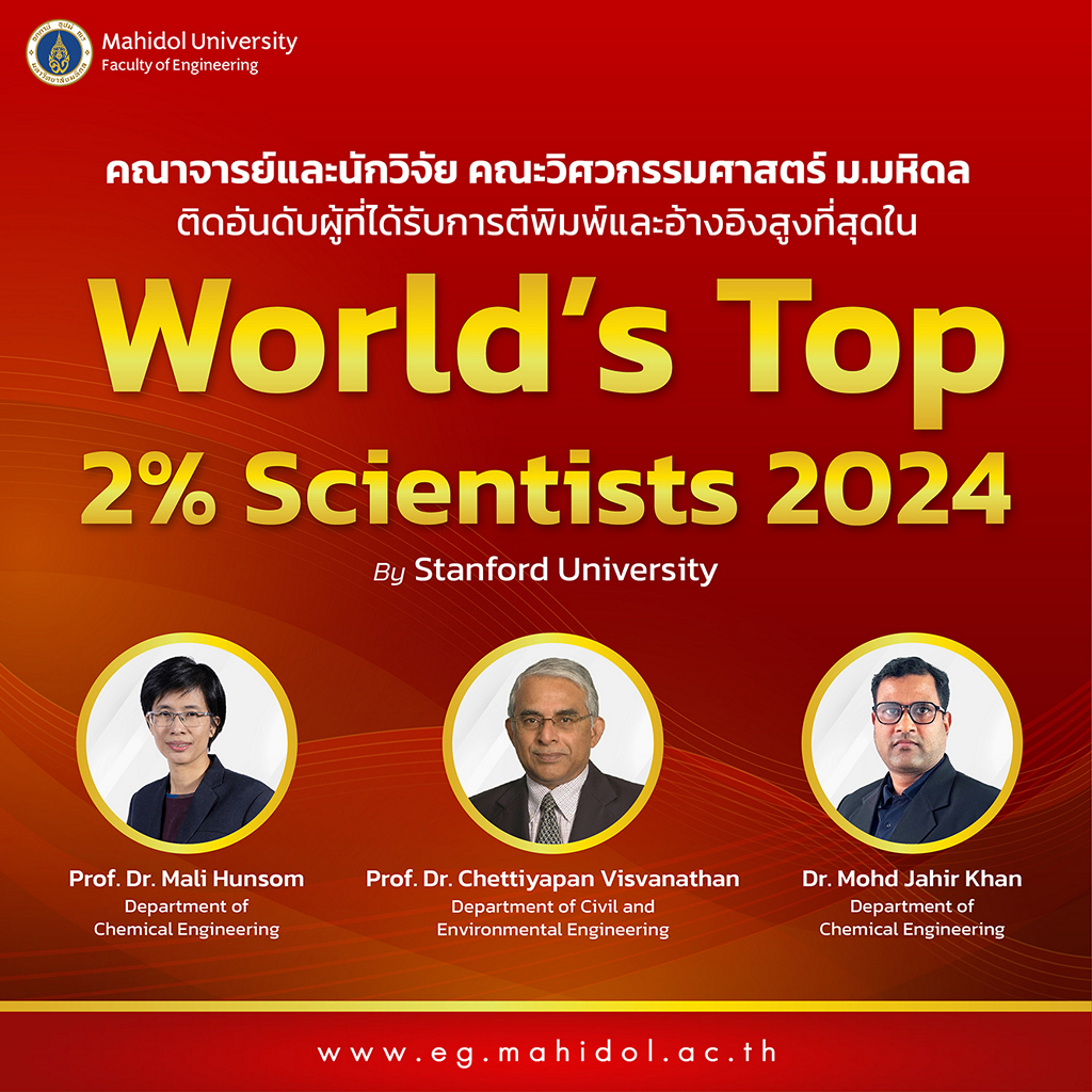 คณาจารย์และนักวิจัย คณะวิศวกรรมศาสตร์ ม.มหิดล ติดอันดับผู้ที่มีการอ้างอิงสูงที่สุดใน Top 2% ของโลก ประจำปี 2024