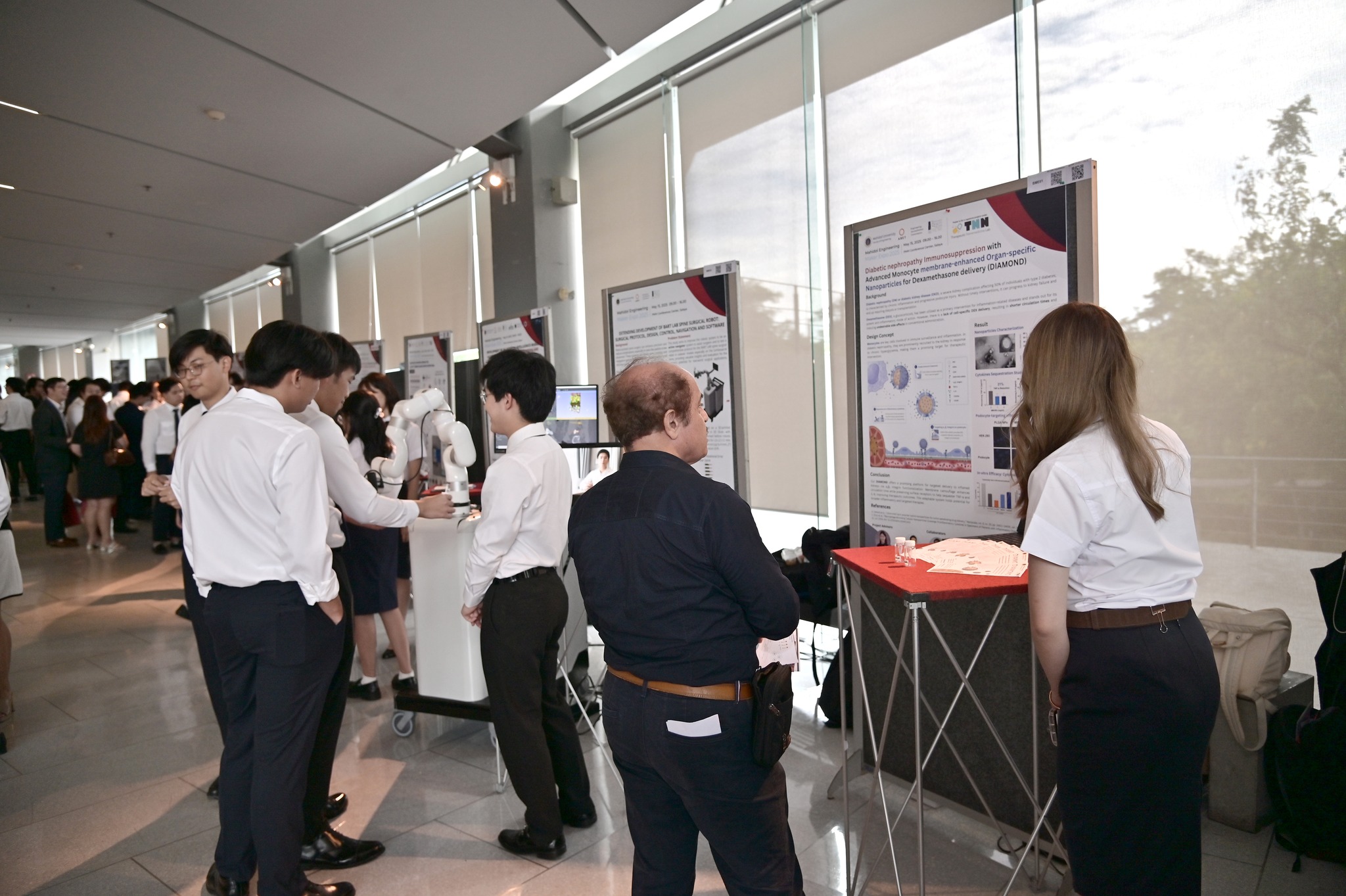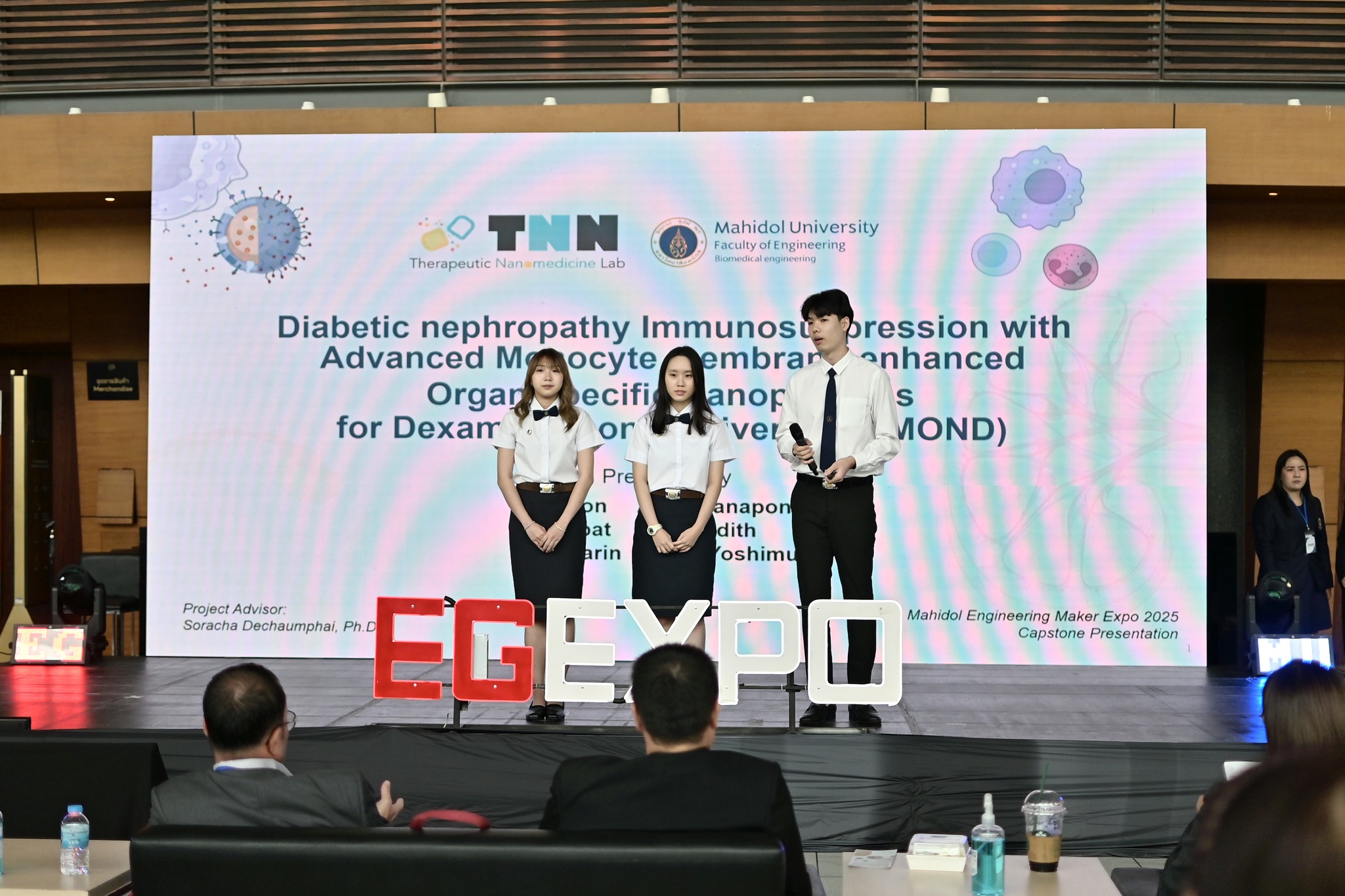 1.BME01 Diabetic Nephropathy Immunosuppression with Advanced Monocyte Membrane-enhanced Organ-specific Nanoparticles for Dexamethasone Delivery (diamond) การสังเคราะห์อนุภาคนาโนหุ้มด้วยเยื่อหุ้มเซลล์เม็ดเลือดขาวสำหรับการรักษาแบบมุ่งเป้าเพื่อผู้ป่วยโรคไตจากเบาหวาน โดยได้รับแรงบันดาลใจจากเซลล์ภูมิคุ้มกันในร่างกาย การหุ้มด้วยเยื่อหุ้มเซลล์เม็ดเลือดขาวช่วยลดอัตราการถูกกำจัดด้วยร่างกายทำให้คงอยู่ในกระแสเลือดนานขึัน นอกจากนี้ทีมวิจัยได้ดัดแปลงพื้นผิวของเยื่อหุ้มเซลล์เพื่อนำส่งยาไปยังเซลล์ไตอย่างแม่นยำ ลดการอักเสบ ลดผลข้างเคียงของยาและพัฒนาให้การรักษามีประสิทธิภาพมากยิ่งขึ้น