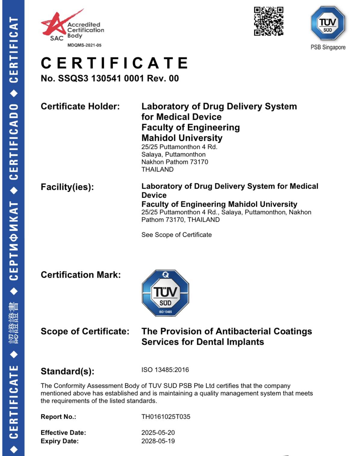 วันที่ 26 มิถุนายน 2568 – มหาวิทยาลัยมหิดล โดยคณะวิศวกรรมศาสตร์ สร้างโอกาสครั้งสำคัญของประเทศไทยในแวดวงวิศวกรรมชีวการแพทย์ เมื่อ “ห้องปฏิบัติการระบบส่งยาสำหรับเครื่องมือแพทย์” (Laboratory of Drug Delivery System for Medical Device) ผ่านการรับรองมาตรฐาน ISO 13485:2016 นับเป็นแห่งแรกในประเทศไทยและภูมิภาคอาเซียน ที่ได้รับการรับรองสำหรับการให้บริการเคลือบสารต้านเชื้อแบคทีเรียบนรากฟันเทียม ซึ่งเป็นนวัตกรรมที่เตรียมนำไปสู่การศึกษาในระดับคลินิก