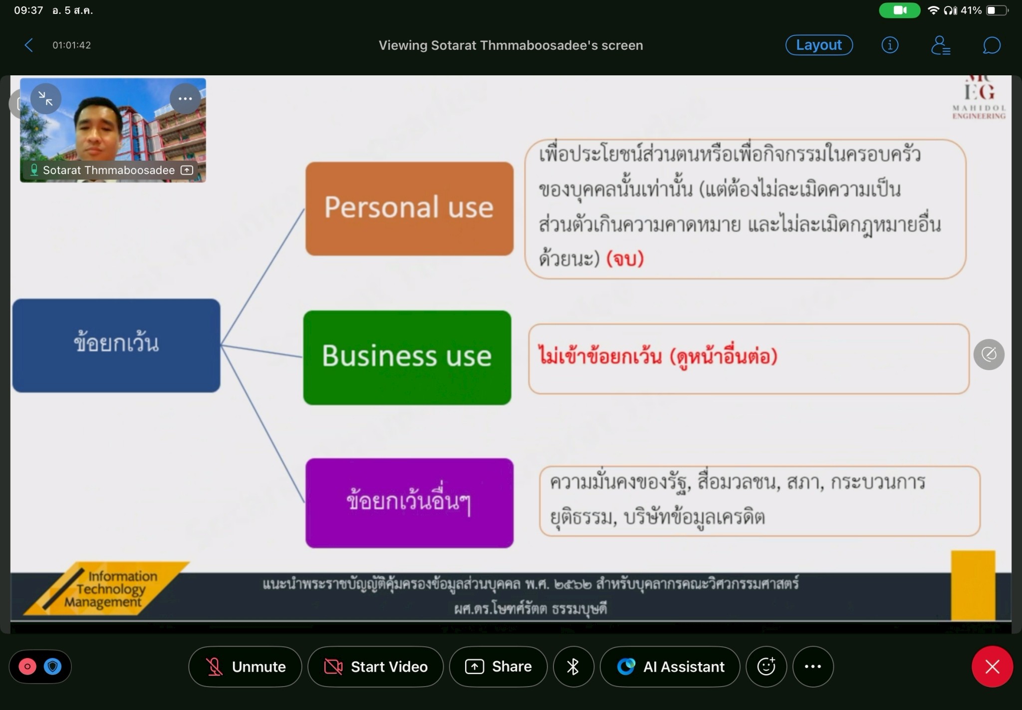 คณะกรรมการประสานงานด้านข้อมูลส่วนบุคคล คณะวิศวกรรมศาสตร์ มหาวิทยาลัยมหิดล จัดการอบรมให้ความรู้ด้านการคุ้มครองข้อมูลส่วนบุคคล (PDPA) แก่บุคลากรและนักศึกษาภายในคณะฯ เมื่อวันที่ 4–5 และ 7 สิงหาคม 2568 ณ ห้องประชุมผู้ช่วยศาสตราจารย์คณิต สงวนตระกูล ชั้น 1 อาคาร 1 คณะวิศวกรรมศาสตร์ โดยมี ผู้ช่วยศาสตราจารย์ ดร.โษฑศ์รัตต ธรรมบุษดี ผู้ช่วยคณบดีด้านการเปลี่ยนแปลงทางดิจิทัลขององค์กร เป็นวิทยากรในรูปแบบ Hybrid ทั้งออนไลน์และออนไซต์