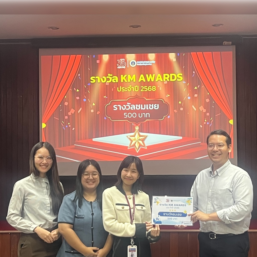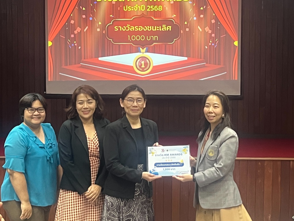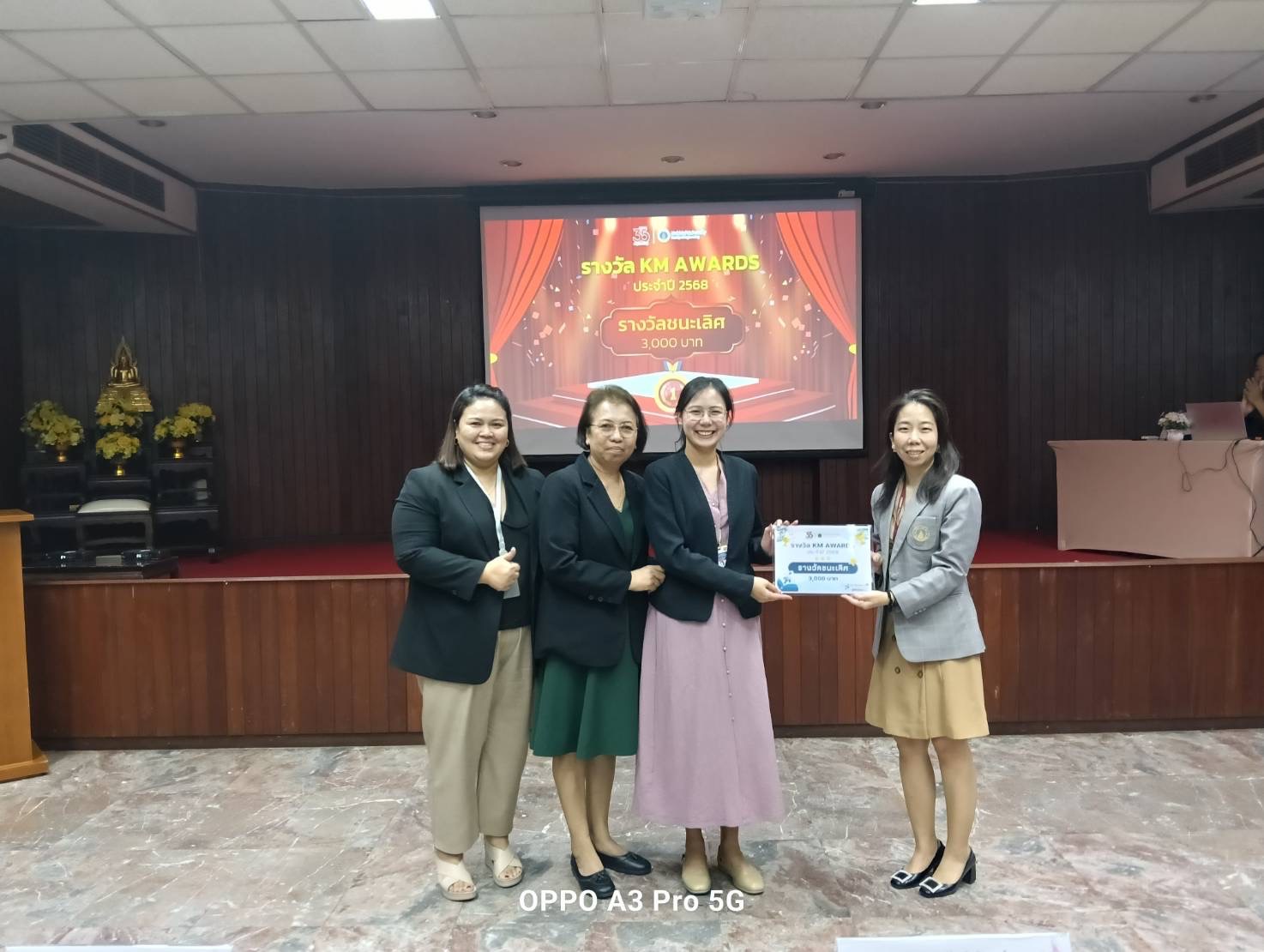 ภายหลังการนำเสนอผลงาน มีพิธีมอบรางวัล KM Awards ประจำปี 2568 เพื่อเชิดชูเกียรติและสร้างกำลังใจแก่บุคลากร โดยรางวัลผลงานยอดเยี่ยม ที่ได้รับรางวัลชนะเลิศ รับเงินรางวัล 3,000 บาท ได้แก่ ผลงาน การประยุกต์ใช้ปัญญาประดิษฐ์เพื่อเพิ่มประสิทธิภาพในการจัดทำรายงานการประชุม นำเสนอโดย ทีมงานบริหารงานทั่วไป คุณสายฝน โพธิ์ไพจิตร คุณเรไร หาญวงศ์ และคุณนภาพร วิรอด รางวัลรองชนะเลิศ รับเงินรางวัล 1,000 บาท ได้แก่ ผลงาน การพัฒนาโปรแกรมสำหรับจัดทำรายงานเงินคงเหลือประจำวันและสมุดรายวันทั่วไป นำเสนอโดย คุณอรุณี กอสวัสดิ์พัฒน์ คุณอรนุชา อภิบุญญาวรกุล คุณวรจรรย์ ไวยวาศ และคุณพิทวัส ทิวทิพย์สกุล รางวัลชมเชย 3 รางวัล รับเงินรางวัลละ 500 บาท ได้แก่ ผลงาน น้องใจเย็น... เพราะทุกเรื่องของพนักงาน คือเรื่องของเรา นำเสนอโดย คุณศิรินทิพย์ ฤทธิศักดิ์ คุณมนัสนันท์ หัตถา คุณสโรชา สุทธิวงศ์ และคุณพิทวัส ทิวทิพย์สกุล ผลงาน การพัฒนาโปรแกรมประยุกต์บนเว็บสำหรับงานคลังสารเคมีด้วยปัญญาประดิษฐ์และระบบอัตโนมัติ (AI and Automation) นำเสนอโดย คุณชลธร กินแก้ว คุณเพ็ญพิชชา แจ่มจันทร์ และคุณภานุวัฒน์ โขดานุ และผลงาน TCAS Dashboard การพัฒนาระบบวิเคราะห์คุณภาพนักศึกษาเพื่อวางแผนเชิงกลยุทธ์ด้านการรับเข้า นำเสนอโดย คุณนัทธ์หทัย แก้วงาม คุณปธิตา เจริญธนะจินดา คุณชาลิสา รัตนวงศ์ และคุณพรชิตา ภิรมย์เมือง