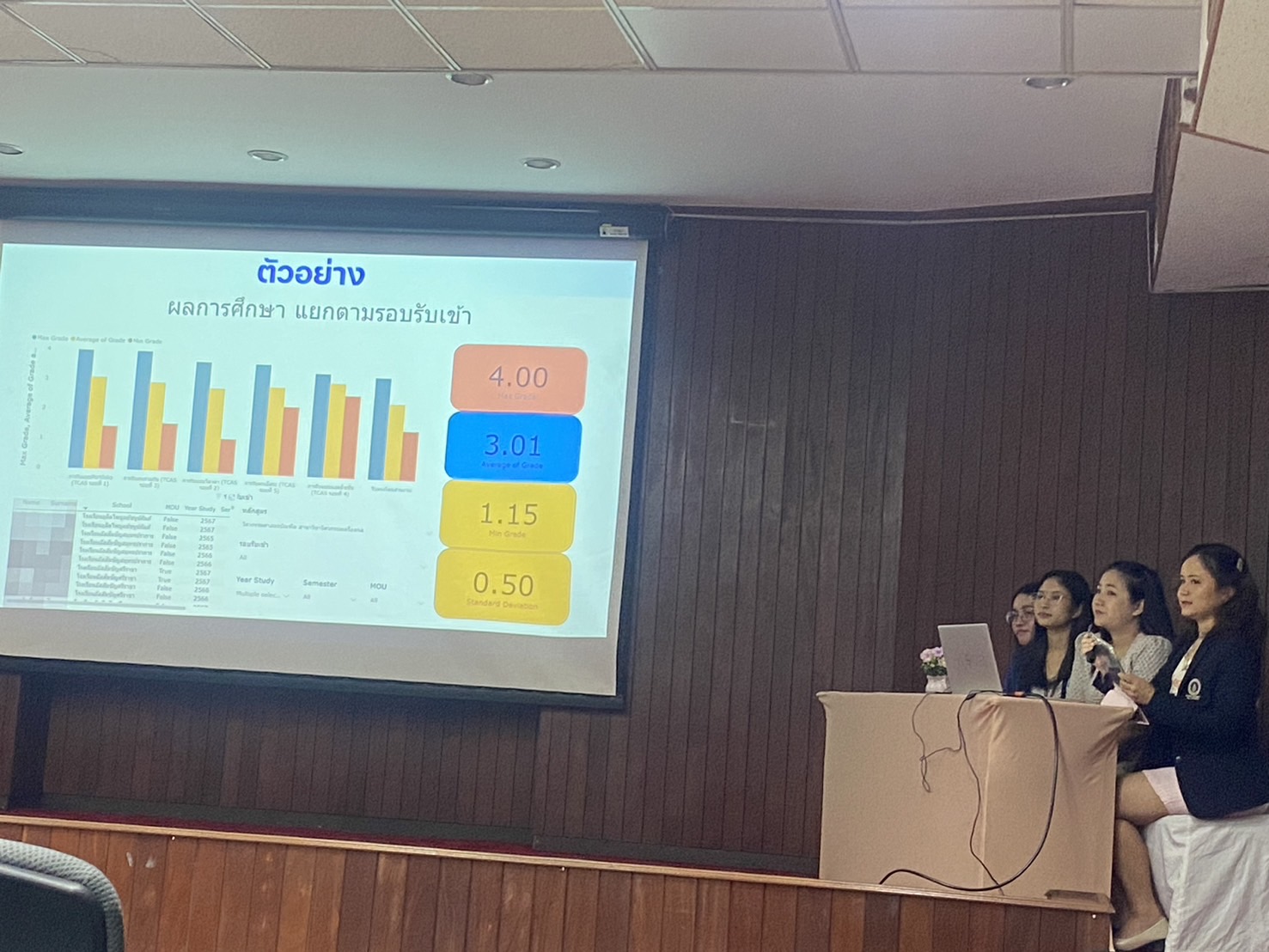 3.3 ผลงาน TCAS Dashboard การพัฒนาระบบวิเคราะห์คุณภาพนักศึกษาเพื่อวางแผนเชิงกลยุทธ์ด้านการรับเข้า นำเสนอโดย คุณนัทธ์หทัย แก้วงาม คุณปธิตา เจริญธนะจินดา คุณชาลิสา รัตนวงศ์ และคุณพรชิตา ภิรมย์เมือง