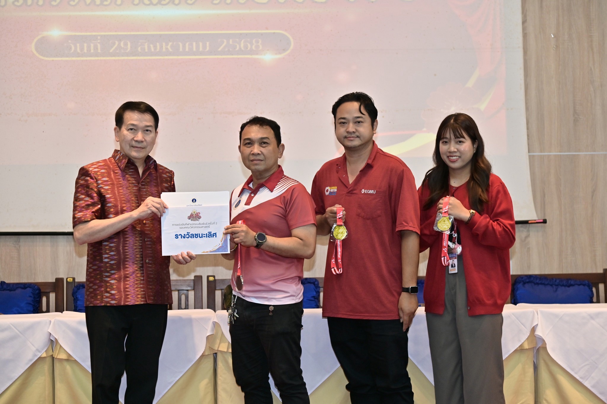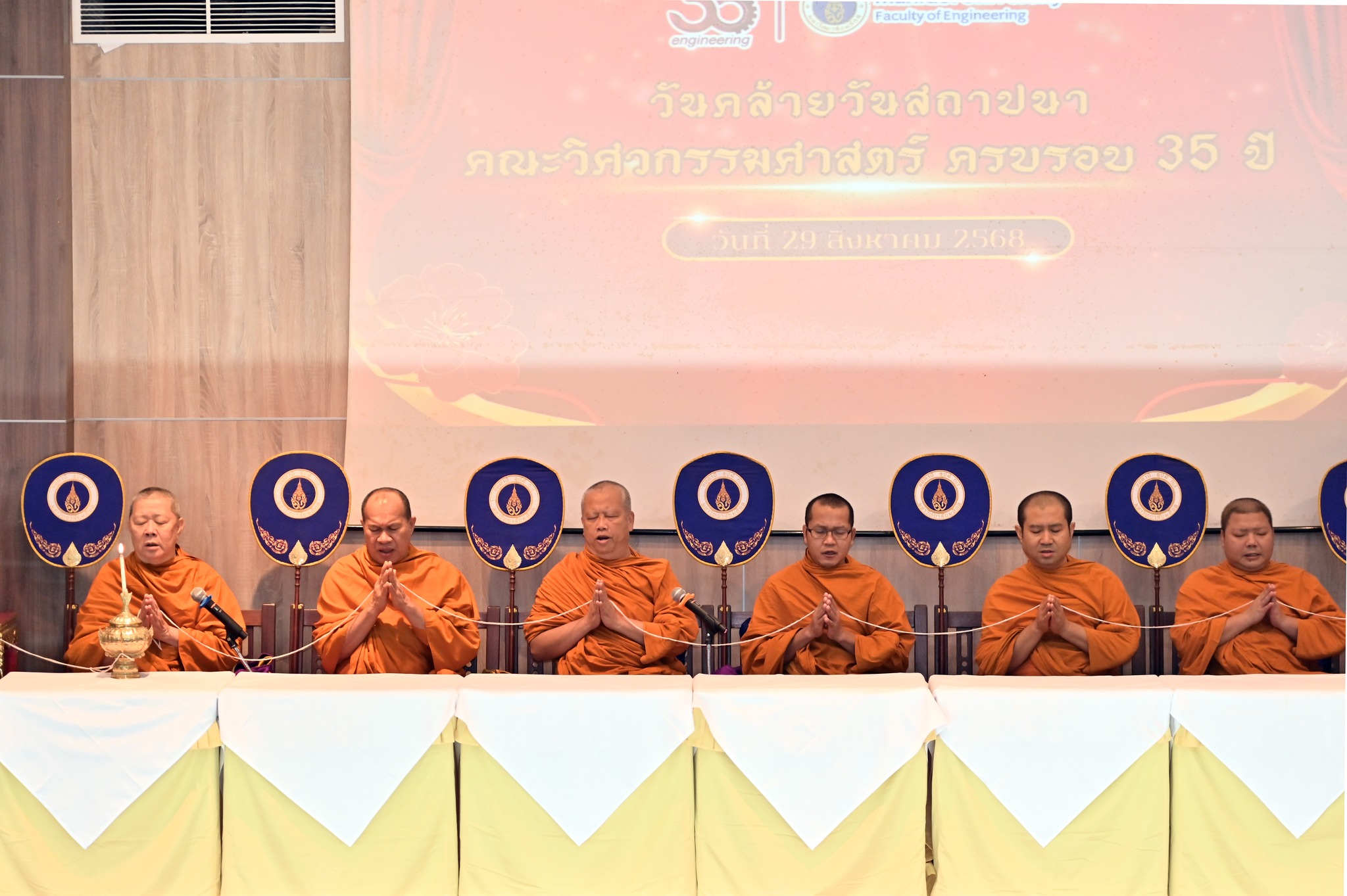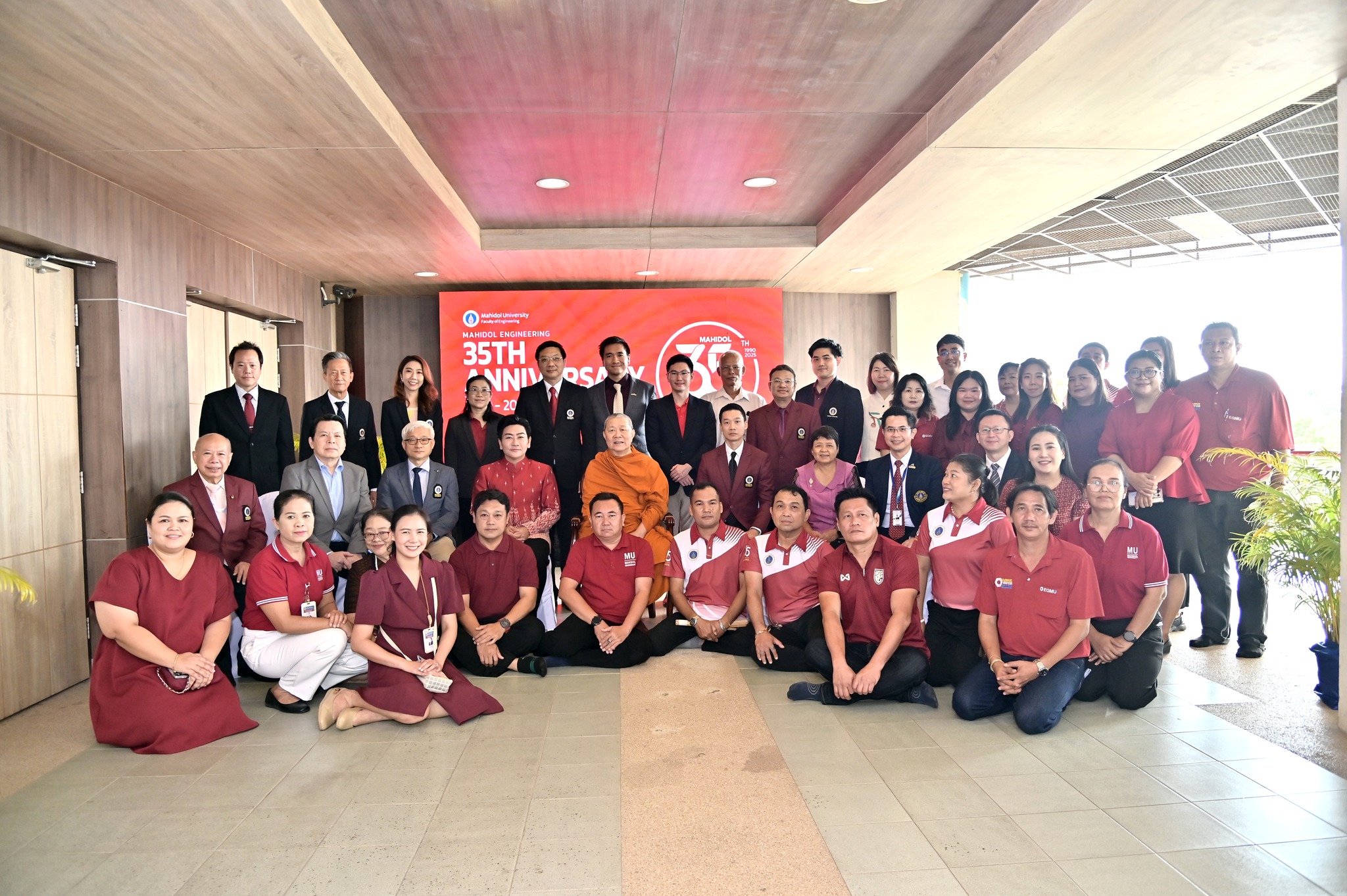 ภายในงานช่วงเช้ามีการสักการะสิ่งศักดิ์สิทธิ์ภายในมหาวิทยาลัย พิธีสงฆ์ โดยได้รับความเมตตาจาก สมเด็จพระมหารัชมงคลมุนี (เจ้าคุณธงชัย) เจ้าคณะใหญ่หนกลาง ผู้ช่วยเจ้าอาวาสวัดไตรมิตรวิทยารามวรวิหาร พร้อมพระสงฆ์ 9 รูป เจริญพระพุทธมนต์ และประกอบพิธีถวายภัตตาหารเพลและจตุปัจจัยไทยทาน เจริญชัยมงคลคาถา และประพรมน้ำพระพุทธมนต์ และได้รับเกียรติจาก ศาสตราจารย์ นพ.ปิยะมิตร ศรีธรา อธิการบดีมหาวิทยาลัยมหิดล บรรยายพิเศษในหัวข้อ “35 Years of Engineering Excellence and Synergy: Driving Innovation and Delivering Real-World Impact” โดยมี ศาสตราจารย์ นพ.ปิยะมิตร ศรีธรา อธิการบดีมหาวิทยาลัยมหิดล ให้เกียรติมอบรางวัล อาจารย์ตัวอย่างคณะวิศวกรรมศาสตร์ มหาวิทยาลัยมหิดล ระดับส่วนงาน และระดับหน่วยงาน เกียรติบัตรคณะกรรมการที่ปฏิบัติหน้าที่ คณะกรรมการตรวจประเมินการศึกษาระดับหลักสูตรภายในส่วนงาน เกียรติบัตรกีฬาบุคลากร มหาวิทยาลัยมหิดล ประจำปี 2568 การแข่งขันกีฬาบุคลากรมหาวิทยาลัยแห่งประเทศไทย (ตุมปังเกมส์) และเหรียญรางวัล การแข่งขัน EG เปตองสัมพันธ์ ครั้งที่ 2