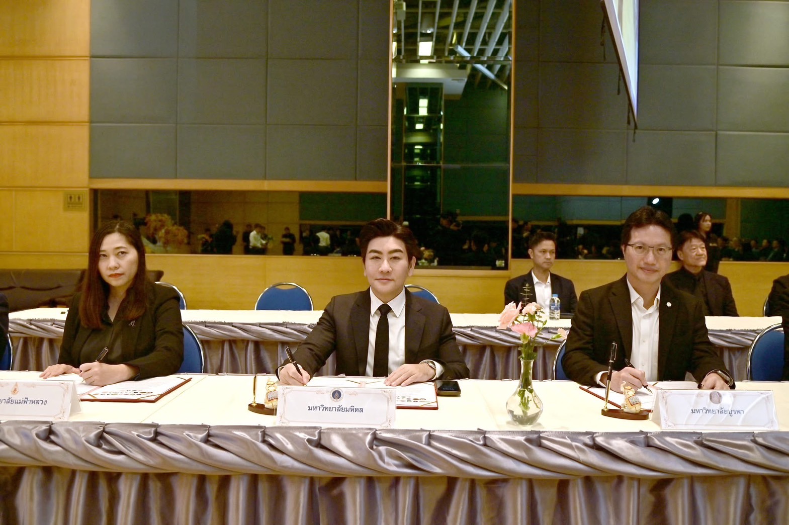 วันที่ 14 พฤศจิกายน 2568 รองศาสตราจารย์ ดร.ธนภัทร์ วานิชานนท์ คณบดี คณะวิศวกรรมศาสตร์ มหาวิทยาลัยมหิดล ในฐานะผู้แทนอธิการบดีมหาวิทยาลัยมหิดล เข้าร่วมพิธีลงนามบันทึกข้อตกลงความร่วมมือทางวิชาการในการส่งเสริมและสนับสนุนทางวิชาการด้านไมโครอิเล็กทรอนิกส์ ร่วมกับ สมาคมการค้าอุตสาหกรรมไทยเซมิคอนดักเตอร์ (THSIA), สำนักงานปลัดกระทรวงการอุดมศึกษา วิทยาศาสตร์ วิจัยและนวัตกรรม (สปอว.), สำนักงานการวิจัยแห่งชาติ (วช.) และ 19 สถาบันการศึกษา ณ อาคารนวมินทรราชินี มหาวิทยาลัยเทคโนโลยีพระจอมเกล้าพระนครเหนือ