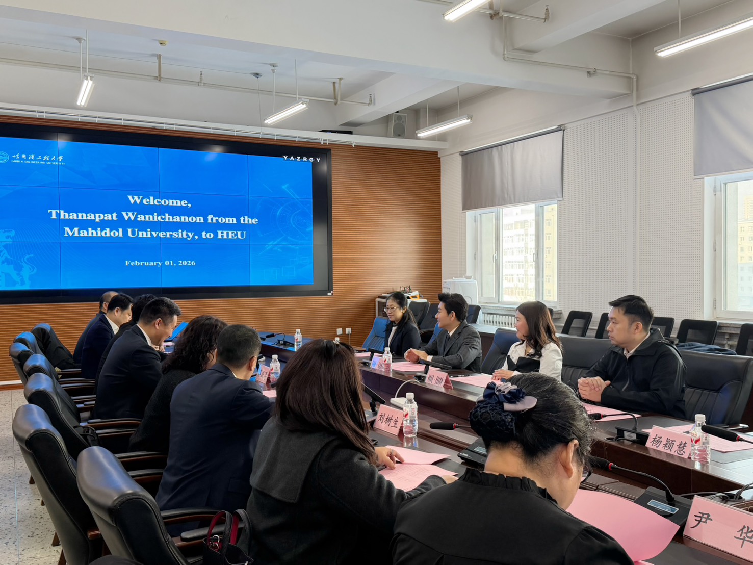 วันที่ 2 กุมภาพันธ์ 2569 คณะวิศวกรรมศาสตร์ มหาวิทยาลัยมหิดล นำโดย รองศาสตราจารย์ ดร.ธนภัทร์ วานิชานนท์ คณบดี พร้อมคณะผู้บริหาร ประกอบด้วย ผู้ช่วยศาสตราจารย์ ดร.ภัทรพร โปสกนิษฐกุล รองคณบดีฝ่ายวิเทศสัมพันธ์และสื่อสารองค์กร ผู้ช่วยศาสตราจารย์ ดร.วศพร เตชะพีรพานิช รองคณบดีฝ่ายวิชาการและกิจการนักศึกษา และ รองศาสตราจารย์ ดร.ธีรพันธ์ อรธรรมรัตน์ หัวหน้าภาควิชาวิศวกรรมโยธาและสิ่งแวดล้อม เดินทางเยือน Harbin Engineering University (HEU) สาธารณรัฐประชาชนจีน เพื่อร่วมพิธีลงนามบันทึกความตกลงทางวิชาการ (MOA) กับ College of Intelligent Systems Science and Engineering, HEU