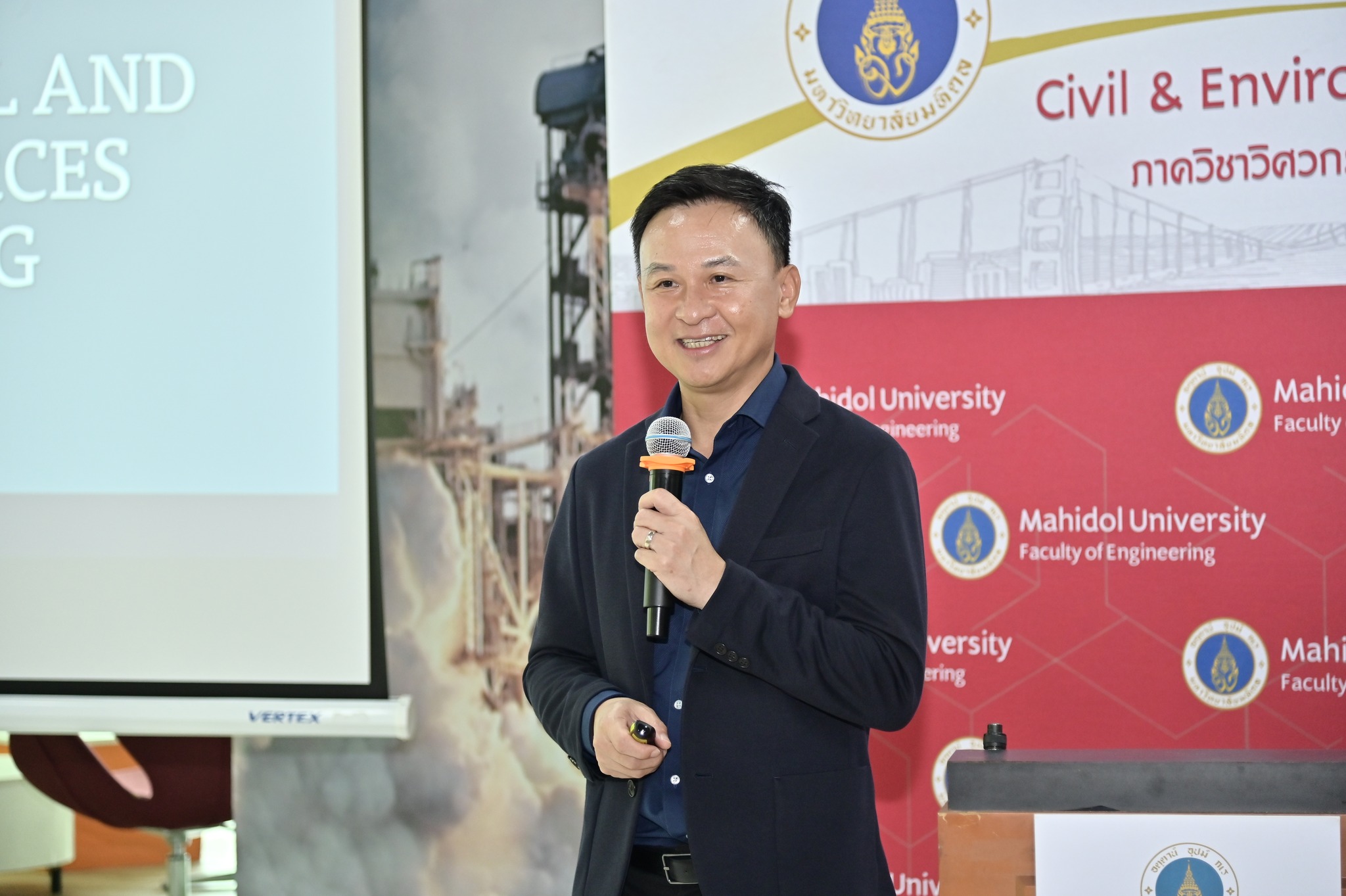 The program began with a video message from Associate Professor Dr. Thanapat Wanichanon, Dean of the Faculty of Engineering, followed by welcome remarks from Associate Professor Dr. Teraphan Ornthammarath, Head of the Department of Civil and Environmental Engineering. Faculty members responsible for the graduate program also introduced the curriculum and provided academic guidance for the students.