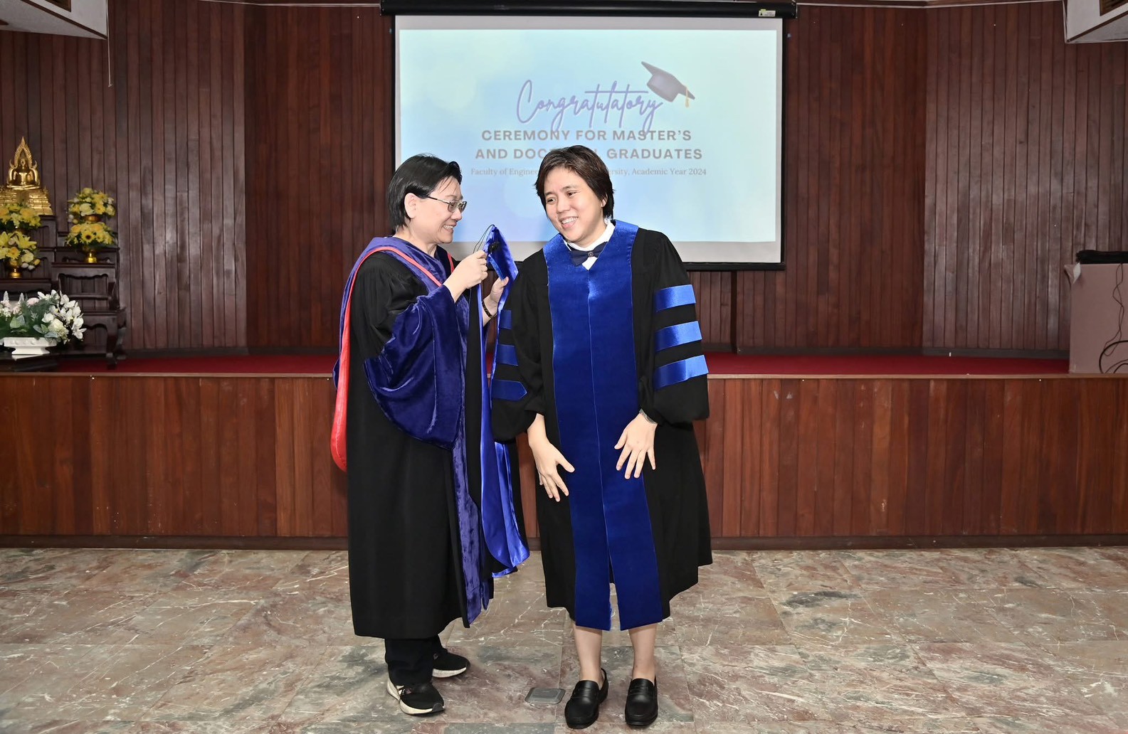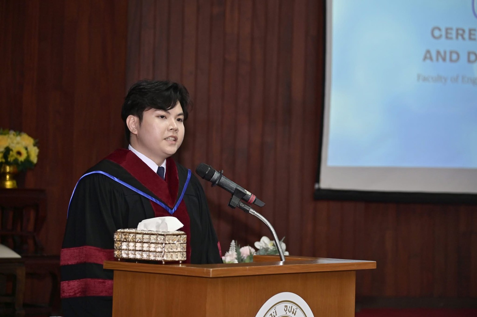 The ceremony was led by Associate Professor Dr. Thanapat Wanichanon, Dean of the Faculty of Engineering, who delivered congratulatory remarks and words of encouragement to the graduates. Assistant Professor Dr. Wasaporn Techapeeraparnich, Deputy Dean for Academic and Student Affairs, also addressed the gathering, outlining the objectives of the event and extending her congratulations to all graduates.