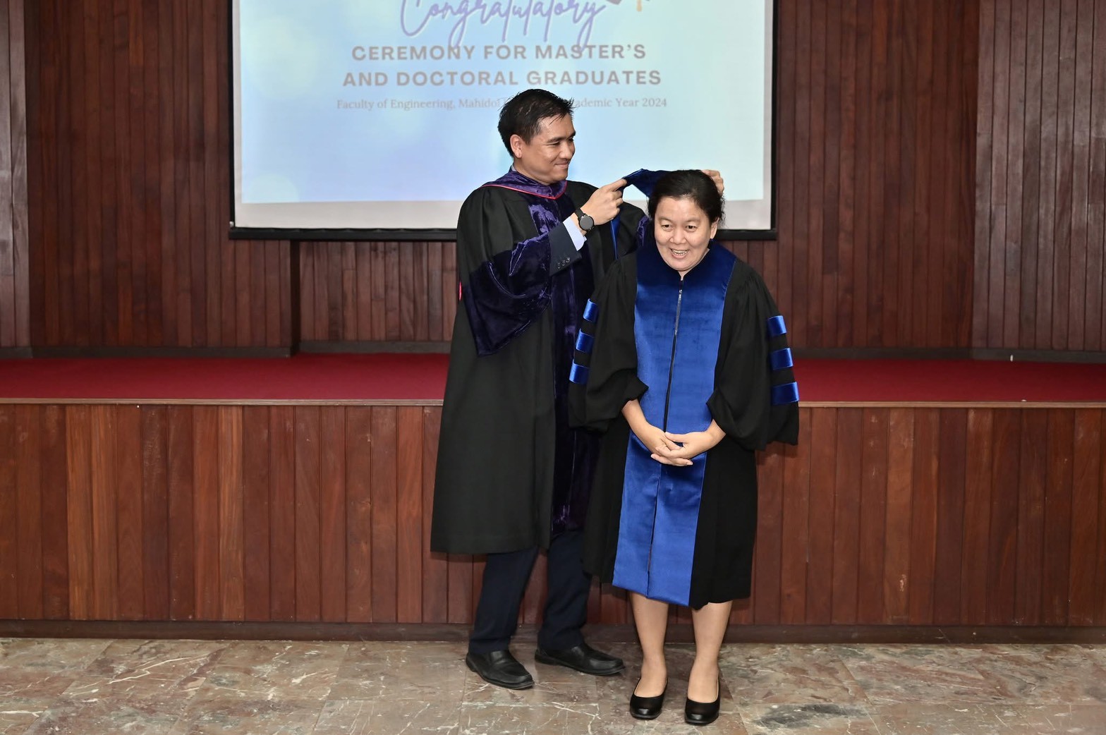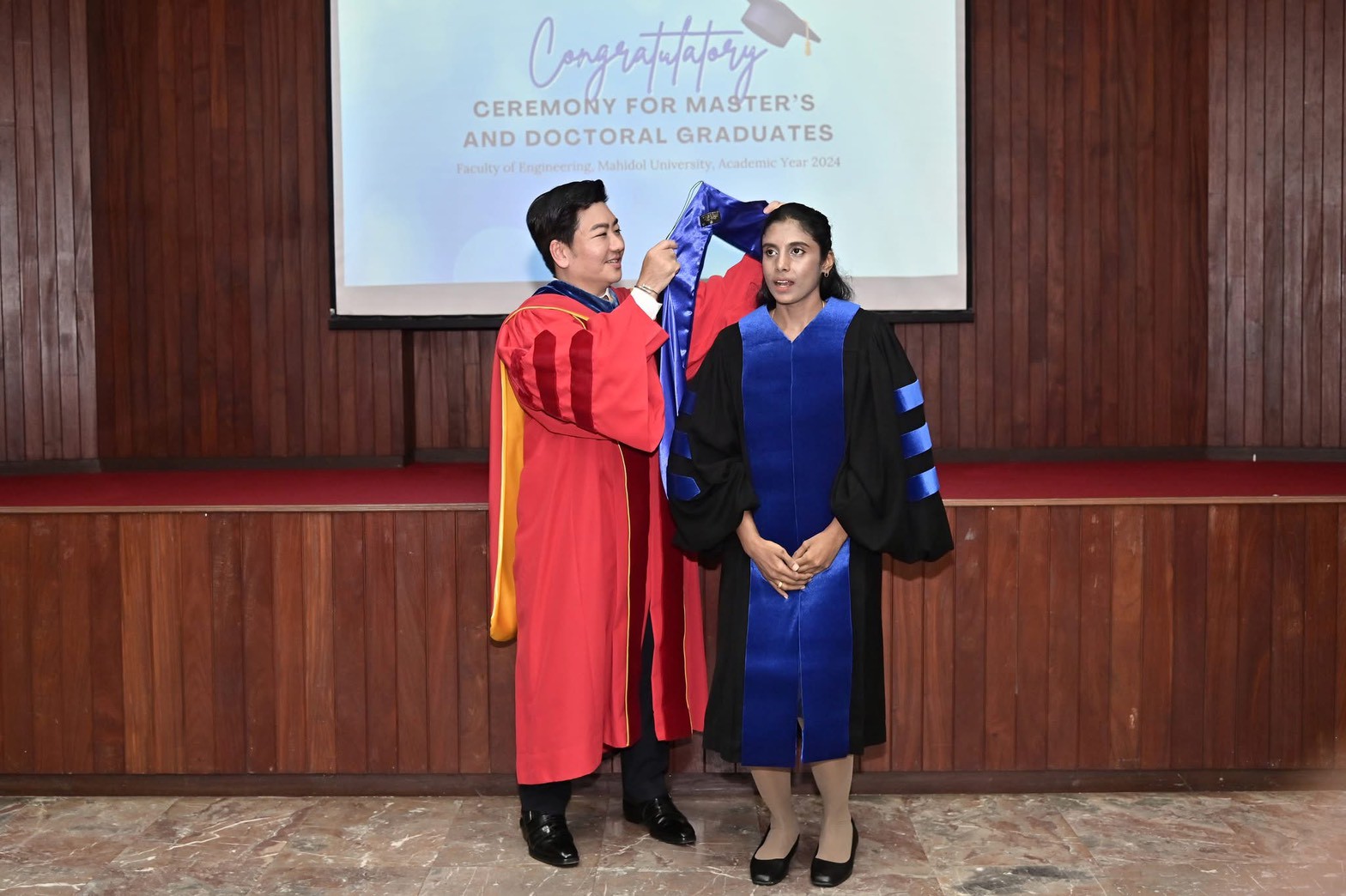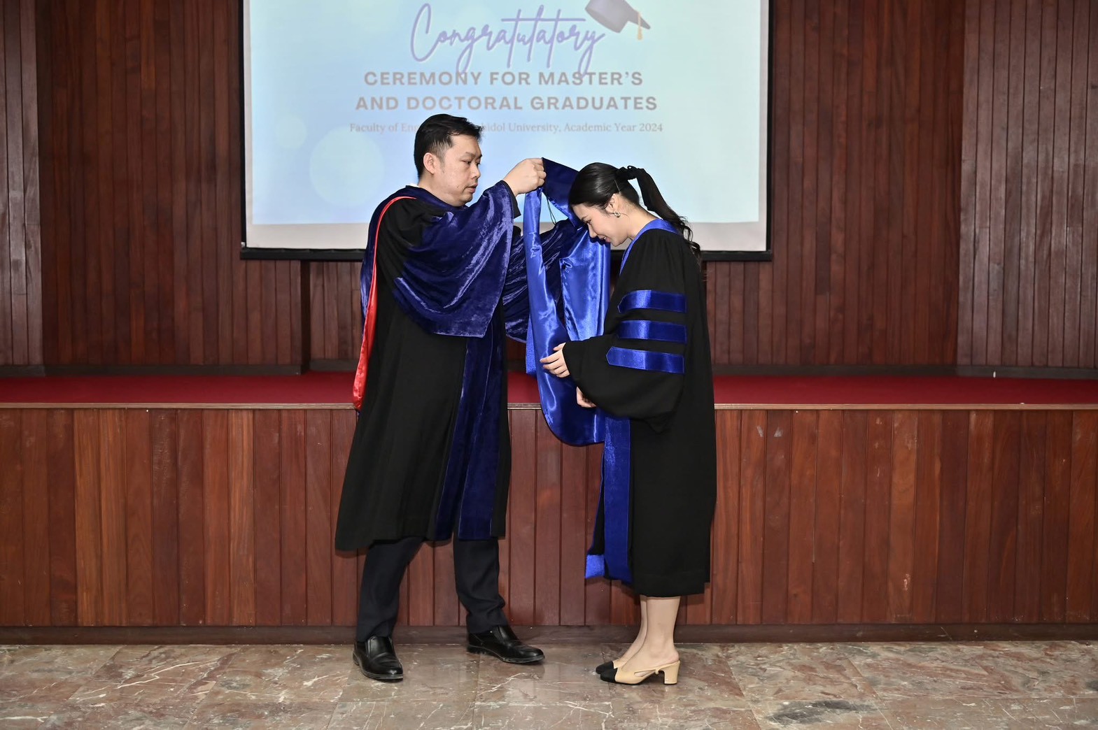 On October 3, 2025, the Faculty of Engineering, Mahidol University, held a Congratulatory Ceremony for Master’s and Doctoral graduates of Academic Year 2024 in Meeting Room R114, Building 1. The event was attended by faculty executives, professors, and distinguished guests, who gathered to honor the graduates’ achievements in an atmosphere of pride and warmth.