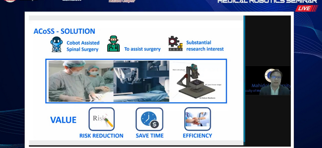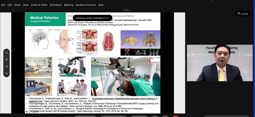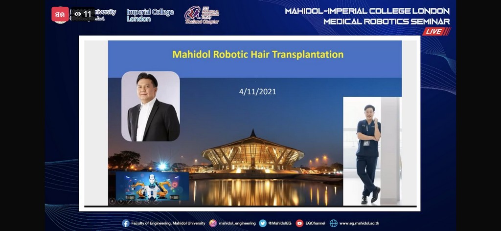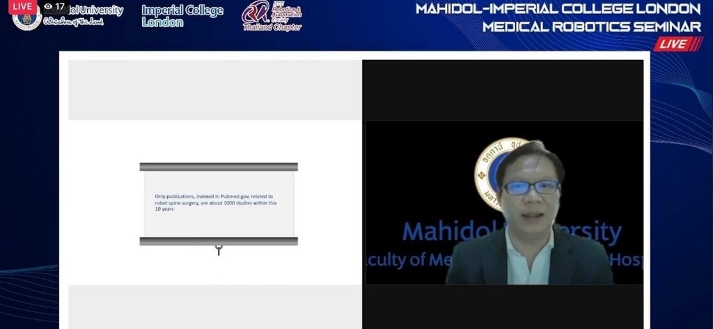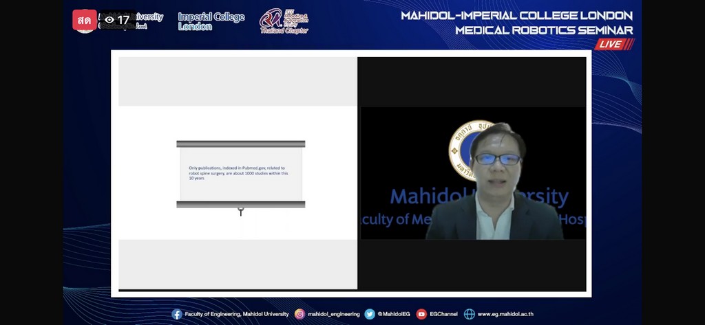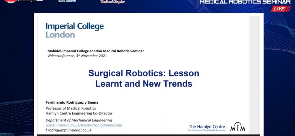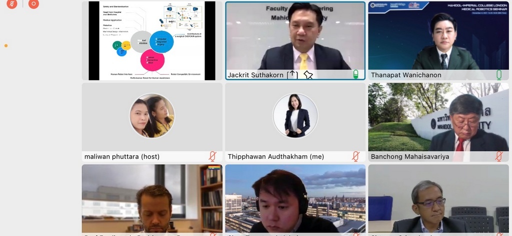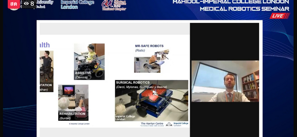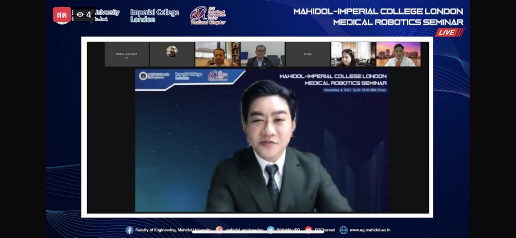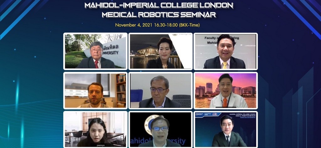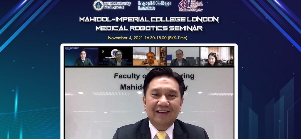 This seminar was organized by Mahidol University, Imperial College London, UK, and IEEE Robotics & Automation Society Thailand Chapter to exchange knowledge and create collaboration opportunities in education, research, and innovation in engineering and medicine. This is to promote and develop excellence in Medical Robotics, create sustainability, and increase national competitiveness as a response to the policy of the ‘Reinventing University’ project of the Ministry of Higher Education, Science, Research and Innovation. It pushes forward the strategic group to develop professionals and create specialized fields in medical robotics at Mahidol University and across the country.