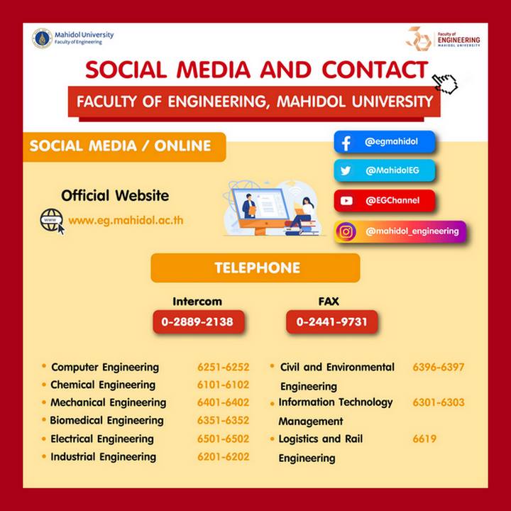 Our campus is part of Mahidol University Salaya campus located in Phuttamonthon District, Nakhon Pathom Province. All tours and campus visits for prospective students, guests, and groups are coordinated through the Faculty of Engineering, Mahidol University.